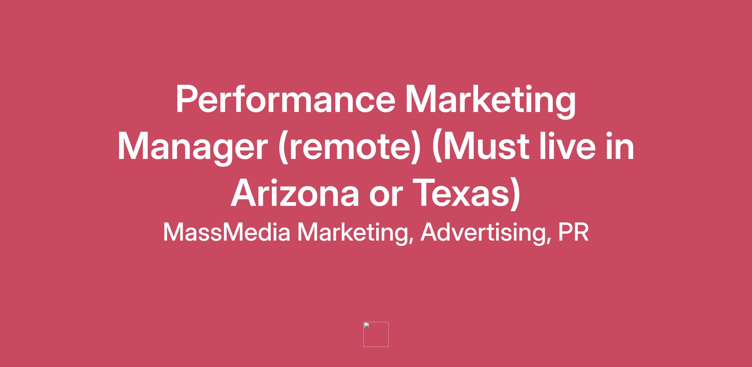 Performance Marketing ManagerMassMedia is a women-owned, digital-first marketing, advertising, and PR agency headquartered in Las Vegas, NV, serving growth-oriented brands nationwide. For nearly 30 years, we’ve helped category-leading consumer, hospitality, healthcare, and regulated-industry brands scale through integrated strategy, creative excellence, and performance-driven marketing.We are a high-accountability, fast-moving team that values ownership, curiosity, and results. Collaboration is core to how we work, and we expect our marketers to think like operators—grounded in data, focused on outcomes, and accountable to performance.We are seeking a Performance Marketing Manager to lead execution and optimization across both MassMedia’s internal marketing engine and select client campaigns. This role is responsible for driving the team to performance - translating strategy into action—owning channel performance, driving demand, and ensuring MassMedia and our clients show up with clarity, consistency, and impact across digital touchpoints.This is a hands-on role for a highly organized, execution-oriented marketer who thrives in variety, enjoys cross-functional collaboration, and is motivated by measurable growth. You will work closely with the CEO and CMO and partner across paid media, PR, social, and creative teams to drive performance.Compensation: Base salary range of $70,000 -$75,000 annually, commensurate with experience.What You’ll Do Own and execute MassMedia’s internal performance marketing strategy, ensuring brand consistency and growth across all channels. Manage and optimize website performance, email marketing, paid media, CRM campaigns, and digital funnels to drive engagement, leads, and conversions. Execute performance-driven marketing initiatives for select client accounts in collaboration with paid media, creative, PR, and strategy teams. Plan and support agency events, sponsorships, and community activations with clear goals, tracking, and ROI. Develop high-impact presentations, case studies, and thought-leadership assets that clearly communicate MassMedia’s value and results. Partner with leadership on brand campaigns, award submissions, PR initiatives, and market positioning. Coordinate timelines, deliverables, and workflows across internal teams and external vendors to ensure on-time, high-quality execution. Track, analyze, and report on performance metrics, using data and insights to continuously optimize campaigns and improve outcomes.Why You’ll Love Working HereA culture that values curiosity, creativity, and professional growth.Opportunity to directly impact the brand of one of the Southwest’s top integrated agencies.Competitive pay, benefits, and career development opportunities.A fun, supportive, and collaborative team environment that celebrates bold ideas and big wins. Fully Remote - Travel 1x per month to corporate office in Las Vegas, NevadaBachelor’s degree in Marketing, Communications, or related field.4–6 years of marketing experience, preferably in an agency or professional services setting.Strong organizational and project-management skills; comfortable managing multiple priorities.Comfortable holding people accountable and driving the teams to performance.Excellent writing, communication, and presentation abilities.Proficiency with CRM/marketing automation platforms and project-management tools.Creative thinker with a strong sense of brand and visual storytelling.Self-starter with a collaborative spirit and growth mindset. At MassMedia, we pride ourselves on hiring top talent and we work hard to provide benefits that make our team members lives better.Our comprehensive compensations and benefits program includes:Competitive salaries and opportunity for advancement; we always strive to promote from within!Medical, dental and vision plans for you and your family and financial protection options through disability, life, accidental death, cancer assist, critical illness, and medical bridge insurance401(k) plan with company matching programGenerous paid time off policy that increases each year you are with the companyEleven (11) paid holidays and we pay you to take your birthday off!Frequent company happy hours, events and team building activitiesProfessional development opportunities