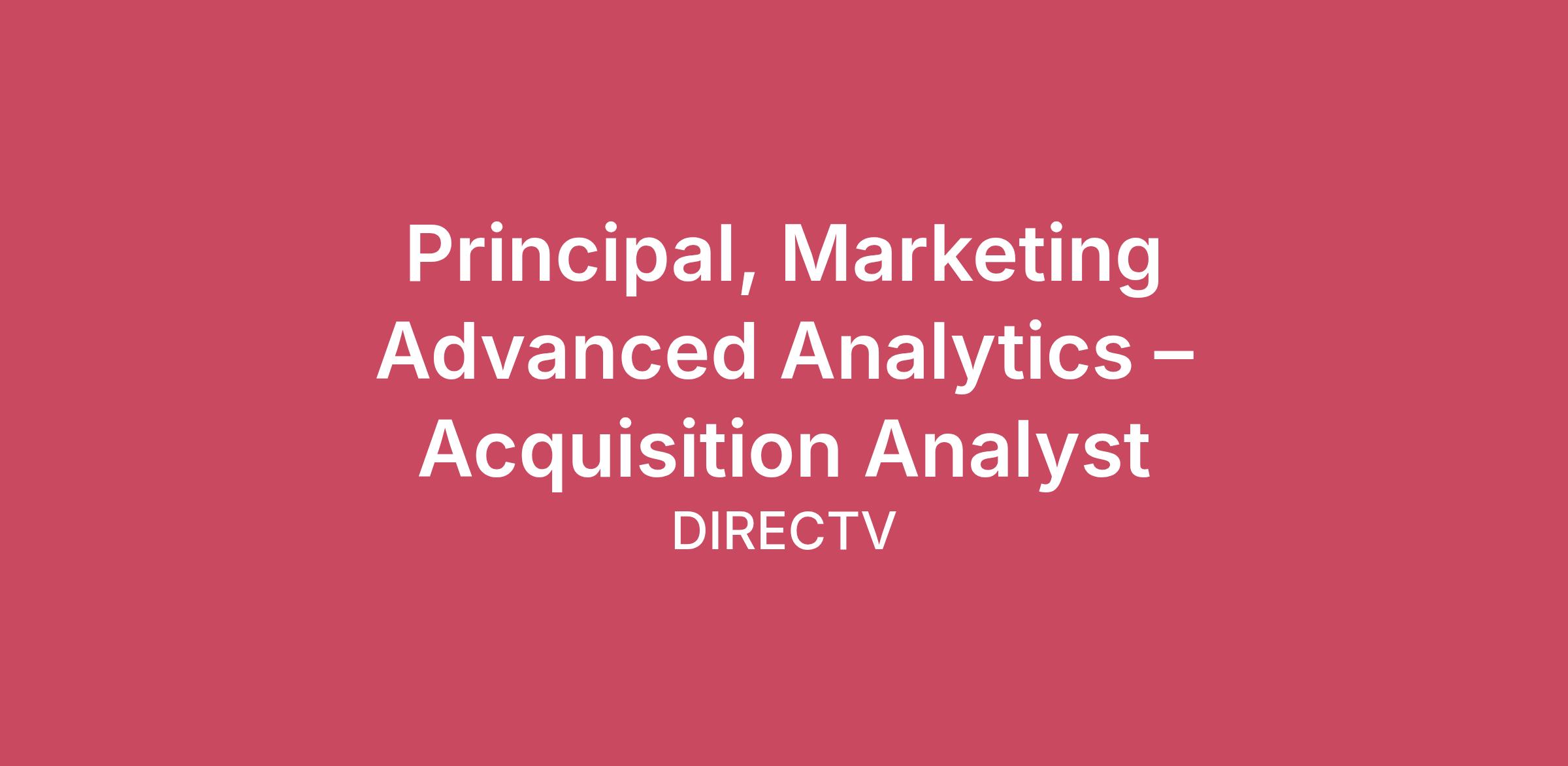 DIRECTV is evolving its position in the entertainment ecosystem through a multi-year Super-Aggregation strategy that blends live TV, premium SVODs, and flexible content packaging. As the company modernizes its acquisition engine, advanced analytics is critical to driving scalable new subscriber growth.The Principal, Marketing Advanced Analytics is a senior technical leader responsible for defining and executing the analytical strategy that powers customer acquisition performance. This role focuses on optimizing marketing-driven subscriber growth through predictive modeling, advanced measurement, experimentation, and AI-enabled targeting.This leader combines deep expertise in machine learning, data science, and experimentation with strong cross-functional influence to elevate DIRECTV’s acquisition analytics into a best-in-class growth engine.Key Responsibilities:Acquisition Inflow Analytics StrategyLead the enterprise-wide analytics strategy supporting new subscriber acquisition across all acquisition channels.Develop and enhance predictive models for offer lift measurement, conversion propensity, and customer prioritization.Partner with channel owners and acquisition strategy teams to translate insights into targeted campaign optimizations and performance improvements.Identify scalable growth levers to accelerate subscriber acquisition.Advanced Measurement & Marketing EffectivenessDesign rigorous experimentation frameworks and advanced marketing measurement methodologies (e.g., causal inference, incrementality testing, multi-touch attribution).Establish standards for controlled experimentation and test-and-learn governance across digital and offline channels.Improve precision in performance reporting by isolating true incremental drivers.Evaluate and operationalize emerging measurement methodologies to strengthen decision accuracy.AI & Machine Learning EnablementLead AI transformation amongst acquisition analytics.Integrate machine learning into acquisition decisioning, audience targeting, media optimization, and next-best-action frameworks.Partner with Data Engineering and MarTech to enable scalable data pipelines and automated optimization capabilities.Deploy advanced modeling approaches such as uplift modeling, dynamic audience segmentation, and conversion optimization frameworks.Ensure models are robust, interpretable, and production-ready within DIRECTV’s marketing ecosystem.Strategic Insight & Executive InfluenceTranslate complex analytical findings into actionable recommendations that influence campaign strategy, targeting frameworks, and media investment allocation.Provide forward-looking forecasts of acquisition inflow under various media and promotional scenarios.Surface emerging trends in audience behavior, channel performance, and competitive dynamics that impact acquisition outcomes.Deliver clear, executive-ready narratives that drive alignment on growth strategy and investment priorities; including presentation to executive leadership.Data & Analytical InfrastructureGuide enhancements to DIRECTV’s marketing data ecosystem to support scalable acquisition analytics.Ensure data quality, integrity, and accessibility across acquisition channels.Lead automation of dashboards and performance tracking tools to enable agile weekly decision-making.Collaborate cross-functionally to modernize acquisition reporting and modeling environments.Leadership & Capability BuildingMentor analysts and data scientists supporting acquisition analytics.Establish best practices for modeling rigor, experimentation design, and performance measurement.Act as a senior advisor to Marketing, Growth, and Channel teams.Promote a culture of innovation, scientific discipline, and measurable impact within DIRECTV’s analytics organization.Qualifications:5 – 7 years required, 7+ years desired experience in marketing analytics, data science, or related quantitative disciplines.Demonstrated expertise in acquisition analytics, media performance measurement, and predictive modeling.Deep knowledge and hands-on experience of statistical modeling, machine learning, experimental design, and causal inference. Hands on experience LLM & GenAI solution build is a plus.Strong proficiency in Python, SQL, and modern marketing analytics environments. Experience with Databricks & Snowflake is a plus.Experience deploying models into production and enabling automated decision systems.Proven ability to influence senior stakeholders through data-driven storytelling.Advanced degree in Statistics, Data Science, Economics, Engineering, Computer Science, or related field preferred.Industry experience or knowledge in PayTV, entertainment, or subscription-based businesses is a plus.Successful Profile:A successful Principal, Marketing Advanced Analytics at DIRECTV:Elevates acquisition inflow performance through advanced modeling and measurement rigor.Balances technical depth with practical marketing application.Drives measurable improvement in media efficiency, targeting precision, and conversion performance.Enhances AI, Machine Learning, and Data Science capabilities in acquisition analytics.Establishes DIRECTV as a best-in-class organization in acquisition analytics and marketing science.May require a background check due to job duties requiring routine access to DIRECTV and DIRECTV customer’s proprietary data. Qualified applicants with arrest and conviction will be considered for employment in accordance with local ordinances and state law.This is a remote position that can be located anywhere in the contiguous United States. #LI-RemoteA career with DIRECTV comes with big rewards: DIRECTV's compensation structure is designed to be market-competitive and fully supports efforts to attract and retain employees. It is the company's policy to offer pay that is competitive with other employers in the local market. Our salary ranges are determined by role, level, and location.The Base Salary range displayed below reflects the minimu