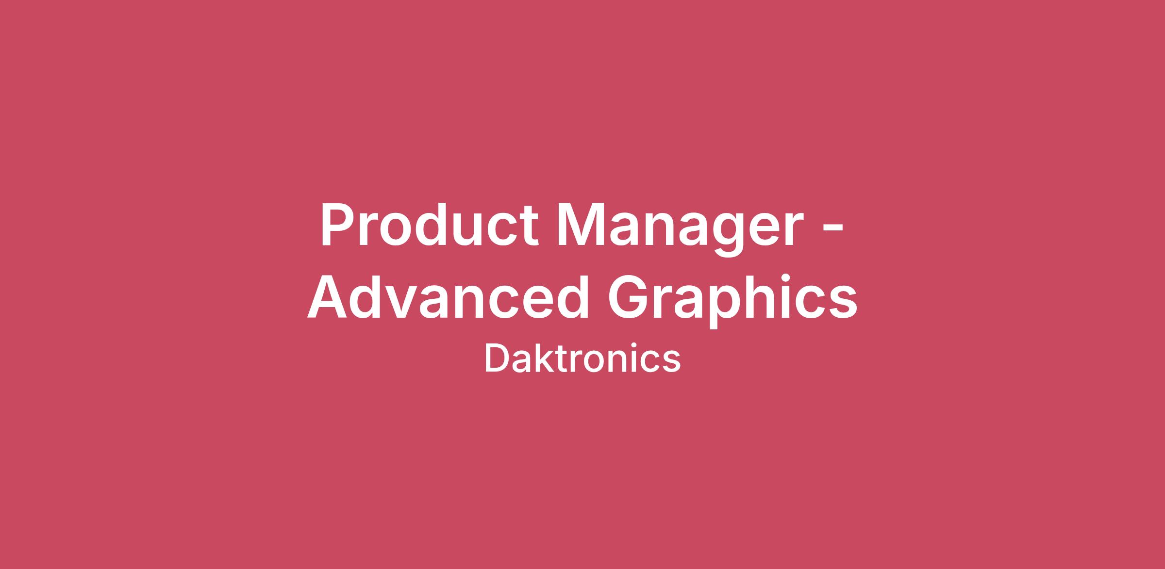 Position Summary When you work at Daktronics, you’ll be part of something amazing. We design, engineer, manufacture, and support bold, eye-catching digital LED display technology and audio systems. Our products bring excitement to professional, college and high school games. They attract customers for businesses around the world, and even provide direction for people as they travel, work, and play. As part of the Daktronics team, you’ll have interesting, impactful work with flexible opportunities. You can learn and grow at a company that provides competitive compensation and meaningful benefits – and the people are second to none. What will the work look like for me?We are seeking a visionary and execution-driven Product Manager for Advanced Graphics. You will drive strategic vision, product development, and lifecycle execution—from concept to end-of-support—of cutting-edge, scalable graphics software tools for use across a range of markets. You will need a global mindset—working across many customer types, regions, and applications—to deeply understand customer needs, identify adjacent and emerging market opportunities, and ensure financial performance. This role is ideal for someone who thrives at the intersection of technology, storytelling, and connecting with audiences of all types, with a passion for leveraging real-time complex data sets to enhance audience engagement through compelling and immersive visual experiences. Your responsibilities will include:Exploring Markets and Users: Identify customer needs, industry trends, and competition through thorough research and direct engagement.Stakeholder Collaboration: Collaborate with business leaders, partners, customers, technical teams, and other stakeholders to ensure product success.Product Vision and Strategy: Develop and articulate a clear product vision and strategy that aligns with the company's goals and objectives.Financial Performance: Track, report, and improve the products’ financial performance.Prioritize: Collaborate with stakeholders and product development teams to set product priorities.Product Development: Partner with cross-functional teams in the design and development of new products and features.Deliver Value: Partner with product launch teams to ensure stakeholders are prepared to produce, sell, and support our products.Lifecycle: Own the product through its full lifecycle, communicating and partnering with stakeholders through transitions.Risk Management: Identify potential risks and develop mitigation plans to ensure smooth product implementation.Feedback Loop: Gather and analyze customer feedback, product usage, and reliability data to continuously improve product offerings.Where is this opportunity located? Daktronics offers the flexibility to work from a U.S. based home office or Daktronics U.S. location. This position will be based on working during regular business hours in the Central time zone, with occasional early or late hours required to collaborate with our global offices. Periodic travel is required to support business needs, collaborate with product development teams, meet with customers, or collaborate with external partners. What are the pay and perks?The typical hiring range for this position is $100,000 to $135,000 annually based on the location. The actual offer will consider a wide range of factors, including relevant education, experiences, location, and applicable local legislation. Information about Daktronics benefits can be found on our website Career Opportunities (www.daktronics.com/en-us/employment/careers.) This information is intended to be a general overview and may be modified by Daktronics at any time. Qualifications To be considered for the Product Manager opportunity, we require the following:Bachelor’s degree, preferably in Engineering and/or Business with strong technical knowledge.5+ years of product management experience in media technology, data visualization platforms, sports production, or comparable.Demonstrated capabilities:Leadership of product(s) that combine real-time data with visual storytelling or audience engagement.Strong understanding of live event production workflows and broadcast graphics systems.Technical fluency in integrating data streams and real-time rendering engines (e.g., Unreal Engine, Vizrt, Chyron, Ross, Daktronics).Strong interpersonal skills; can engage with multiple stakeholders and adapt communication style to be most effective; strong oral and written communication skills. Leading through influence across functional teams and organizational layers.Managing ambiguity and adapting to shifting needs.Developing strong relationships with customers or industry partners and leveraging them to identify and understand customer needs. Vision setting and strategy; successfully championing new and different concepts.Evaluating wide-ranging short- and long-term opportunities and setting clear priorities.Strong curiosity and drive for continuous learning.Creative problem-solving skills.Team player; quick to offer help; supports the needs of our teams and stakeholders.Responsible and accountable for results.Preferred experiences: Experience with integrating technologies like augmented, virtual, and mixed reality (AR/VR/MR) into customer/fan engagement platforms and interactive media.Experience incorporating emerging technologies, like generative AI or AI agents, to improve and automate customer workflows for data visualization. Hands-on experience with Daktronics advanced graphics products.Exercise good judgment in making decisions, considering both short- and long-range implications.Work effectively as a team member, working independently with minimal supervision. Offer assistance when needed, propose and implement suggestions for product and process improvements, and communicate effectively with customers and team members. Become knowledgeable of company policies and procedures.Perform other duties as assigned and required to meet cu