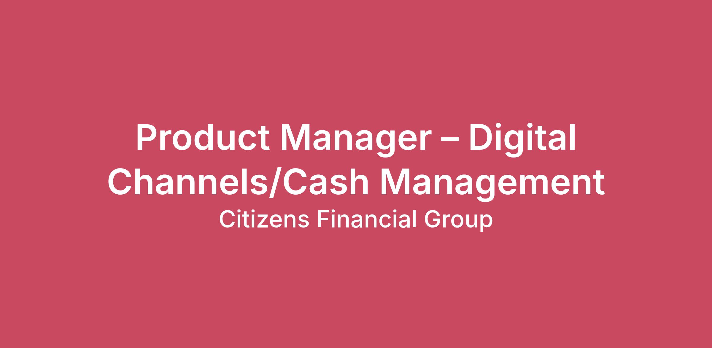 DescriptionProduct Manager – Digital Channels/Cash ManagementRole OverviewCitizens is seeking a Product Manager to support the strategy, development, and ongoing management of key cash management and treasury-related products. This role will partner closely with cross‑functional teams to deliver product enhancements, support platform launches, and drive solutions that meet client needs while supporting business growth.The ideal candidate brings strong product management experience, a client‑centric mindset, and the ability to manage multiple initiatives across the product lifecycle. Own and manage product initiatives across assigned cash management solutions, from concept through delivery and ongoing enhancementPartner with Technology, Operations, Sales, Marketing, and other stakeholders to define product requirements and prioritiesLead product roadmap planning to support client needs, revenue growth, and long‑term product strategySupport product testing, readiness, and launch activities to ensure successful rollout and adoptionGather and incorporate client, market, and stakeholder feedback into product enhancementsEnsure product initiatives align with business objectives and regulatory requirementsMonitor product performance and recommend enhancements or new capabilities over timeQualificationsBachelor’s degree or equivalent experienceExperience in product management, preferably within financial services, treasury, or paymentsStrong ability to manage competing priorities in a fast‑paced environmentExperience partnering cross‑functionally with technology and business teamsExcellent communication, organization, and stakeholder management skillsPreferred ExperienceExperience with cash management, treasury, payments, APIs, or ERP‑related solutionsExperience supporting platform launches or significant product enhancementsFamiliarity with agile or iterative product development methodologiesExperience in commercial online/digital banking Why CitizensAt Citizens, you’ll have the opportunity to work on meaningful products that support our clients’ financial operations while collaborating with talented teams across the organization. We offer a supportive environment, opportunities for growth, and a commitment to doing what’s right for our customers, colleagues, and communities.Hours & Work ScheduleHours per Week: 40Work Schedule: M-F Pay Transparency The salary range for this position is $111,000-$139,000 per year, plus an opportunity to earn an annual discretionary bonus. Actual pay is based on various factors including but not limited to the work location, and relevant skills and experience.We offer competitive pay, comprehensive medical, dental and vision coverage, retirement benefits, maternity/paternity leave, flexible work arrangements, education reimbursement, wellness programs and more. Note, Citizens’ paid time off policy exceeds the mandatory, paid sick or paid time-away policy of every local and state jurisdiction in the United States. For an overview of our benefits, visit https://jobs.citizensbank.com/benefits .