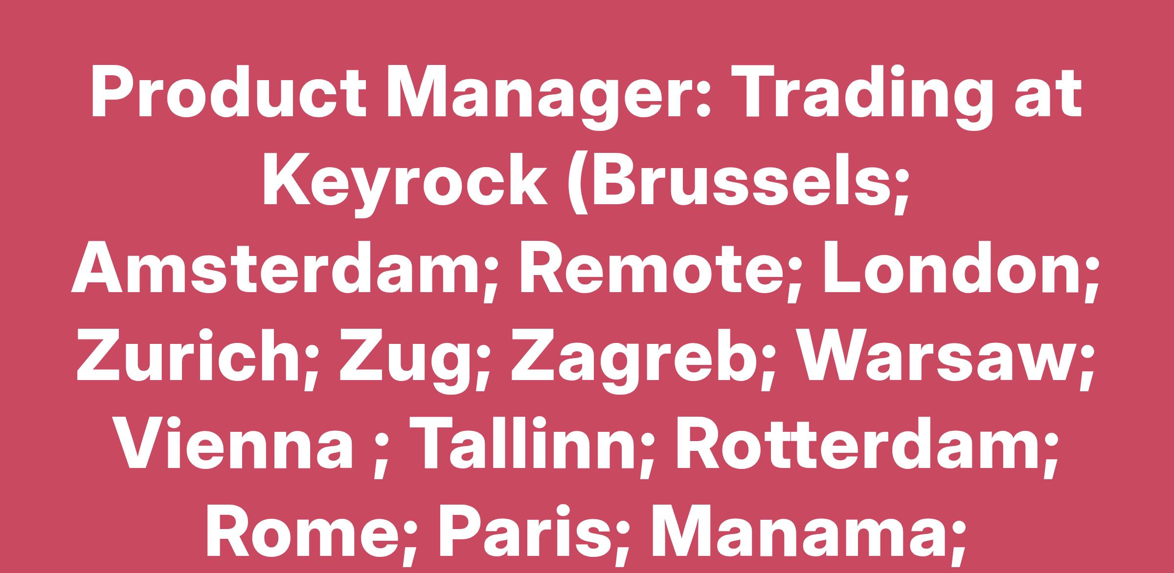 Product Manager: Trading at Keyrock (Brussels; Amsterdam; Remote; London; Zurich; Zug; Zagreb; Warsaw; Vienna ; Tallinn; Rotterdam; Rome; Paris; Manama; Luxembourg; London; Lisbon; Johannesburg; Ghent; Geneva; Frankfurt; Eindhoven; Dubli)
