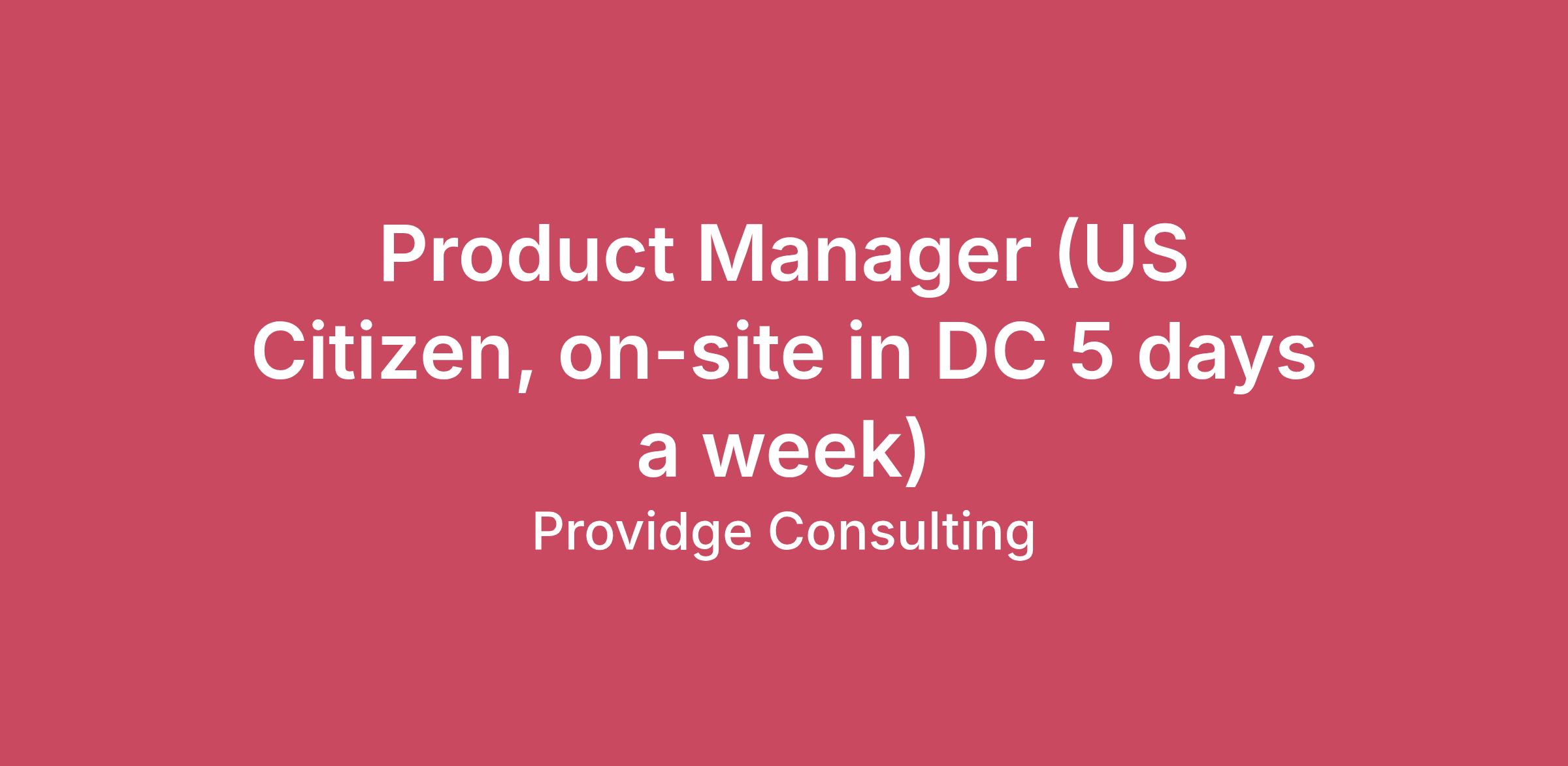 Product Manager Washington, District of Columbia Providge is seeking an experienced Product Manager to lead the strategy, design, and delivery of enterprise-scale data access management capabilities. This role is critical to shaping how users securely request, approve, and manage access to sensitive data across complex, regulated environments. The ideal candidate brings a strong blend of product leadership, user-centered design, and technical fluency, with hands-on experience delivering workflow-driven platforms that balance usability, governance, and security. You will work cross-functionally with engineering, data governance, security, and compliance teams to define intuitive, scalable, and policy-driven solutions that serve multiple user personas. This is an opportunity to own a high-impact product space where thoughtful design and disciplined execution directly support mission-critical outcomes Responsibilities Manage the end-to-end product strategy and roadmap for data access management, covering the full user experience for data stewards, owners, access requesters and approvers. Define and deliver core foundational workflows and capabilities for requesting, approving, granting, reviewing, and revoking access to data Partner closely with business, engineering, data governance, security and compliance teams to gather requirements and translate them into clear product specifications and priorities Deeply understand user needs and pain points across different personas, and use that insight to drive intuitive, scalable, and compliant solutions Lead discovery efforts including user research, journey mapping, and workflow design to ensure solutions are usable and aligned with real world processes Balance short term delivery with long term platform and architecture considerations to support scalable, policy driven access management solutions. Define success metrics and continuously measure, iterate, and improve the product basedon usage data and user feedback Communicate product vision, progress, and tradeoffs clearly to both technical and nontechnical stakeholders. Citizenship US Citizenship Required Qualifications At least 6 years in product management, engineering and/or management consulting. At least 3 years of product management, product design, agile delivery, business analysis, data science, or software engineering. Knowledge, Skills & Abilities Experience managing the delivery, ongoing success, and continuous improvement of one or more digital products and/or platforms. Lead one or more multi-disciplinary agile delivery teams to deliver excellent new products and/or iterations to existing products to meet user needs. Gather user requirements based on a communicable understanding of diverse audience groups. Create effective, prioritized product descriptions, and delivery plans to meet user needs in a cost-effective way. Experience managing complex workflow driven products and services. Experience building products that span multiple user personas and require coordination across multiple teams or systems Strong understanding of data access management, data governance or identity and access management concepts including familiarity with access control models such as RBAC and ABAC is a must. Proven ability to gather ambiguous requirements, synthesize input from diverse stakeholders (business, security, data governance etc.) and drive alignment towards a clear product direction Comfortable working closely with engineering teams on foundational capabilities, APIs and system integrations Demonstrated ability to operate in an agile environment, owning the product backlog, defining and refining user stories, and delivering value through iterative, incremental releases. Excellent communication and stakeholder management skills, with the ability to influence without authority and explain complex access and governance concepts clearly Experience working with or integrating access management tools and platforms (e.g. entitlement systems, approval of workflows, policy engines, identity providers) is a plus. Experience working in regulated or compliance sensitive environments is a plus Certificates At least one of the following or its equivalent: ITIL 4 Foundation certifications Certified Product Manager Agile Certified Product Manager and Product Owner. Education Bachelor’s degree Compensation & Benefits Full benefits offered