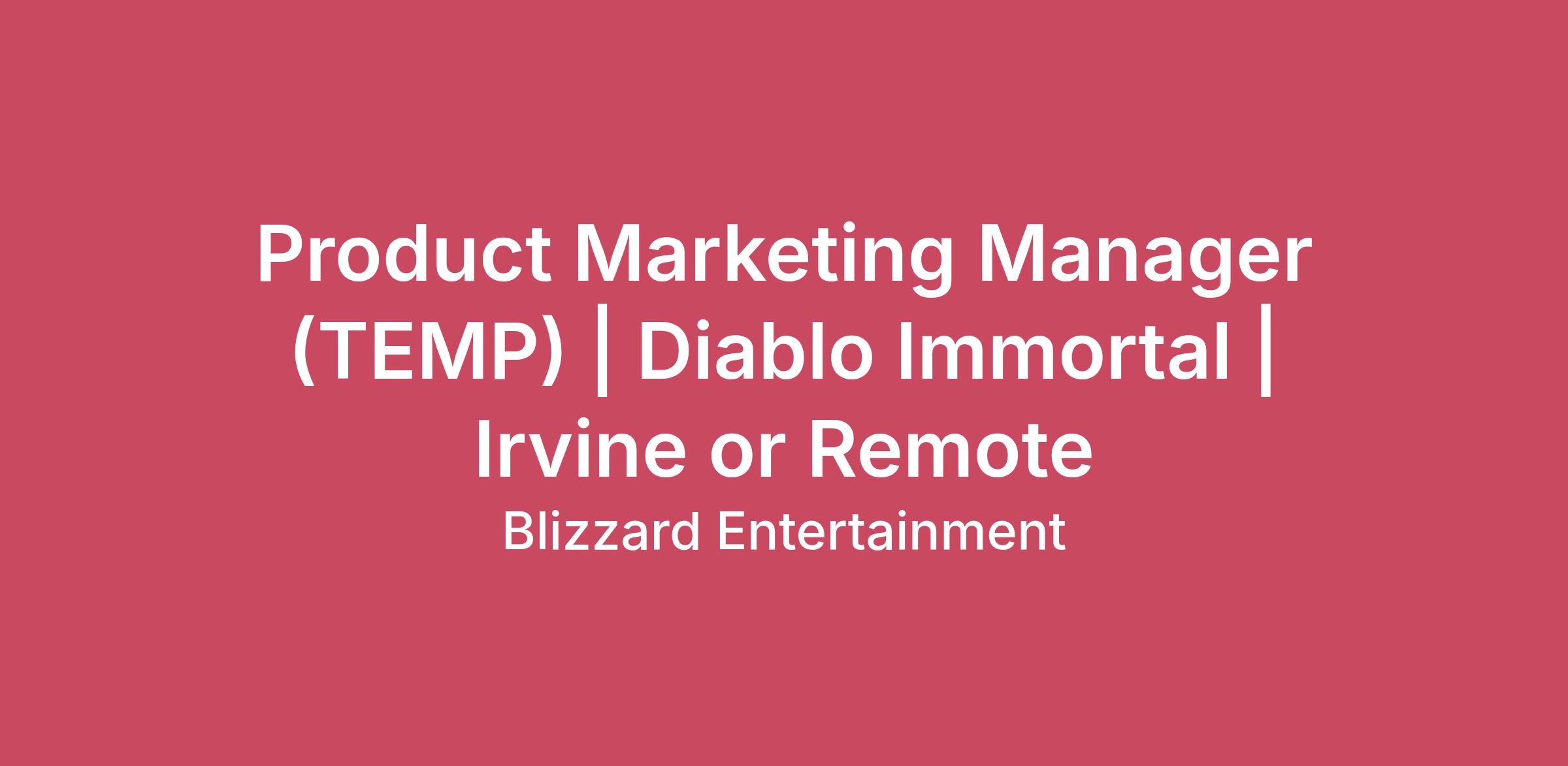 Team Name:MarketingJob Title:Product Marketing Manager (TEMP) | Diablo Immortal | Irvine or RemoteRequisition ID:R027294Job Description:We Need You The minions of Hell are growing stronger... Join us as we write the next chapter in the Diablo universe! Diablo Immortal, a Massively Multiplayer Action-RPG mobile game set in the world of Sanctuary, lets heroes slay demons anywhere, at any time. Come work with us, and together, we’ll create something amazing. Our team of passionate developers is growing. We are seeking a Product Marketing Manager to help bring major game updates, features, seasonal content, and live events to players around the world. In this role, you will help shape and execute marketing strategies that drive awareness, engagement, and long‑term player retention, while collaborating closely with cross‑functional partners across the organization. This role is ideal for an experienced product marketer who is passionate about mobile games, live‑service ecosystems, and player‑first storytelling, and who thrives in a collaborative, fast‑paced environment. NOTE: This is a temporary position for 12 months. The candidate will ideally be based in Irvine; however, remote candidates within the United States will also be considered, provided they work in the West Coast time zone. Responsibilities Support product marketing strategy and execution for Diablo Immortal, including live service updates, seasonal content, new features, and in-game events. Assist in developing and executing go-to-market plans for major releases in partnership with senior product marketing leadership. Represent the voice of the player by gathering insights from player data, research, community sentiment, and market trends. Conduct competitive and market analysis to inform product positioning, messaging, and marketing priorities. Collaborate with cross-functional partners, including game development, publishing, user acquisition, creative, analytics, platform, ASO, social, influencer, community, and PR, to execute integrated marketing campaigns. Contribute to product positioning and messaging frameworks and help brief partners to ensure consistency across marketing channels and player touchpoints. Collaborate with brand and creative teams on the development of marketing assets and campaign execution. Work with analytics and user acquisition teams to define success metrics, track campaign performance, and identify optimization opportunities. Support campaign retrospectives and post-mortems to capture learnings and improve future marketing efforts. Help manage marketing calendars, asset timelines, and deliverables across multiple teams and regions. Partner with first-party platform teams to support app stores featuring opportunities, store optimization efforts, and feature testing initiatives. Minimum Requirements 8+ years of experience in product marketing, brand marketing, or live services marketing. Experience collaborating with cross‑functional partners in a matrixed organization. Familiarity with integrated marketing across paid, owned, and organic channels. Strong organizational and project management skills, with a high level of attention to detail. Analytical mindset with the ability to interpret data and translate insights into clear marketing takeaways. Excellent communication skills and demonstrated ability to learn and grow as a product marketer. Bachelor’s degree or equivalent experience in marketing, business, or related field. Bonus Points Experience supporting live service products, ongoing campaigns, or content updates. Background in mobile or free‑to‑play games. Strong interest in mobile games, action RPGs, and live service development. Your Platform Best known for iconic video game universes including Warcraft®, Overwatch®, Diablo®, and StarCraft®, Blizzard Entertainment, Inc. (www.blizzard.com), a division of Activision Blizzard, which was acquired by Microsoft (NASDAQ: MSFT), is a premier developer and publisher of entertainment experiences. Blizzard Entertainment has created some of the industry’s most critically acclaimed and genre-defining games over the last 30 years, with a track record that includes multiple Game of the Year awards. Blizzard Entertainment engages tens of millions of players around the world with titles available on PC via Battle.net®, Xbox, PlayStation, Nintendo Switch, iOS, and Android. Our World Activision Blizzard, Inc., is one of the world's largest and most successful interactive entertainment companies and is at the intersection of media, technology and entertainment. We are home to some of the most beloved entertainment franchises including Call of Duty®, World of Warcraft®, Overwatch®, Diablo®, Candy Crush™ and Bubble Witch™. Our combined entertainment network delights hundreds of millions of monthly active users in 196 countries, making us the largest gaming network on the planet! Our ability to build immersive and innovative worlds is only enhanced by diverse teams working in an inclusive environment. We aspire to have a culture where everyone can thrive in order to connect and engage the world through epic entertainment. We provide a suite of benefits that promote physical, emotional and financial well-being for ‘Every World’ - we’ve got our employees covered! The video game industry and therefore our business is fast-paced and will continue to evolve. As such, the duties and responsibilities of this role may be changed as directed by the Company at any time to promote and support our business and relationships with industry partners We love hearing from anyone who is enthusiastic about changing the games industry. Not sure you meet all the qualifications? Let us decide! Research shows that women and members of other under-represented groups tend to not apply to jobs when they think they may not meet every qualification, when, in fact, they often do! We are committed to creating a diverse and inclusive environment and s