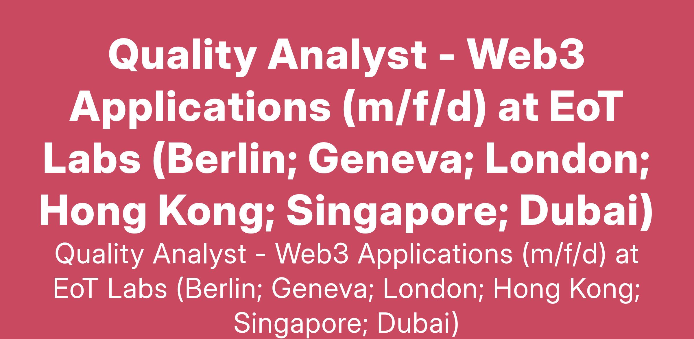 Quality Analyst - Web3 Applications (m/f/d) at EoT Labs (Berlin; Geneva; London; Hong Kong; Singapore; Dubai)