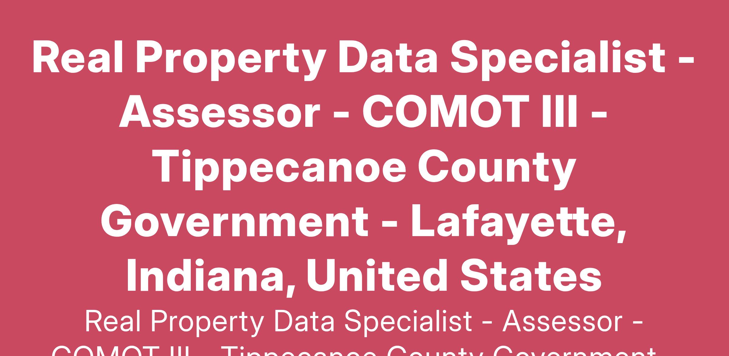 Incumbent serves as Field Agent for the Tippecanoe County, Assessors Office, responsible for reviewing properties in person and via aerial photography, entering data, maintaining related records, and assisting the public.
