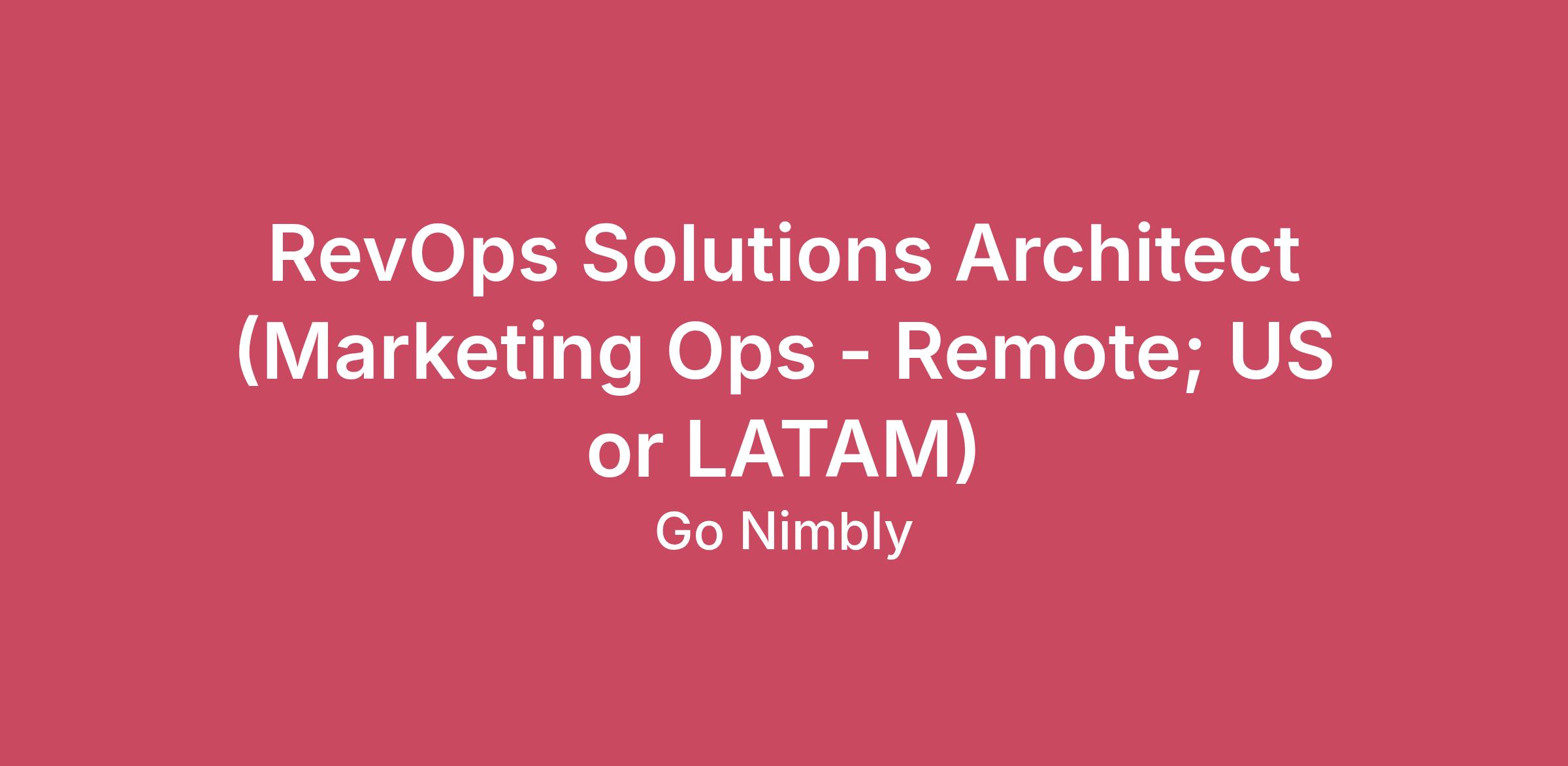 RevOps Solutions Architect (Marketing Ops & Automation Focus)About the jobAt Go Nimbly, we want to be a global thought leader in the RevOps space by developing a badass brand built through innovative work created by individuals with growth mindsets. As a member of the Delivery team, you will help our clients drive more revenue by creating a buying experience that’s both frictionless and human. You will move these high-growth companies towards a more operationally efficient organization.As a RevOps Solutions Architect at Go Nimbly, you’ll collaborate with a team of RevOps Consultants, Program Managers, and Analysts to build best-in-class solutions and impactful technology roadmaps. You’ll act as a subject matter expert in marketing automation and top-of-funnel systems, designing scalable architecture across platforms like Marketo, HubSpot, Pardot, and Salesforce to enable demand generation, lead management, and funnel efficiency. You’ll scope, solution, and lead projects by balancing scalability, trade-offs, best practice, and the latest technology trends.**Remote: Location RequirementsWe’re a fully remote company. At this time, we are only able to hire candidates who reside in the following locations due to payroll, tax, and compliance requirements:U.S. states: California, Colorado, Florida, Georgia, Illinois, Massachusetts, New Hampshire, New York, North Carolina, Oregon, Pennsylvania, Texas, Utah.Countries: Argentina, Colombia, Uruguay, Mexico, BrazilOn a given day, a RevOps Solutions Architect will spend time:Collaborating with clients and internal teams in the early stages of a project to define architecture and approach.Designing end-to-end lead lifecycle and campaign operations across Marketo, Pardot, HubSpot, and Salesforce.Implementing solutions for lead scoring, nurturing, attribution modeling, campaign performance measurement, and marketing-to-sales handoff.Presenting solutions to client teams in a way that builds trust and creates buy-in for scalable best practices.Defining marketing operations and integration standards while advising clients on trade-offs and future-proofing.Coaching team members and elevating knowledge of marketing automation tools, funnel design, and data-driven campaign operations.Keeping a pulse on marketing technology releases and trends, shaping Go Nimbly’s POV on how changes will impact RevOps and client roadmaps.What’s in it for you?Flexible working environment: our entire team works remotely, and we have no plans to change this!Tiered incentive program (in addition to base salary) to reward high performers.Gain exposure to several high-growth companies looking to scale and invest in their revenue operations function.Be a part of a dynamic team and collaborate with top industry professionals. Many of our alumni have gone on to become leaders and executives at high-growth companies!Annual camp: we have a yearly offsite to bring the team together, celebrate our successes, and plan the year.Dedicated to employee development and career paths aimed at fostering your growth and your career.100% paid premiums for US employees’ insurance coverage.About youYou have at least 8+ years of experience in Revenue Operations, Marketing Operations, or Systems Architecture with deep expertise in Marketo, HubSpot, Pardot, and Salesforce.You can design scalable, automated solutions for campaign operations, lead lifecycle, funnel performance, and marketing-to-sales alignment.You understand the nuances of lead scoring, attribution, data quality, and campaign measurement across systems.You bring strong architecture and technical design skills with a mature perspective on when to use out-of-the-box features vs. custom solutions.You are comfortable advising senior stakeholders and translating business requirements into technical roadmaps.Bonus: Salesforce certifications (Admin, Advanced Admin, Application Architect) or marketing automation certifications (Marketo Certified Expert, HubSpot Solutions Architect).About usWe take results seriously and are focused on the customer experience.We are positive people who have a sense of urgency, creativity, and decisiveness coupled with the willingness to work hard and well under pressure.We care about our growth and push our teams to learn from others.We are ambassadors of Go Nimbly within the Revenue Operations space.What’s next?Apply! Rest assured, while AI might feel like it’s taking over the world, we have a human on the other end of the computer personally reviewing each application. Our Talent Acquisition team will reach out if we’d like to speak further about the role. And if not, we promise to let you know because let’s be honest, who enjoys being ghosted when applying for a job? Not only are we committed to getting back to you but we also provide clear feedback.During the first call with our Talent team, we will lay out the steps in the interview process since it’s unique to each role but typically includes a couple of rounds. We value your time and ours, so we plan to make the best use of our interviews to learn if we are a good fit for you and vice versa.