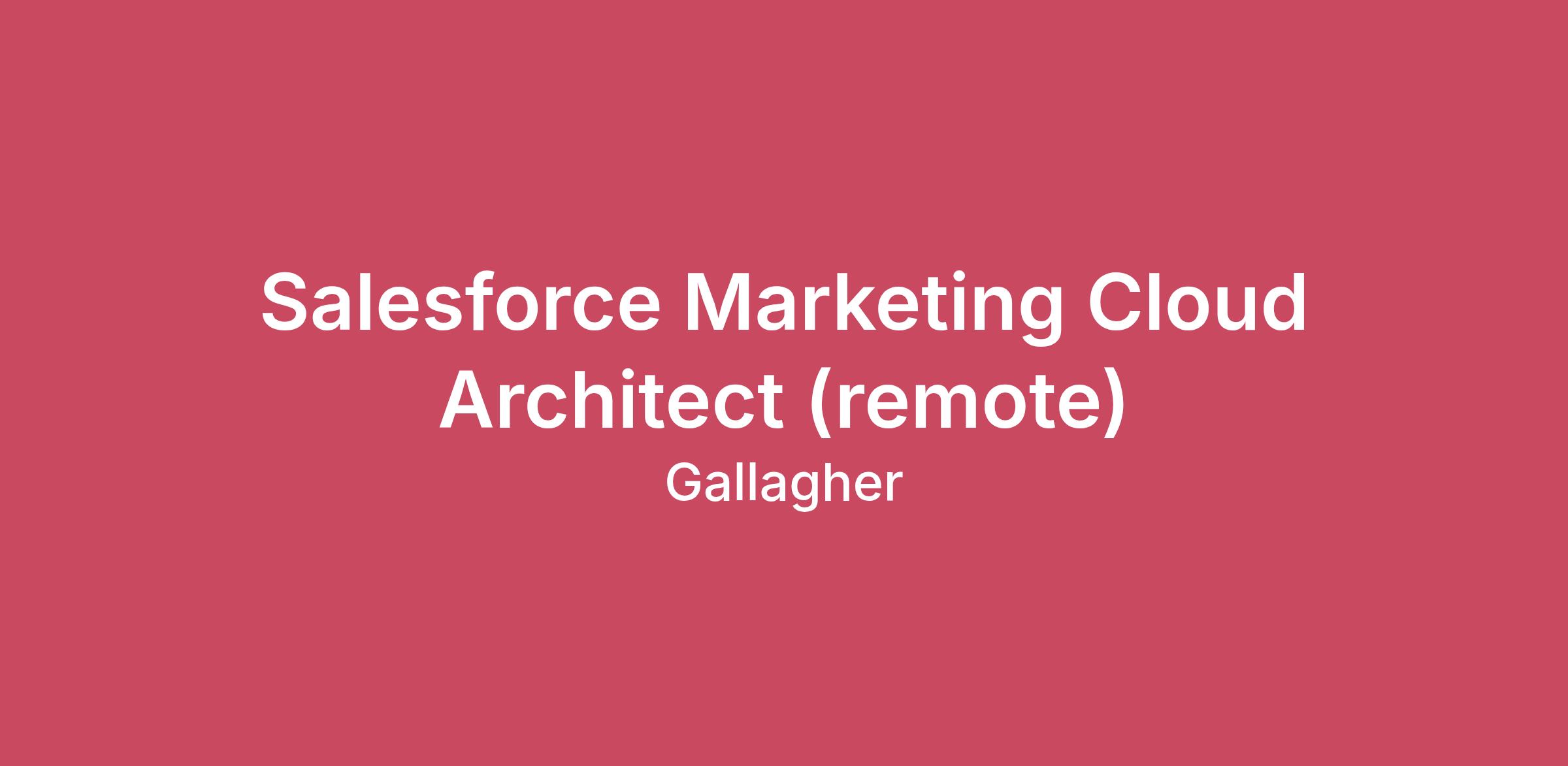 IntroductionWelcome to Gallagher - a global community of people who bring bold ideas, deep expertise, and a shared commitment to doing what’s right. We help clients navigate complexity with confidence by empowering businesses, communities, and individuals to thrive. At Gallagher, you’ll find more than a job; you’ll find a culture built on trust, driven by collaboration, and sustained by the belief that we’re better together. Whether you join us in a client-facing role or as part of our brokerage division, our benefits and HR consulting division, or our corporate team, you’ll have the opportunity to grow your career, make an impact, and be part of something bigger. Experience a workplace where you’re encouraged to be yourself, supported to succeed, and inspired to keep learning. That’s what it means to live The Gallagher Way. OverviewWe are seeking an Salesforce Marketing Cloud Architect with deep expertise in Salesforce Marketing Cloud (SFMC) and working knowledge of Salesforce Data Cloud to lead enterprise-scale customer engagement, data activation, and personalization initiatives. This role will drive architecture strategy, solution design, integration frameworks, and governance across marketing, CRM, and digital ecosystems. The ideal candidate combines strong technical architecture skills with business acumen, stakeholder leadership, and hands-on implementation experience. This is a high-impact position at the forefront of Salesforce’s "Data + AI + CRM" strategy. You will move beyond standard marketing automation and step into the world of real-time data orchestration and AI-driven insights. This role can be fully remote/virtual/work from home and you can be based anywhere in the US. How you'll make an impactArchitectural Design: Lead the end-to-end technical architecture for SFMC (Email, Mobile, Automation Studio, Journey Builder) and Data Cloud (Ingestion, Modeling, Identity Resolution, and Calculated Insights).Data Strategy & Integration: Define data models and ETL processes. Design complex integrations between Data Cloud, SFMC, Sales/Service Cloud, and external data lakes (e.g., Snowflake, AWS S3).Advanced Personalization: Architect solutions using Marketing Cloud Personalization (formerly Interaction Studio) and Data Cloud Actuations to drive real-time, cross-channel experiences.Performance Optimization and Troubleshooting: Monitor and optimize the performance of Marketing Cloud, Data Cloud, and DevOps pipelines, including data processing, campaign execution, and system efficiency. Troubleshoot and resolve technical issues related to configurations, integrations, and data flowsIdentity Resolution: Configure and optimize Identity Resolution rules within Data Cloud to ensure accurate customer stitching across disparate data sources.Governance & Security: Establish best practices for business unit structure, data privacy (GDPR/CCPA compliance), and security protocols within the Salesforce environment.Technical Leadership: Act as a subject matter expert (SME) for stakeholders, translating business requirements into technical specifications and guiding a team of developers/consultants. About YouBachelor’s degree in computer science, Data Science, or a related field.8+ years of experience in the Salesforce ecosystem, with at least 4+ years in an Architect role.Proven track record of delivering at least one full-scale Data Cloud implementation.Strong background in data architecture, relational databases, Strong SQL (joins, aggregations, performance tuning) and big data concepts.Salesforce Marketing Cloud: Expert-level knowledge of AMPscript, SSJS, SQL, and the SFMC API suite.Salesforce Data Cloud: Hands-on experience with Data Streams, Data Mapping (DMO), Identity Resolution, and creating Calculated/Streaming Insights.Integration Patterns: Deep understanding of MC Connect, API-based integrations (REST/SOAP), and middleware solutions.Web Technologies: Proficiency in HTML/CSS and JavaScript for cloud pages and advanced email rendering.Excellent communication skills, with the ability to explain "the why" behind technical decisions to non-technical executives.The ideal candidate will hold a combination of the following:Salesforce Certified Marketing Cloud ArchitectSalesforce Certified Data Cloud ConsultantSalesforce Certified Marketing Cloud ConsultantSalesforce Certified Marketing Cloud Developer#LI-DK3#LI-Remote Compensation and benefitsWe offer a competitive and comprehensive compensation package. The base salary range represents the anticipated low end and high end of the range for this position. The actual compensation will be influenced by a wide range of factors including, but not limited to previous experience, education, pay market/geography, complexity or scope, specialized skill set, lines of business/practice area, supply/demand, and scheduled hours. On top of a competitive salary, great teams and exciting career opportunities, we also offer a wide range of benefits. Below are the minimum core benefits you’ll get, depending on your job level these benefits may improve: Medical/dental/vision plans, which start from day one!Life and accident insurance401(K) and Roth optionsTax-advantaged accounts (HSA, FSA)Educational expense reimbursementPaid parental leaveOther benefits include:Digital mental health services (Talkspace)Flexible work hours (availability varies by office and job function)Training programsGallagher Thrive program – elevating your health through challenges, workshops and digital fitness programs for your overall wellbeingCharitable matching gift programAnd more...**The benefits summary above applies to fulltime positions. If you are not applying for a fulltime position, details about benefits will be provided during the selection process. We value inclusion and diversityClick Here to review our U.S. Eligibility RequirementsInclusion and diversity (I&D) is a core part of our business, and it’s embedded into the fabric of our organization. For 