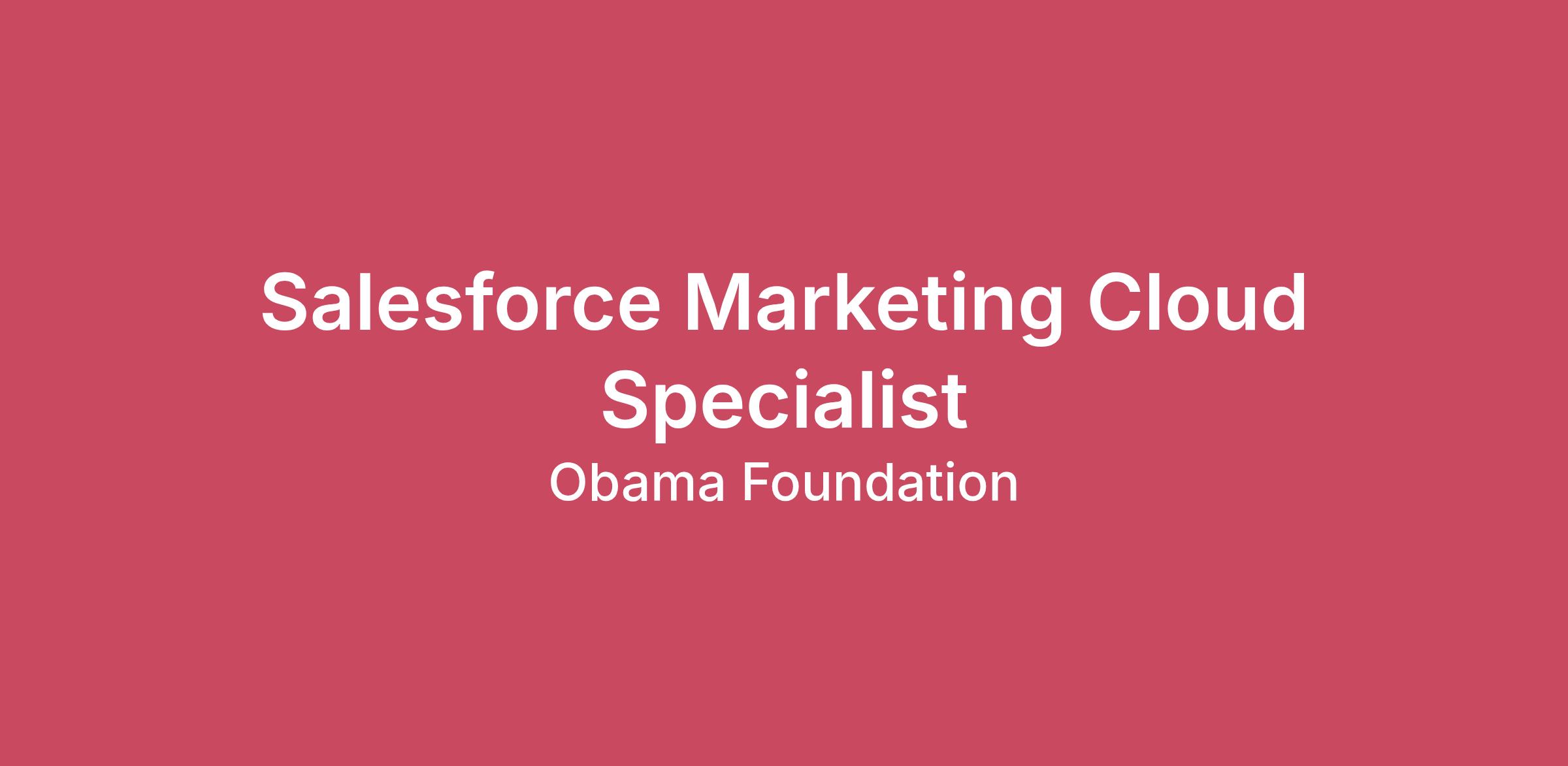 At The Obama Foundation, our mission is to inspire, empower, and connect people to change their world. We seek to build an active democratic culture where people are equipped and motivated to make change in the communities where they live, work, and play. Right here on the South Side of Chicago, we’re building a home for this vision, a global center for change with a range of opportunities - coordinated programming, community outreach events, educational moments, and more - that invite visitors from down the block or across the globe to turn hope into action.Achieving our ambitious goals starts with an exceptional team built on our Hope to Action Values - Courage, Empathy, Integrity, Accountability, Community, Inclusivity, Pragmatism, Resilience, Imagination, and Hope. A Framework that anyone, anywhere, can use to build trust, activate participation, and expand opportunity in their community.Purpose of the RoleAs the Salesforce Marketing Cloud Specialist, you’ll join our Product & Technology team to support our email and SMS strategy, with a particular focus on Marketing and Fundraising needs. You will be the product administrator and technical lead for configuring and implementing Salesforce Marketing Cloud features to accomplish the marketing goals and strategy set by the Obama Foundation marketing/communications teams.As the Salesforce Marketing Cloud Specialist, you'll report directly to the Lead Product Manager.Core Job ResponsibilitiesServe as the Foundation’s subject matter expert on the Salesforce Marketing Cloud (SFMC) platform to serve a number of internal stakeholders and departments, including Fundraising, Marketing, Communications, Public Engagement, and Programs.Build journeys and automations in Salesforce Marketing Cloud to engage and inform our audiences, and move them strategically to targeted actions through our funnels.Analyze data in SFMC to ensure we are sending personalized and engaging content to the appropriate audiences, make recommendations, and develop new logic-based journeys.Collaborate with Marketing to develop and implement strategic and flexible audience segmentationCollaborate with Salesforce Administration to build data architecture and third party appends (including demographic and psychographic information) to support segmentation strategyCollaborate cross-departmentally to develop both standard and customized suppressionsMake informed recommendations for audience retention and engagement through responsive communications and user preferencesEnsure consistency of user experience across all stages of digital journeyMonitor and improve the efficacy of email campaignsMonitor deliverability and domain healthCollaborate with UX designers to monitor and improve design fidelity across devices and email clients Track and recommend technical advancements to improve campaign performance Develop and execute a regular email and SMS reporting program to inform strategy, align stakeholders, prioritize testing, and implement learnings Ensure segment health and hygiene by developing re-engagement campaigns, culling records, and ensuring proper integration with the Salesforce CRM.Proactively consider and recommend channels for audience acquisition, prioritizing data integrations with highest growth potential Execute, report on, and brainstorm ideas for A/B and multivariate testing.Collaborate with teams across the Foundation who communicate with their constituencies over email, as well as teams responsible for other digital audience touchpoints (advertising, communications, website, etc). Key Deliverables / OutcomesOffer recommendations for how to streamline and improve our mass email marketing processes in Salesforce Marketing Cloud.Bring more automation and logic-based content journeys into our mass email marketing program.Collaborate with marketing teams to develop an email production calendar, KPIs, and reporting schedule to align marketing operations with overall marketing and business objectives and create a positive experience for the subscriber.Support marketing in developing KPIs and a reporting schedule.Improve segment hygiene and integration of SFMC subscriber records with CRM.Create a QA checklist for steps to take before an email send goes out.Support in the creation and roll-out of early SMS strategy. Required QualificationsExtensive knowledge of and experience in Salesforce, Salesforce Marketing Cloud, SQL, HTML, and CSS requiredSalesforce Marketing Cloud Administrator certification preferredExperience utilizing AMPscript to create dynamic, personalized experiences for audiencesProven experience building and managing email campaigns, journeys, data extensions, automations, and reports in SFMCProficiency in HTML and CSS Collaborative team player able to work effectively in cross-functional teamsExcellent verbal and written communication skills Strong analytical and problem-solving skills The salary range for this role is between $90,915 and $113,620.This is a remote role based in Chicago. Don’t check off every box in the requirements listed above? Please apply anyway! If you’re excited about this role but your past experience doesn’t align perfectly with every qualification in the job description, we encourage you to still consider submitting an application. You may be just the right candidate for this role or another one of our openings!Equal Opportunity EmployerThe Foundation is committed to creating a diverse work environment and is proud to be an equal opportunity employer. The Foundation does not discriminate on the basis of race, color, national origin, sex, gender identity, religion, sexual orientation, age, disability, parental status, veteran status, or any other protected status under applicable laws. We encourage individuals of all backgrounds to apply. If you are a qualified candidate with a disability, please e-mail us at careers@obama.org if you require a reasonable accommodation to complete this application.