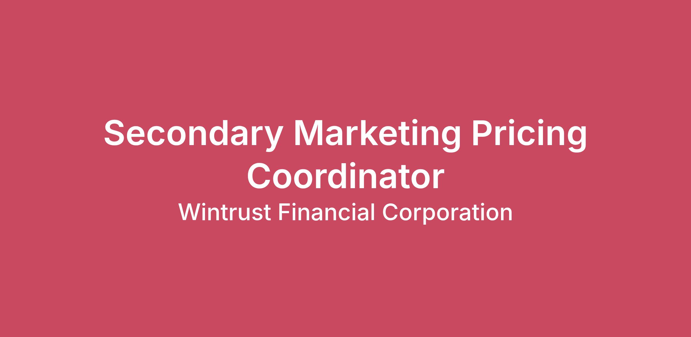 Wintrust Mortgage was founded in 1981 to help customers achieve the American dream of homeownership and has since successfully navigated the ever-changing real estate market. As a full-service, federally chartered lender with offices located across the country, we’re dedicated to providing customers with a wide range of mortgage products and have the capability to lend in all 50 states. To complement the basic conventional, FHA, and VA loan programs, we are uniquely positioned to meet the needs of the continually evolving market. Wintrust Mortgage is part of Wintrust, a financial services company with more than $66 billion in assets.Why join us?An award-winning culture! We are rated a Top Workplace by the Chicago Tribune (past 11 years) and Employee Recommended award by the Globe & Mail (past 6 years)Competitive pay and discretionary or incentive bonus eligibleComprehensive benefit package including medical, dental, vision, life, a 401k plan with a generous company match and tuition reimbursement to name a fewFamily-friendly work hoursWith 175+ community bank locations, we offer opportunities to grow and develop in your careerPromote from within cultureWhy join this team? We have a culture that encourages an entrepreneurial spiritWe offer multiple opportunities for development and upward mobilityWhat You’ll Do:Secondary Marketing Pricing Coordinator supports the functions of the Secondary Marketing department by providing exceptional customer service, knowledge and excellent communication to our internal and external customers. They are responsible for completing new locks and maintaining pricing for all locks throughout the life of the loan.New Locks – Oversee the process of new hedged locks and facilitating loan lock transactions with our correspondent investors.Manages Locked Pipeline- Work directly with Loan Originators, and other internal staff members via phone calls and through the Secondary email queue, on all lock related issues. Researching and completing relocks, lock revisions and extensions in a timely manner.Investor Relations- Interact with Investors as it relates to loan commitment and sales.Qualifications:0-3 years of experience with Secondary Marketing Pricing Coordination.Understanding of New Locks, Managing Locked Pipelines, Daily Rates, and Investor Relations.Bachelor’s degree or equivalentGeneral Computer SkillsAbility to work 10:30 am CST – 7:00 pm CST 1 or 2 days a week for West Coast coverage.Ability to travel 2 days each quarter to Rosemont, IL for meetings, team building and training.Compensation: The estimated salary range for this role is $42,000 - $55,000 along with eligibility to earn an annual bonus. Actual salaries may vary based on several factors, such as a candidate’s qualifications, skills and experience. Benefits:Medical Insurance • Dental • Vision • Life insurance • Accidental death and dismemberment • Short-term and long term Disability Insurance • Parental Leave • Employee Assistance Program (EAP) • Traditional and Roth 401(k) with company match • Flexible Spending Account (FSA) • Employee Stock Purchase Plan at 5% discount • Critical Illness Insurance • Accident Insurance • Transportation and Commuting Benefits • Banking Benefits • Pet Insurance#LI-RemoteFrom our first day in business, Wintrust has been proud to serve a variety of unique communities and people from all walks of life. To build a company that reflects the communities we serve, we believe that fostering a unique and inclusive workplace where everyone feels valued and empowered to succeed will support our ongoing success. Wintrust Financial Corporation, including community banking and financial services subsidiaries, is an Equal Opportunity Employer. All qualified applicants will receive consideration for employment without regard to race, color, religion, sex, age, national origin, disability, veteran status, genetic information, and other legally protected categories.