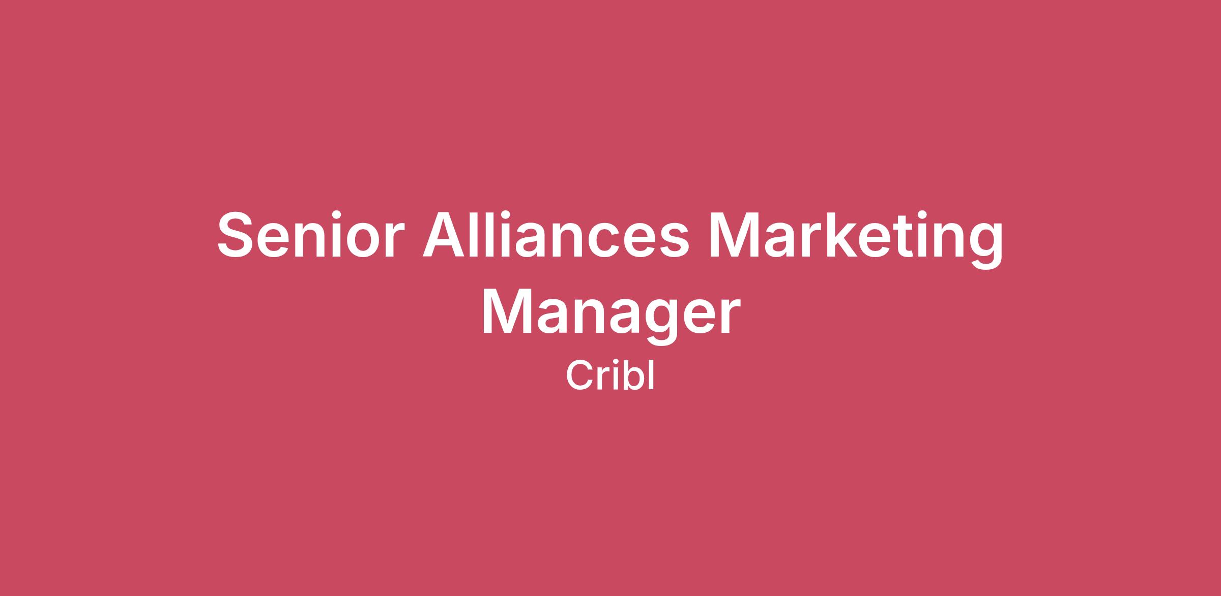 Cribl does differently. What does that mean? It means we are a serious company that doesn’t take itself too seriously; and we’re looking for people who love to get stuff done, and laugh a bit along the way. We’re growing rapidly - looking for collaborative, curious, and motivated team members who are passionate about putting customers first. As a remote-first company we believe in empowering our employees to do their best work, wherever they are. As the data engine for IT and Security many of the biggest names in the most demanding industries trust Cribl to solve their most pressing data needs. Ready to do the best work of your career? Join the herd and unlock your opportunity.Why You'll Love This Role As the Senior Alliances Marketing Manager will drive strategic marketing initiatives to maximize the business impact of Cribl’s joint solutions with our key technology alliance partnerships (TAP). This role encompasses developing comprehensive go-to-market demand generation strategies, creating alliance messaging and materials, and identifying and influencing market opportunities with TAP partners all while cultivating strong stakeholder relationships and analyzing results for the biggest impact. You will play a critical role in supporting the growth of our Alliances program and success in this role requires a unique blend of strategic thinking, operational excellence, and strong alliance-building and execution skills. As An Active Member Of Our Team, You Will... Develop and execute comprehensive marketing strategies technology alliance partners that emphasize our joint value propositions and ensure alignment with Cribl’s overall business objectives Develop a deep understanding of our diverse, global partner ecosystem and how Cribl can resonate across partner audiences and drive usage Act as a key source for TAP marketing strategy and joint positioning/messaging for our partners Strategically plan and tactically execute effective marketing programs that drive revenue for alliance programs and strengthen these partnerships globally Develop and own 360° Marketing Plans for select Elite partners that align with sales goals and GTM priorities Work closely with product marketing, product engineering, and business development in creating strategic messaging and positioning for joint product offerings such as case studies, joint product briefs, etc. Educate and inform internal partner-facing field teams on the TAP marketing strategy Develop and maintain strong relationships with the global alliance partner teams and internal stakeholders and motivate the partner to provide additional joint marketing opportunities Measure and report on success metrics for joint campaigns with alliance partners, making recommendations for improvements Use data to continually analyze and track program performance and evolve the strategy and programs We are a remote-first company and work happens across many time-zones – you may be required to occasionally perform duties outside your standard working hours If You've Got It - We Want It 4 - 7+ years of alliance and/or partner marketing experience; B2B SaaS start-up experience preferred Ability to manage and prioritize 5-8 partners at a time Experience developing demand generation programs and event strategy and execution with partners Outcomes-driven, analytical, customer-first and have a track record of executing creative, impactful field marketing programs A proven track record of working collaboratively and asynchronously with product, technical, sales, channel, marketing and the exec team to impact early and late stage pipeline Understanding of a broad range of marketing activities, disciplines, and tactics, including field marketing, digital marketing, and industry events A high bar in everything you and your team do - quality, creativity, execution and productivity Have a flexible and pragmatic mindset and the ability to think quickly on your feet with little supervision at times and adaptability to a fast-paced changing environment Proactive, independent thinker with high energy and positive attitude Highly motivated, self-starter that can build and launch programs and communications within budget and effectively manage multiple timelines Data-driven mindset with robust analytical and problem-solving abilities, utilizing key performance indicators to optimize marketing effectiveness Strong strategic, analytical, project management and communication (oral and written) skills Travel up to 25% BONUS: A sense of humor, willingness to be your authentic self and a deep believer of being human-first is a big plus. Genuine desire to have fun, to learn and to make a difference Salary Range ($99,600 - $186,700) The salary for this role is dependent on geographic location. The salary offered within the range described will be based on the individual candidate’s job-related knowledge, skills, and experience. In addition to a competitive salary, Cribl also offers a generous benefits package which includes health, dental, vision, short-term disability, and life insurance, paid holidays and paid time off, a fertility treatment benefit, 401(k), equity, and eligibility for a discretionary company-wide bonus.#LI-KM1#LI-RemoteBring Your Whole SelfDiversity drives innovation, enables better decisions to support our customers, and inspires change for the better. We’re building a culture where differences are valued and welcomed, and we work together to bring out the best in each other. All qualified applicants will receive consideration for employment without regard to race, color, religion, sex, sexual orientation, gender identity, national origin, or any other applicable legally protected characteristics in the location in which the candidate is applying. Interested in joining the Cribl herd? Learn more about the smartest, funniest, most passionate goats you’ll ever meet at cribl.io/about-us.