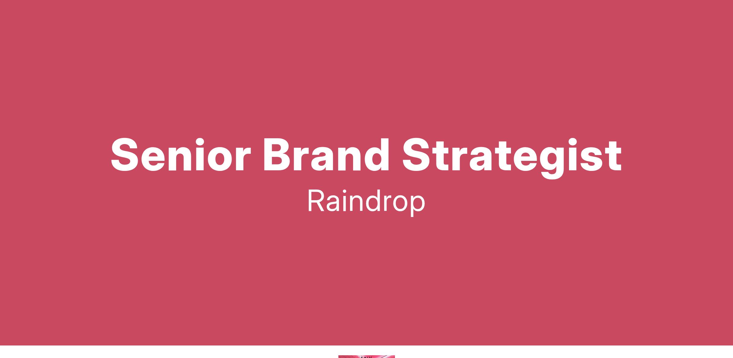 Raindrop is a fast-growing agency and the leader in creating Marketing People Love. We are looking for a Sr. Brand Strategist to join our Strategy Team who is a talented and dynamic brand and marketing expert ready to assist various teams using a blend of creative, strategic, and analytical expertise.