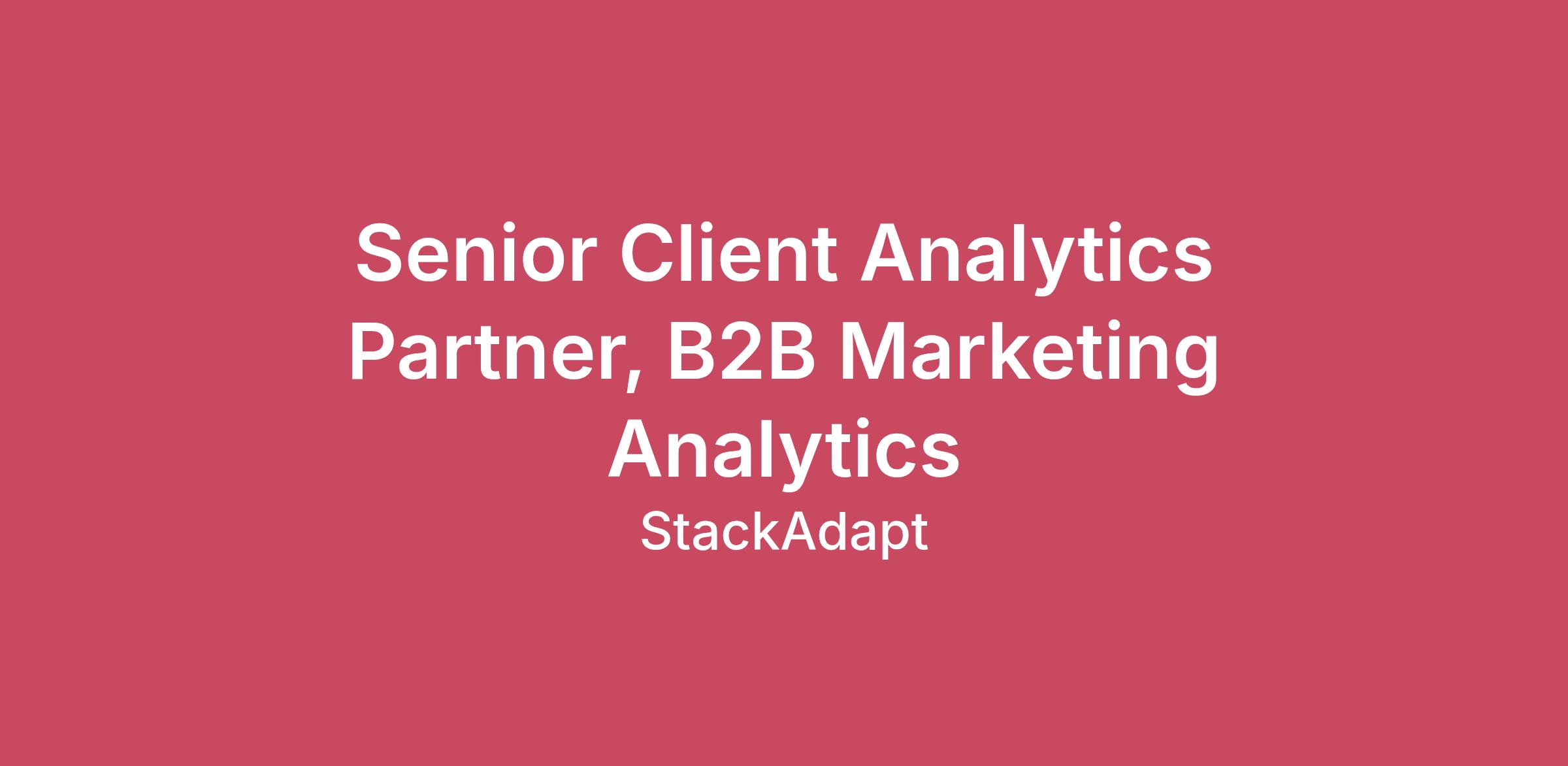 StackAdapt is the leading technology company that empowers marketers to reach, engage, and convert audiences with precision. With 465 billion automated optimizations per second, the AI-powered StackAdapt Marketing Platform seamlessly connects brand and performance marketing to drive measurable results across the entire customer journey. The most forward-thinking marketers choose StackAdapt to orchestrate high-impact campaigns across programmatic advertising and marketing channels. The Senior Client Analytics Partner, B2B Marketing Analytics plays a pivotal role in helping business-to-business clients understand how their media investment impacts lead generation, pipeline velocity, and revenue outcomes. This role requires both analytical rigor and the ability to guide clients through the nuances of B2B measurement — including multi-touch attribution, ABM reporting, and sales funnel diagnostics. As a senior member of the team, you’ll also coach peers, shape best practices, and represent StackAdapt in high-level client discussions and thought leadership. This new individual contributor role supports an emerging B2B vertical focus, and offers the chance to influence how modern B2B organizations measure success - partnering closely with senior marketers to connect media strategy to pipeline, revenue, and long-term growth. You will report to the Director, Client Analytics Partner. StackAdapt is a Remote First company, and we are open to candidates located either in Canada or in the US for this position. Please note: The Client Analytics Partner team is currently hiring for two Senior roles — Senior Client Analytics Partner, B2B Marketing Analytics, and Senior Client Analytics Partner, Ecommerce, Retail & CPG. We encourage candidates to review both job descriptions and apply to the role that best aligns with their background and domain expertise. What You'll Be Doing: Partner directly with B2B clients and internal teams to design measurement strategies that connect campaign performance to their marketing and business goals. Leverage reporting features, CRM integrations, and advanced analytics tools to uncover trends in lead quality, conversion velocity, and engagement. Translate complex datasets, including intent data, account scoring, and multi-touch attribution, into actionable insights and strategic recommendations. Lead senior-level client-facing deliverables, ensuring marketing and sales stakeholders have a shared view of performance impact. Guide test-and-learn strategies tailored for B2B, such as audience segmentation experiments, messaging effectiveness, and channel mix optimization. Navigate across the marketing technology and ad tech ecosystem (e.g., CRM, MAP, CDPs, attribution platforms) to ensure client analytics frameworks are connected, accurate, and actionable across systems. Mentor and coach junior analytics partners, enhancing the team’s knowledge of B2B measurement frameworks. Collaborate with cross-functional teams (Account Management, Sales, Product, Data Science) to evolve reporting capabilities and client-facing materials for B2B use cases. Author case studies, white papers, or thought leadership content that highlight innovative approaches to B2B analytics. What You'll Bring to the Table 5 to 7 years of experience in analytics, with at least 3 years focused on B2B marketing analytics, lead attribution, or pipeline reporting. Strong understanding of B2B marketing funnels, KPIs (MQL, SQL, pipeline contribution, deal velocity, win rates), and ABM strategies. Working knowledge of CRM and marketing automation tools (Salesforce, HubSpot, Marketo) and their reporting capabilities. Experience with multi-touch attribution models, intent data platforms, and account engagement analytics. Ability to translate complex datasets into actionable strategies that influence senior marketing and sales stakeholders. Expertise in test design and optimization in a B2B context, such as audience cohort testing or campaign sequencing. Familiarity with MarTech and ad tech platforms (e.g., CDPs, MAPs, CRM connectors, attribution platforms) and the ability to navigate complex ecosystems to support holistic B2B measurement. Experience integrating into MMM studies, interpreting results, and aligning fast moving metrics to longer term, slower metrics. Strong understanding of Marketing orchestration across different marketing platforms and channels, including programmatic, DOOH, Video, CTV, Email, and other online and offline channels. Advanced technical and data visualization skills (Tableau, PowerBI, SQL, R, Python, etc.), plus expert Excel proficiency. Strong communication and storytelling skills, with proven success in leading senior client discussions. Collaborative mindset and ability to mentor peers and contribute to team-wide growth. The compensation range listed for this role reflects the expected base salary for candidates located in Ontario, Canada. It is informed by market data and the approved budget for this position. StackAdapt maintains different compensation ranges for roles across other countries and regions, and final offers will be aligned to the candidate’s current location. This range represents base salary only. Depending on the role, candidates may also be eligible for additional compensation such as annual bonuses, commissions, equity awards, and a comprehensive benefits package. Factors Influencing Final Compensation: The final compensation offer will be determined by a variety of factors, which may include, but are not limited to: the candidate's specific experience, technical skills, knowledge, abilities, and relevant education, licensure, and certifications. Other business factors, such as organizational needs and budget alignment, may also be considered in the final offer. Ontario Residents Only$117,647—$139,706 CAD StackAdapter's Enjoy: Highly competitive salary Retirement/ 401K/ Pension Savings globally Competitive Paid time off packages including birthday's of