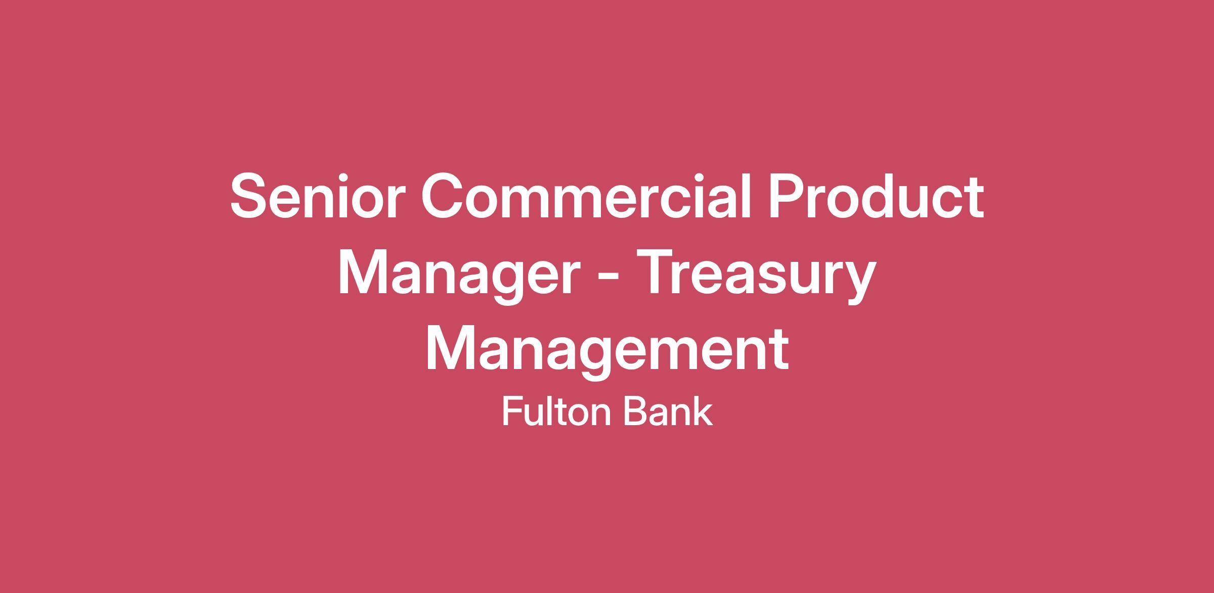 Value Proposition Our values define us and our culture inspires us to change lives for the better. Our employees are the heart and soul of our company, and every success we experience begins with them. Together we are committed to making a positive impact in our local communities. We champion a culture of continuous learning, work-life integration, and inclusion. We promote a digitally enabled work environment to continuously enhance the experience of our employees and customers. Overview This is a full-time, remote career opportunity supporting our Commercial banking teams based anywhere within the Fulton Bank footprint as follows: PA, NJ, MD, DE, VA, DC. Periodic travel to Lancaster, PA and for team/other scheduled meetings with line of business. The primary responsibility of this position is to manage the development, implementation and performance of one or more assigned Treasury Management banking products. The Product Manager will serve as the subject matter expert for the assigned product, ensuring the product is attractive, efficient, compliant, competitive and profitable; and has the ability to direct internal and external resources in efforts to maximize product success. Develop and implement overall product strategy, requiring project management and leadership of one or more product initiatives. The Senior Product Manager may be assigned to products with a higher degree of scope and complexity compared to the core level.Product Management is responsible for the development, implementation and on-going management of specific banking products. Activities include assessment of the competitive market, design and refinement of specific products, evaluation and selection of third party vendors, development of plans for marketing, positioning and pricing, analysis of product performance and on-going product improvement. Responsibilities Assess competitive marketplace to identify needs and banking opportunities, gain an understanding of competitor Treasury Management product offerings, positioning, pricing, etc.Lead product development process, establish milestones, timelines, conduct/oversee testing, evaluate internal processes and external vendors as requiredDevelop product implementation schedule, determine target markets, marketing strategies and introductory communications, establish product pricing, and ensure that sales and customer service are prepared to support the product as requiredCoordinate the day-to-day efforts of external partners, conduct regular meetings, lead product initiatives, ensure adherence to established terms regarding availability, performance, risk/security, and contribute to the evaluation and management of the overall FFC/vendor relationshipEvaluate Treasury Management product performance, including penetration, profitability and alignment with FFC’s goals and objectives, develop remedial recommendations to address any weaknesses or improve product performanceMay lead, oversee and direct the activities of other Product Managers, product-dedicated staff or work teams Qualifications EducationBachelor's Degree or the equivalent experience. Specialty: Business, marketing or other applicable. (Required)Experience5 or more years Product Management in Treasury Management. (Required) 7 or more years Banking, marketing or project management within financial services. (Preferred) Other Duties as Assigned by Manager This role may perform other job duties as assigned by the manager. Each employee of the Organization, regardless of position, is accountable for reading, understanding and acting on the contents of all Company-assigned and/or job related Compliance Programs, regulations and policies and procedures, as well as ensure that all Compliance Training assignments are completed by established due dates. This includes but is not limited to, understanding and identifying compliance risks impacting their department(s), ensuring compliance with applicable laws or regulations, and escalating compliance risks to the appropriate level of management. Pay Transparency To provide greater transparency to candidates, we share base salary ranges on all job postings regardless of state. We set standard salary ranges for our roles based on the position, function, and responsibilities, as benchmarked against similarly sized companies in our industry. Specific compensation offered will be determined based on a combination of factors including the candidate’s knowledge, skills, depth of work experience, and relevant licenses/credentials. The salary range may vary based on geographic location. The salary range for this position is $79,100.00 - $131,800.00 annually.Additional Compensation Components This job is eligible to participate in a short-term incentive compensation plan subject to individual and company performance. Benefits Additionally, as part of our Total Rewards program, Fulton Bank offers a comprehensive benefits package to those who qualify. This includes medical plans with prescription drug coverage; flexible spending account or health savings account depending on the medical plan chosen; dental and vision insurance; life insurance; 401(k) program with employer match and Employee Stock Purchase Plan; paid time off programs including holiday pay and paid volunteer time; disability insurance coverage and maternity and parental leave; adoption assistance; educational assistance and a robust wellness program with financial incentives. To learn more about your potential eligibility for these programs, please visit Benefits & Wellness | Fulton Bank. EEO Statement Fulton Bank (“Fulton”) is an equal opportunity employer and is committed to providing equal employment opportunity for all qualified persons. Fulton will recruit, hire, train and promote persons in all job titles, and ensure that all other personnel actions are administered, without regard to race, color, religion, creed, sexual orientation, national origin, citizenship, gender, gender identity, age, ge