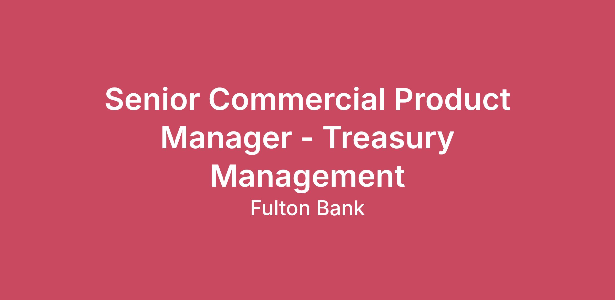 Value Proposition Our values define us and our culture inspires us to change lives for the better. Our employees are the heart and soul of our company, and every success we experience begins with them. Together we are committed to making a positive impact in our local communities. We champion a culture of continuous learning, work-life integration, and inclusion. We promote a digitally enabled work environment to continuously enhance the experience of our employees and customers. Overview This is a full-time, remote career opportunity supporting our Commercial banking teams based anywhere within the Fulton Bank footprint as follows: PA, NJ, MD, DE, VA, DC. Periodic travel to Lancaster, PA and for team/other scheduled meetings with line of business. This role is responsible for a portfolio of Commercial Treasury Management products/services (Digital Solutions, Payments & Fraud Solutions, Liquidity & Receivables Solutions, Loan Solutions) and will develop strategies to achieve enterprise strategic objectives. In addition to being responsible for the overall performance (P&L) of the assigned portfolio, this individual will coordinate with key business stakeholders to translate business needs into actionable strategies and function as a technical subject matter expert to drive growth within the commercial bank. Responsibilities Serves as the Treasury Management technical and strategic subject matter expert for multiple products/solutions, develops comprehensive strategies that effectively align with enterprise objectives, plans and manages the integrations between transactional systems, assesses competitive position and understands market forces, identifies emerging trends and technologies and provides thought leadership on emerging opportunities, builds user/customer journeys, and manages the performance and strategic/technical life cycle of assigned products/solutions.Manages the P&L for multiple products/solutions and is responsible for development of strategies to achieve established growth targets; leads engagement with sales teams on pricing and programs.Collaborates with business partners and stakeholders, agile development teams, and technology resources to execute on strategies for multiple products/solutions, to include participating as a key stakeholder in M&A activity (conversions, integrations, etc.), and special projects.Manages vendor relationships for multiple products/solutions, with responsibility to ensure vendor performance, adherence to contractual obligations, and evaluation of new features/functions introduced by each vendor; leads evaluation of vendor reviews, RFPs/RFIs, and negotiation of vendor contracts.Manages the risk associated with multiple products/solutions and collaborates with business partners and stakeholders to ensure that strategies for each product/solution effectively mitigate risk and are appropriately consistent with enterprise risk appetite. Qualifications EducationBachelor's Degree or the equivalent experience. Specialty: Business, finance or related field. (Required) Master's Degree or the equivalent experience. Specialty: business, finance or related field. (Preferred) Experience10 or more years business/commercial banking. (Required) 5 or more years Treasury Management product mangement in financial services. (Preferred) Knowledge, Skill, AbilitiesStrong understanding of financial products and services (Required)Strong understanding of regulatory requirements (Required)Strong leadership and stakeholder management (Required)Ability to analyze financial performance and develop reporting/projections (Required)Understanding of enabling technologies (API, RPA, etc.) (Required) Other Duties as Assigned by Manager This role may perform other job duties as assigned by the manager. Each employee of the Organization, regardless of position, is accountable for reading, understanding and acting on the contents of all Company-assigned and/or job related Compliance Programs, regulations and policies and procedures, as well as ensure that all Compliance Training assignments are completed by established due dates. This includes but is not limited to, understanding and identifying compliance risks impacting their department(s), ensuring compliance with applicable laws or regulations, and escalating compliance risks to the appropriate level of management. Pay Transparency To provide greater transparency to candidates, we share base salary ranges on all job postings regardless of state. We set standard salary ranges for our roles based on the position, function, and responsibilities, as benchmarked against similarly sized companies in our industry. Specific compensation offered will be determined based on a combination of factors including the candidate’s knowledge, skills, depth of work experience, and relevant licenses/credentials. The salary range may vary based on geographic location. The salary range for this position is $88,500.00 - $147,600.00 annually.Additional Compensation Components This job is eligible to receive equity in the form of restricted stock units. This job is eligible to participate in a short-term incentive compensation plan subject to individual and company performance. Benefits Additionally, as part of our Total Rewards program, Fulton Bank offers a comprehensive benefits package to those who qualify. This includes medical plans with prescription drug coverage; flexible spending account or health savings account depending on the medical plan chosen; dental and vision insurance; life insurance; 401(k) program with employer match and Employee Stock Purchase Plan; paid time off programs including holiday pay and paid volunteer time; disability insurance coverage and maternity and parental leave; adoption assistance; educational assistance and a robust wellness program with financial incentives. To learn more about your potential eligibility for these programs, please visit Benefits & Wellness | Fulton Bank. EEO Statement Fulton Bank (“F