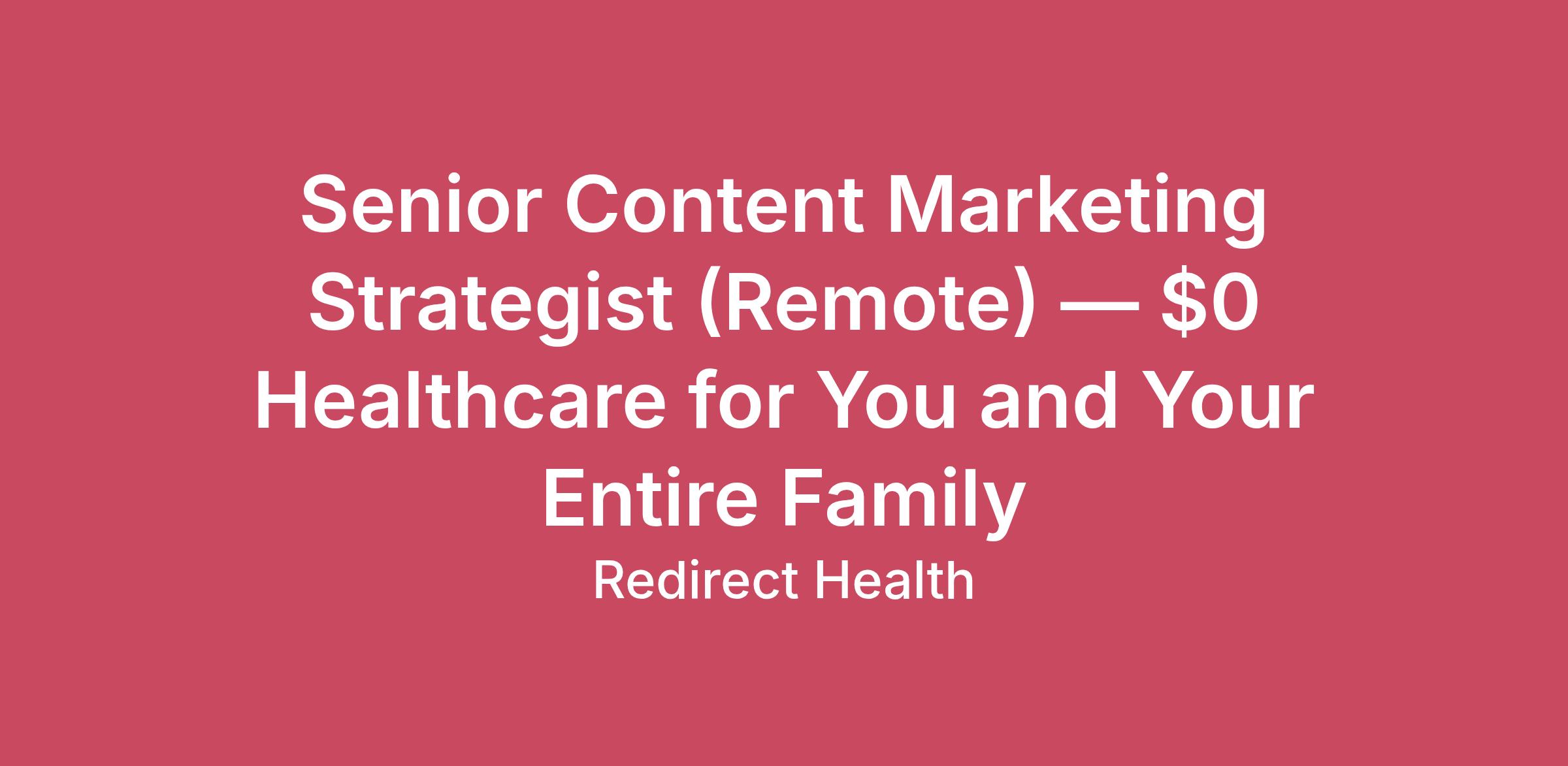 About This RoleSenior Content Marketing Strategist exists to shape the stories, resources, and thought leadership that help people understand healthcare differently—and trust Redirect Health as a guide in a complex system.In this role, you will:Serve individuals, families, small businesses, brokers, and internal teams through clear, credible, and compelling contentBe responsible for building and leading a multi-channel content strategy that supports brand trust, organic growth, and the full customer journeyDirectly impact how people discover, understand, and engage with affordable, accessible healthcareThis is a remote role for someone who:Enjoys strategic storytelling, editorial leadership, and hands-on executionTakes ownership and follows throughWants their work to have real-world impactWhat You’ll DoIn this role, you will:Leverage AI tools to support content creation and iteration while applying strong editorial judgment and proven copywriting frameworks.Own the comprehensive content strategy across website, blog, email, newsletters, social media, and long-form resourcesSupport Marketing, sales, and customer success teams with content that educates, builds trust, and supports every stage of the funnelCollaborate with the Director of Growth Marketing, Direct Response Copywriter/Strategist, SEO partners, design, product, sales, and customer success teamsImprove brand consistency, organic traffic, inbound leads, and audience engagement through high-quality, SEO-informed contentAdvocate for clear, human storytelling that makes healthcare easier to understand and positions Redirect Health as a trusted voiceA strong performer in this role is known for:Creating a consistent, high-quality publishing rhythm across channelsTranslating complex healthcare topics into clear, engaging narrativesDelivering measurable growth in organic traffic, engagement, and inbound demandHow Success Is MeasuredSuccess in this role is measured by:Success in this role is measured by:Growth in organic traffic, keyword rankings, and inbound leads driven by contentConsistency and quality of brand voice across all owned channelsEngagement metrics such as time on page, content consumption, and audience growthStrong collaboration and alignment across marketing, SEO, and paid teamsWhat We’re Looking ForWe’re looking for someone who:5+ years of experience in content strategy, editing, or editorial leadership, ideally in B2C or B2B2C environments.Experience using AI tools to enhance content and copy development, grounded in a strong understanding of marketing frameworks such as email sequences, funnels, and conversion-focused messaging.Proven ability to create and manage multi-channel editorial plans. Exceptional writing and editing skills with strong attention to detail, structure, and narrative cohesion. Experience collaborating with SEO teams or agencies; a solid understanding of SEO best practices. Strong ability to translate complex healthcare or technical topics into clear, engaging content. Comfortable managing multiple projects, deadlines, and stakeholder inputs. Experience working with CMS platforms, content tools, SEO software, and cross-functional teams. Including, HubSpot and Birdeye, Sprouts Social. Healthcare, insurance, or health tech background is a plus.Why Join Redirect HealthWhat “Free Healthcare” Actually MeansWhen we say free, we mean $0 out of your paycheck and $0 when you need care:$0 monthly premiums$0 to add your spouse or children$0 deductibles (we reimburse them)$0 out-of-pocket maximumsThis benefit alone can save families tens of thousands of dollars.What You’ll EarnStarting Salary: $85,000FREE healthcare for you and your entire familyDental & Vision insurancePaid time off & sick time401(k) accessA mission-driven team that believes in doing the right thingReady to Make a Difference?If you’re looking for more than just a job—and want to help reshape how healthcare works for families—we’d love to hear from you.