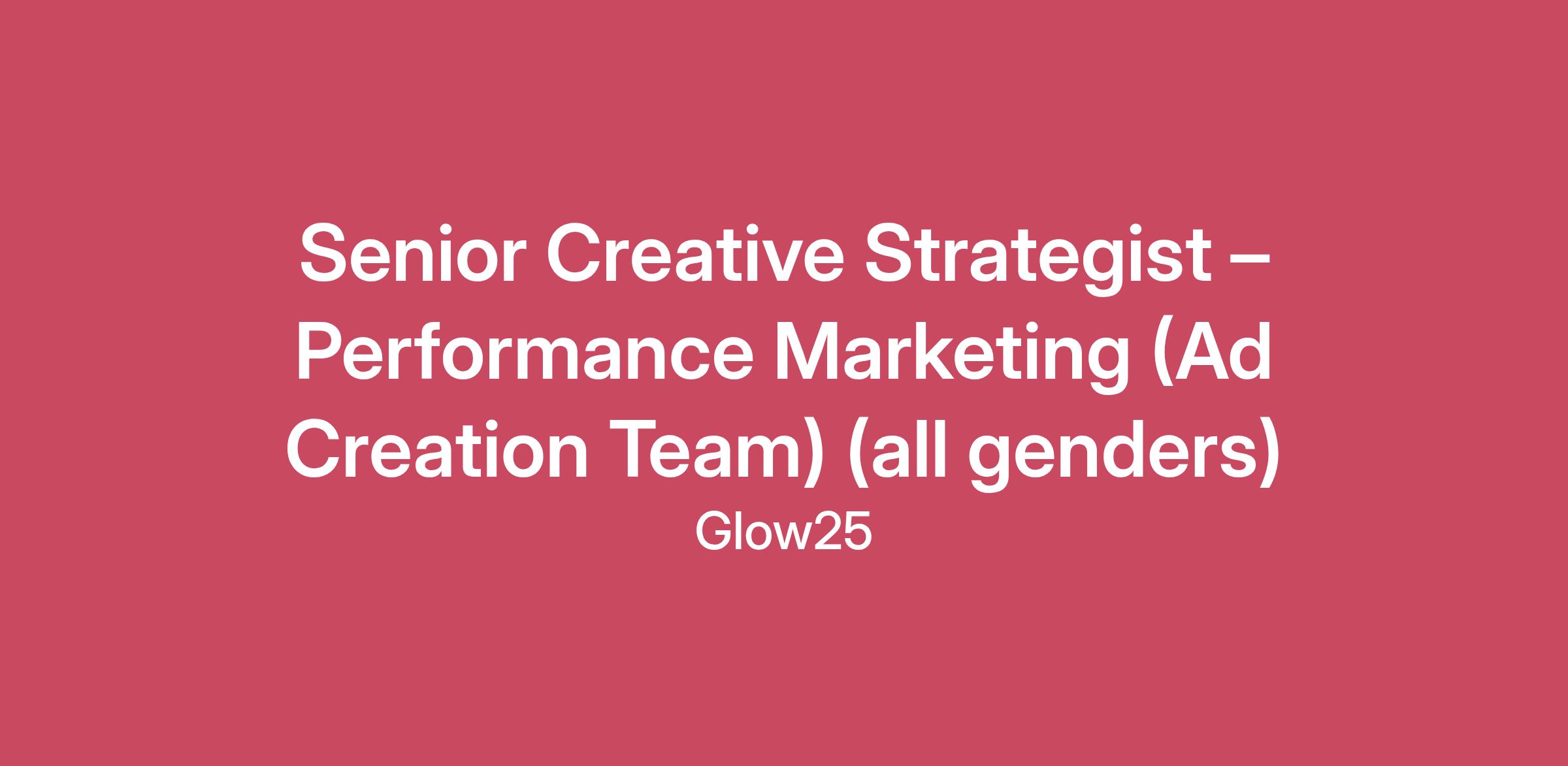 Welcome to Glow25!We are a dynamic, fast-growing beauty and pro-aging company based in Berlin.Our heartfelt mission: Glow moments that last — for our community and for us as a team.Work at Glow25 should inspire, excite, and be fun. That’s why we’re looking for smart, empathetic people who take ownership and grow with us.Join Glow25 and help us redefine beauty. We’re excited to meet you!These are our current challenges and future goals:Senior Creative Strategist in highly autonomous role within the Performance Marketing Ad Creation Team. You craft creative strategies, define acquisition angles, and optimize content across Meta, TikTok, Google/YouTube, Native, and partner page funnels. You collaborate closely with the Team Lead Ad Creation, Performance Marketing, Partner/Advertorial Pages, and the Creative Pod o produce standout assets with strong performance impact. Build for an international-first setup with structured cross-market knowledge transfer and asset sharing across all teams.This is where we need your support:You develop creative strategies, story angles, and messaging frameworks for paid channels and partner pages—spanning short-form and long-form formats, tailored for both video and written content.You translate customer insights and performance data into innovative, high-converting content ideas.You collaborate with the Team Lead Ad Creation, Performance Marketing, Partner Pages, and the Creative Pod to execute assets end-to-end.You write briefs, scripts, and hooks, and you oversee creative production.You continuously test and optimize content formats based on performance data.You stay ahead of platform trends and identify new opportunities for acquisition content.You own end-to-end project management for creative delivery, business-as-usual and campaign updates, including timelines, stakeholder alignment, and QA.You have the following experience:You're fluent in both German and English – native speaker or C1 level5+ years experience in performance-driven creative strategy (ideally D2C/beauty/wellness).Strong understanding of paid social and partner page creative mechanics.Proven track record of high-performing ads and funnel assets.Excellent storytelling, analytical thinking, and briefing skills.Fast, structured, performance-focused working style.That's something you can look forward to:Work flexibly, in the way that suits you best. Work when and where you’re most productive – with flexible hours and smart time tracking.Home office? Done right. We’ve got you covered: receive a one-time €500 allowance to set up your perfect workspace.Fully equipped from day one. Mac or Windows – you choose what works best for you.Glow Card – your monthly treat. Get €50 every month to spend however you like – that’s €600 a year, just because.Learning is part of the deal. Whether it’s our Glowcademy, dedicated learning time, or personal development support – we invest in you, not just in numbers.Let’s Glow! Enjoy 40% off our entire product range – yes, everything.Take a break – you’ve earned it. 30 vacation days + 1 personal holiday + up to 10 additional unpaid days off when you need a real reset. Oh, and New Year’s Eve? That’s a day off too!Stay healthy, stay glowing. Our company health insurance reimburses up to €600 per year for extras like vision aids, alternative medicine, or dental cleanings.Thinking ahead. After your probation period, we’ll contribute €600 toward your pension plan – and if you add more, we’ll top it up with an extra 20%.Exclusive partner perks. Get access to discounts and special offers from top brands through our corporate benefit platforms.Team spirit to go. Our Glow25 merch is more than just fabric – it’s your badge of belonging.Culture that truly shines. For five years in a row, we’ve been recognized as a Top Company on Kununu - proof of the strong, positive, and genuine culture we live every day.Move your way. From workouts to wellness retreats – you decide how to stay active. Choose between Urban Sports Club or Wellpass.Yay! You've made it this far!But there’s one more thing we want to say: Don’t hesitate! Especially if you’re a woman, or from an underrepresented group. Even if you don’t check every box, we want to encourage you to apply anyway. We believe that a diverse range of perspectives and experiences makes a team stronger – and the stronger our team is, the better we can fulfil our mission of helping people bring more energy into their daily lives.