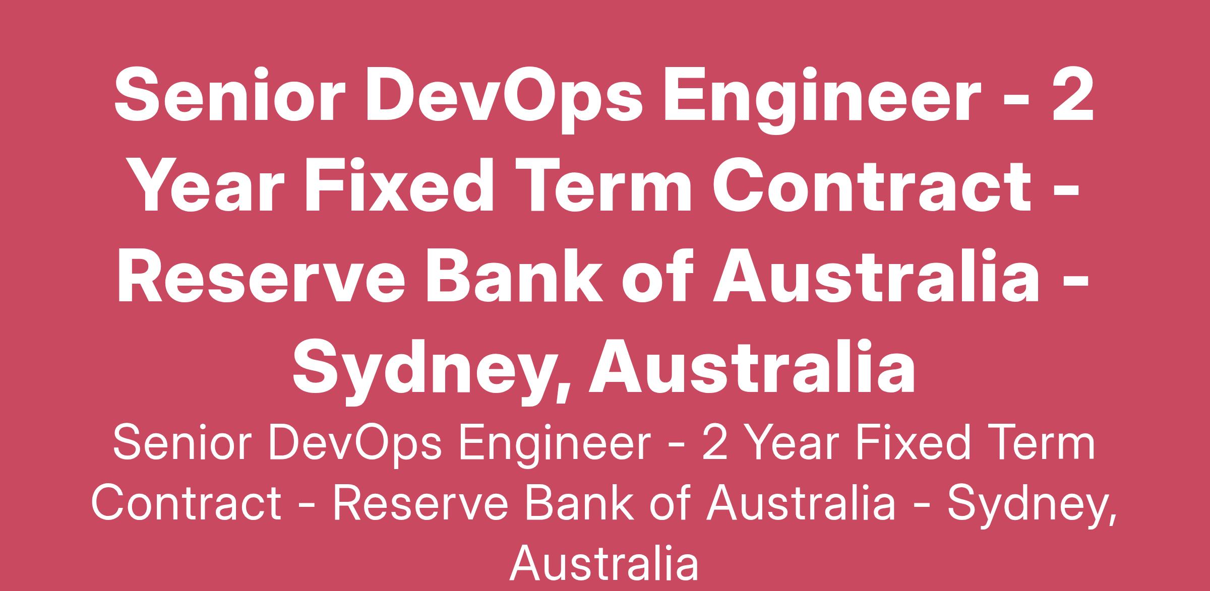 The Reserve Bank of Australia are hiring for a Senior DevOps Engineer on a 2 Year Fixed Term Contract. In this role, you will be a part of the Banking Systems team and part of the broader Information Technology department. This position will provide you with the opportunity to work and collaborate with developers, platform engineers and other DevOps engineers within the team.