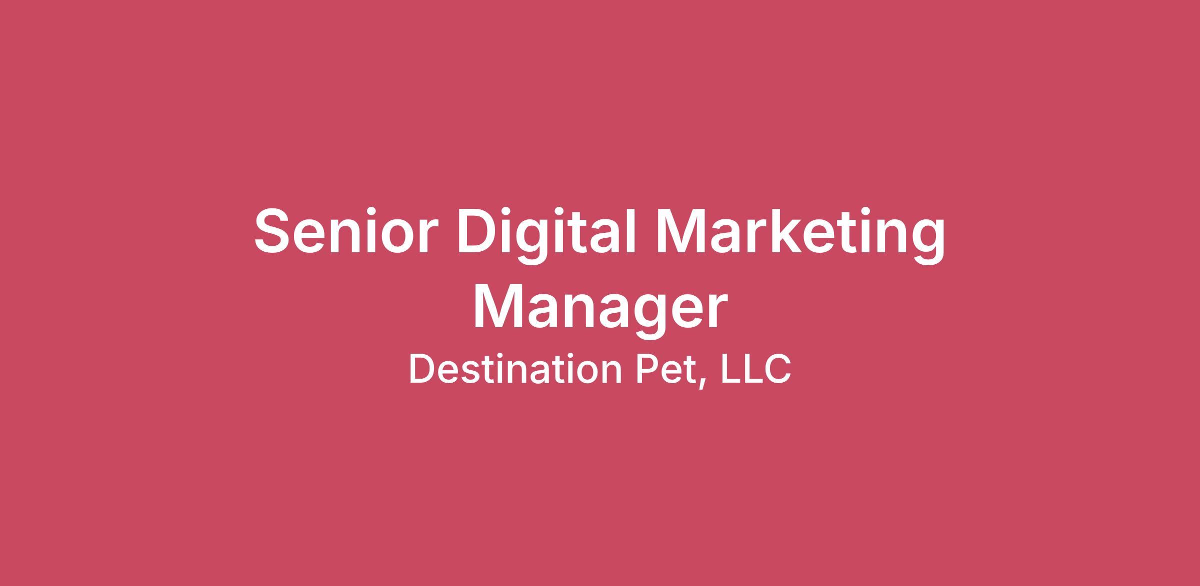 Welcome to Destination Pet. We are One Pack- a united team working together to elevate the love and lives of pet families. Our pet-obsessed professionals create a connected care network of trustworthy partners who bring creative innovation every day. We are revolutionizing the pet industry. Join us!LOCATION: Fully RemoteREPORTS TO: VP, Growth & Strategic MarketingSALARY : $90,000 - $104,000/ annuallyCORE RESPONSIBILITES:· Strategic Leadership & Cross-Functional Collaboration· Develop and oversee integrated digital marketing strategies that support business objectives, brand growth, and customer engagement· Own the paid media strategy and website UX (including some day-to-day maintenance/updates)· Act as a “general manager” and leader within the marketing organization to ensure plans are developed cohesively and executed in close collaboration with key cross-functional stakeholders (analytics, social, creative, etc.) to optimize campaigns.· Lead web UX strategy and content development, as well as SEO driving to the site· Advance Company efforts to show up more significantly as we transition from SEO to GEO, continuing to evolve brand pages to optimize positioning in search· Build brand awareness – in collaboration with partners across the organization· Lead digital efforts for customer acquisition and retention, optimizing campaigns for engagement, conversion, and loyalty customer acquisition & retention· Report and provide insights/recommendations on performance analytics and results· Serve as the main point of contact for ~10 centers, helping to facilitate any marketing needs within the groupREQUIREMENTS:Education & Experience:· 5+ years of experience in digital marketing, with a proven track record in SEO, paid media, social media, and website UX· A passion for site optimization, removing consumer friction and ensuring we are truly capturing what makes each center special on their landing pages· Demonstrated success advancing marketing strategy while also executing day-to-day work· Strong expertise in A/B testing, customer acquisition, and brand awareness strategies· High proficiency with analytical platforms such as Adobe Analytics and Google Analytics· Familiarity with HTML/CSS and website content management systems (CMS) like Adobe Experience in multi-location business marketing (e.g., franchises, service-based businesses like pet care or healthcare) preferred.· Passionate about pets and ensuring their pet parents have peace of mind that their pet is healthy, happy and safe while in our care!Skills:· Leadership experience with managing digital teams and agency partners (especially focused in site UX and SEO/SEM)· Experience with AEM Sites, AEM Assets, and Adobe Target, and/or a willingness to learn Strong analytical mindset with background using Google Analytics and Google Tag Manager· And/or desire to learn more about these platforms· Excellent verbal and communications skills· Great customer service mentality (i.e., speaking with a center manager and helping them is fun, not a chore)· A strong leader, throughout the department and with 1-2 director reports· Ability to analyze detailed data, synthesize key points and make data-driven decisions· Strong project management and organizational skills, including managing calendars/trackers, setting KPIs, and ensuring progress towards goals· Proven ability to collaborate with multiple stakeholders to enhance customer experience and marketing initiativesPERKS:· Health, vision, dental, long & short-term disability, and Life insurance· A Startup mentality company with stable funding· 401k match· Pet Care discounts· Flexible Time Off· Opportunity to grow your career with a network of like-minded professionalDestination Pet LLC affords equal employment opportunities to employees and applicants without regard to race, color, religion, sex, sexual orientation, gender identity, national origin, genetic information, age, disability or any other characteristic protected by federal, state or local law. Equal Opportunity Employer Minorities/Women/Veterans/Disabled.Destination Pet LLC endeavors to make our employment website and application process accessible to all users and applicants. In doing so, we provide reasonable accommodations to applicants with disabilities. If you have a disability and require a reasonable accommodation or assistance completing the application process, please contact a member of our recruitment team. At Destination Pet, we're all about creating a workplace that's bursting with diversity and inclusivity. We don't play favorites or judge folks based on skin color, religion, gender, age, disability, or any other protected characteristics. Our hiring decisions are solely based on what you can bring to the team. So, we're throwing the door wide open for all like-minded candidates who believe in celebrating and honoring diversity and inclusion. Ready to join our pack?