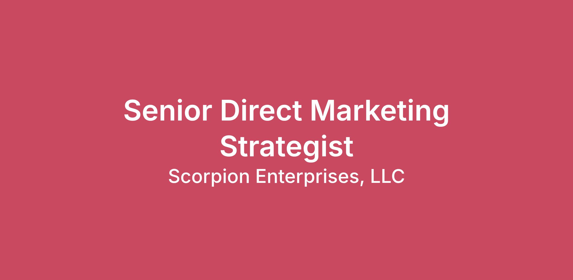 About Us Scorpion is the leading provider of technology and services helping local businesses thrive. We do this by helping customers understand local market dynamics, make the most of their marketing, and deliver experiences their customers will love. We offer tools to know what’s going on with marketing, competitors, and customers. We offer a unique blend of AI support and teams of real human people with local expertise committed to customer success. At Scorpion, we are ready to do whatever it takes to help our clients reach their goals. Our technology and personalized tools bring everything together to help local businesses easily understand their unique business, market, and customer needs. We put SEO, Reviews, Advertising, Email Marketing, Chat and Messaging, Social Media, Website, Lead Management, Appointment Scheduling, and more to work for local businesses. We’re a technology-led service with a human touch.About the Role As a Senior Direct Marketing Strategist, you will onboard and support clients using our Direct Marketing Services (DMS) while also serving as a strategic expert in lifecycle marketing, email marketing, and direct response. Your responsibilities span onboarding, post-launch client support, proactive engagement, and fostering client satisfaction through clear processes and collaborative efforts. In this role, you will elevate the sophistication of campaign planning and testing methodologies, guide performance analysis, and introduce best practices and optimization frameworks to enhance a team already strong in execution and client service. Through exceptional communication, expert guidance, and advanced marketing strategy, you will ensure clients maximize their ROI and that team metrics remain strong and consistent. What Your Success Will Look Like Lead the strategy, development, and optimization of multi-channel campaigns (email, SMS, direct mail) —including segmentation, A/B testing roadmap, and performance best practices for clients. Partner with internal creative, technical and client teams to guide messaging, targeting, and design overall campaign structures, ensuring email, SMS, and direct mail campaigns align with client objectives. Define and maintain campaign standards—including deliverability, compliance, and design guidelines. Track and analyze campaign performance metrics (open rates, unsubscribes, etc) and provide timely reporting and insights to leadership. Identify opportunities by using internal data, external research, and competitor benchmarking to enhance campaign effectiveness and the client experience, and provide insights and feedback to drive continuous improvement. Review and refine campaign content through editing, proofreading, and occasional copywriting to ensure accuracy and message alignment. Provide coordinated direction to offshore partners and serve as a knowledgeable resource for junior team members (without formal leadership responsibilities) to contribute to overall team skill building and operational excellence. Serve as the go-to expert for complex lifecycle marketing challenges, troubleshooting issues with segmentation, deliverability, workflows, and advanced campaign logic. Build and maintain audiences in ServiceTitan and develop expertise in ServiceTitan Marketing Pro to support advanced campaign needs. Who You Are And What You Bring Education Bachelor’s degree in Marketing, Communications, Business, or a related field — or equivalent experience. Experience 4+ years of experience in direct or lifecycle marketing, with proven ability to build and maintain multi-channel campaigns (email, SMS, reputation, direct mail) and contribute to strategy, messaging, testing, and optimization. Skills Strong proficiency with marketing automation tools, including ServiceTitan Marketing Pro or similar platforms, with the adaptability to learn new features and guide clients through evolving best practices. Analytical, data-driven approach with experience using performance metrics to identify trends, diagnose issues, and recommend improvements. Exceptional written and verbal communication skills, including strong writing and editing capabilities in direct response and client-facing contexts. Client-centric mindset with proactive engagement, strong problem-solving skills, and the ability to tailor solutions to meet client needs. Ability to operate independently, make informed recommendations, and serve as a knowledgeable resource for teammates (without formal leadership duties). Our Scorpion Values Winning Mindset: When our clients win, we win. Genuine Care: We only succeed when we are truly invested in our clients and each other. Unmatched Results: We deliver more than expected–and then some–driving the best results and impacting lives. Constant Improvement: We believe there is always a better way. We learn we ask “What if?” we build and then do it again. Unbeatable Teamwork: We come from different backgrounds but have the same vision. We only get there by doing it together, as a team. Compensation We acknowledge that states have passed legislation promoting pay transparency. As a national employer, Scorpion has made the decision to post our expected pay rate or pay range (as applicable) in all our job postings, regardless of geographic location. The base salary range is $75,000 (entry-level) - $85,000 (highly experienced), exclusive of fringe benefits. If you are hired at Scorpion, your final base salary compensation will be determined based on factors such as geographic location, skills, education, and/or experience. Additionally, we believe in the importance of pay equity and consider the internal equity of our current team members as a part of any final offer. Please keep in mind that the range mentioned above is the total salary range for the role. Hiring at the maximum of the range would not be typical in order to allow for future & continued salary growth. The compensation package may also include incentive compensati