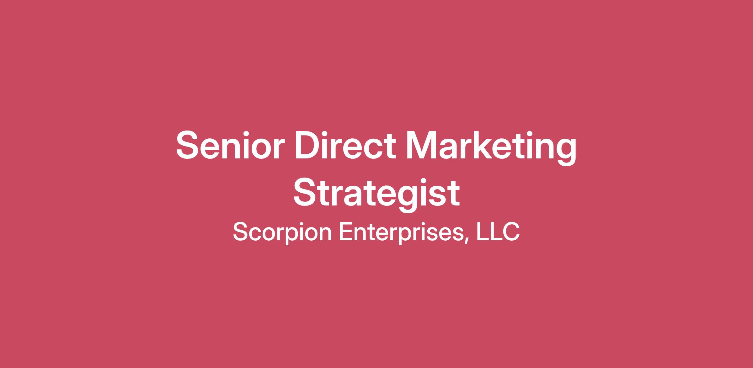 About Us Scorpion is the leading provider of technology and services helping local businesses thrive. We do this by helping customers understand local market dynamics, make the most of their marketing, and deliver experiences their customers will love. We offer tools to know what’s going on with marketing, competitors, and customers. We offer a unique blend of AI support and teams of real human people with local expertise committed to customer success. At Scorpion, we are ready to do whatever it takes to help our clients reach their goals. Our technology and personalized tools bring everything together to help local businesses easily understand their unique business, market, and customer needs. We put SEO, Reviews, Advertising, Email Marketing, Chat and Messaging, Social Media, Website, Lead Management, Appointment Scheduling, and more to work for local businesses. We’re a technology-led service with a human touch.About the Role As a Senior Direct Marketing Strategist, you will onboard and support clients using our Direct Marketing Services (DMS) while also serving as a strategic expert in lifecycle marketing, email marketing, and direct response. Your responsibilities span onboarding, post-launch client support, proactive engagement, and fostering client satisfaction through clear processes and collaborative efforts. In this role, you will elevate the sophistication of campaign planning and testing methodologies, guide performance analysis, and introduce best practices and optimization frameworks to enhance a team already strong in execution and client service. Through exceptional communication, expert guidance, and advanced marketing strategy, you will ensure clients maximize their ROI and that team metrics remain strong and consistent. What Your Success Will Look Like Lead the strategy, development, and optimization of multi-channel campaigns (email, SMS, direct mail) —including segmentation, A/B testing roadmap, and performance best practices for clients. Partner with internal creative, technical and client teams to guide messaging, targeting, and design overall campaign structures, ensuring email, SMS, and direct mail campaigns align with client objectives. Define and maintain campaign standards—including deliverability, compliance, and design guidelines. Track and analyze campaign performance metrics (open rates, unsubscribes, etc) and provide timely reporting and insights to leadership. Identify opportunities by using internal data, external research, and competitor benchmarking to enhance campaign effectiveness and the client experience, and provide insights and feedback to drive continuous improvement. Review and refine campaign content through editing, proofreading, and occasional copywriting to ensure accuracy and message alignment. Provide coordinated direction to offshore partners and serve as a knowledgeable resource for junior team members (without formal leadership responsibilities) to contribute to overall team skill building and operational excellence. Serve as the go-to expert for complex lifecycle marketing challenges, troubleshooting issues with segmentation, deliverability, workflows, and advanced campaign logic. Build and maintain audiences in ServiceTitan and develop expertise in ServiceTitan Marketing Pro to support advanced campaign needs. Who You Are And What You Bring Education Bachelor’s degree in Marketing, Communications, Business, or a related field — or equivalent experience. Experience 4+ years of experience in direct or lifecycle marketing, with proven ability to build and maintain multi-channel campaigns (email, SMS, reputation, direct mail) and contribute to strategy, messaging, testing, and optimization. Skills Strong proficiency with marketing automation tools, including ServiceTitan Marketing Pro or similar platforms, with the adaptability to learn new features and guide clients through evolving best practices. Analytical, data-driven approach with experience using performance metrics to identify trends, diagnose issues, and recommend improvements. Exceptional written and verbal communication skills, including strong writing and editing capabilities in direct response and client-facing contexts. Client-centric mindset with proactive engagement, strong problem-solving skills, and the ability to tailor solutions to meet client needs. Ability to operate independently, make informed recommendations, and serve as a knowledgeable resource for teammates (without formal leadership duties). Our Scorpion Values Winning Mindset: When our clients win, we win. Genuine Care: We only succeed when we are truly invested in our clients and each other. Unmatched Results: We deliver more than expected–and then some–driving the best results and impacting lives. Constant Improvement: We believe there is always a better way. We learn we ask “What if?” we build and then do it again. Unbeatable Teamwork: We come from different backgrounds but have the same vision. We only get there by doing it together, as a team. Compensation We acknowledge that states have passed legislation promoting pay transparency. As a national employer, Scorpion has made the decision to post our expected pay rate or pay range (as applicable) in all our job postings, regardless of geographic location. The base salary range is $75,000 (entry-level) - $85,000 (highly experienced), exclusive of fringe benefits. If you are hired at Scorpion, your final base salary compensation will be determined based on factors such as geographic location, skills, education, and/or experience. Additionally, we believe in the importance of pay equity and consider the internal equity of our current team members as a part of any final offer. Please keep in mind that the range mentioned above is the total salary range for the role. Hiring at the maximum of the range would not be typical in order to allow for future & continued salary growth. The compensation package may also include incentive compensati