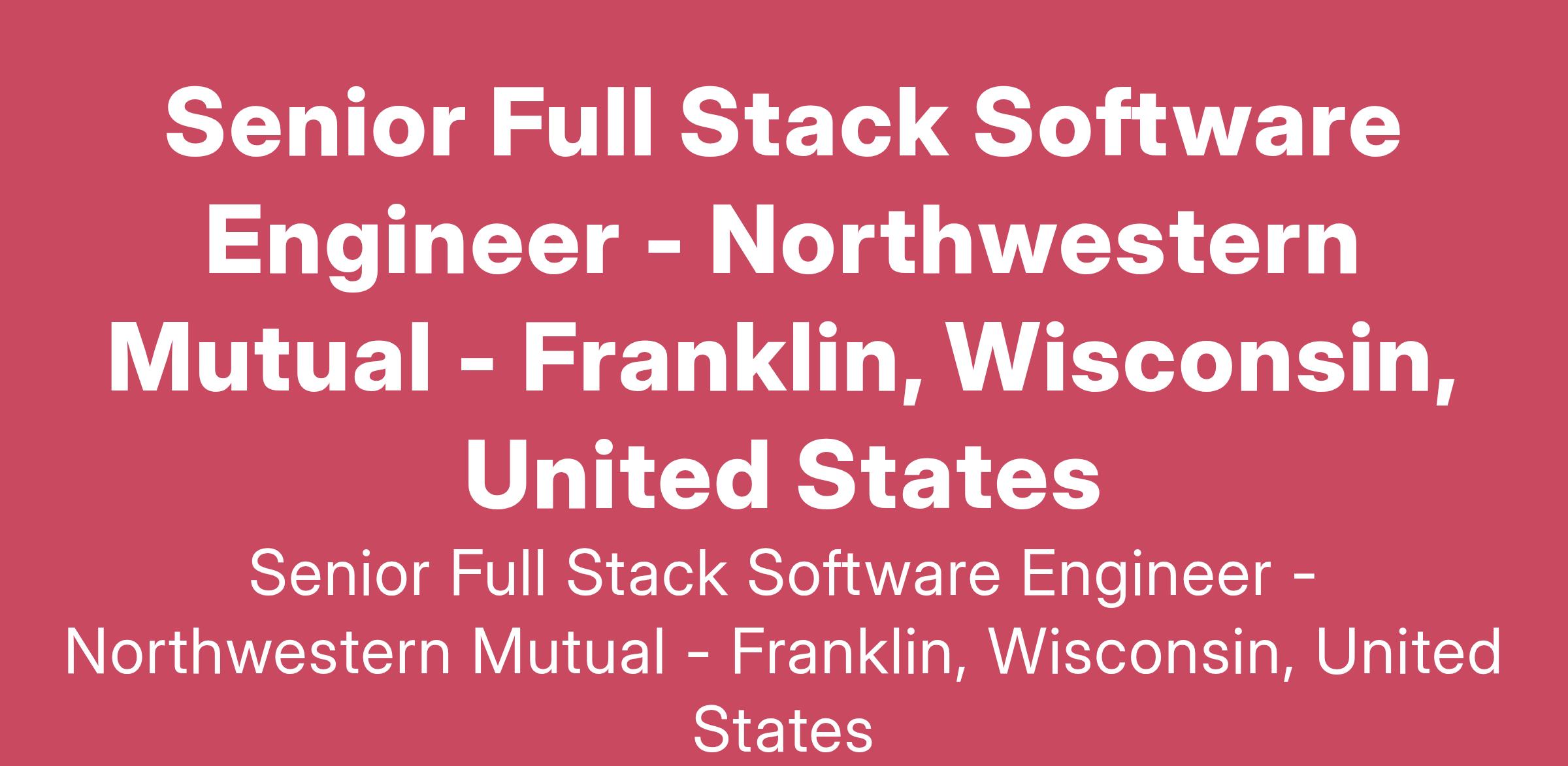 Northwestern Mutual Senior Full Stack Software Engineer involved in the DevOps movement, represents a unique hands-on opportunity to work on various web-based products, and teams, that integrate over many various systems. We use some of the latest and greatest technologies and are fast pace environment focused on delivering customer value with iterative and continuous cadence. Our team fosters collaboration, passion for learning and ownership.