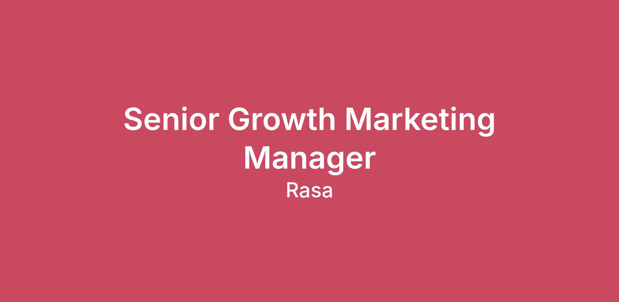 Your turn to start the conversation.Write the future at Rasa.Conversation. It’s the thread between our product and our people. The tool that enables us to forge relationships through compassion and expertise. To find the connection between our differences. It keeps us close together across borders and backgrounds and helps us create our shared vision.Rasa means tight-knit. We get to the point and have the courage to ask ‘why?’. Because through relentless experimentation, passion, and vision, we’re transforming the way people interact with organizations through AI.That’s Rasa. That’s our message.Join us and add yours.SUMMARYWe're looking for a Growth Gen Marketing Manager to join our Marketing team. You'll be a generalist marketer who orchestrates our marketing efforts—designing and running experimentation-driven campaigns across the full customer funnel, using data to identify what's working, scale it, and cut what isn't. With the help of AI and a finger on the pulse of rapid shifts in marketing, you'll collaborate closely with sales, product, and customer success to improve conversion rates and accelerate pipeline growth. You will be reporting to the Senior Director, Marketing.Full-time - 100% remote - Location: USA (EST or CT time zones)This is a remote position, but we cannot hire anybody outside of the USA for this position.Rasa can not assist with work authorization (visa sponsorship) for this position.ABOUT THIS ROLEWe’re a startup, so you’ll have to be comfortable rolling up your sleeves and doing whatever is required to support our mission. We're prioritizing growth marketing to meet ambitious growth targets. We need someone who can bring a rapid-testing, data-driven approach to optimize every stage of the customer journey. As a Growth Gen Marketing Manager, you'll make an impact on your team by:Campaign orchestration: Design and run integrated, multi-channel campaigns that combine fuel (content, creative, messaging) with engine (distribution and channels) across Google, LinkedIn, Meta, and other paid media platformsAI-powered execution: Use AI tools, workflows, and agents to extend capabilities, improve velocity, and scale output—while maintaining a high quality bar.Audience-first strategy: Start with a deep understanding of our audience and market. Use insights (powered by AI + human research) to guide positioning, differentiation, and campaign priorities.Cross-functional connector: Work across product, sales, customer success, and leadership to align on priorities, improve conversion rates, and ensure marketing efforts ladder up to company goalsFocus on high-impact work: Set a strategy and build a roadmap around high-impact programs and campaigns, not around isolated channels and a scattered content ideasKPIs & efficiency: Owning key growth metrics, including conversion rates, pipeline velocity, and revenue attributionABOUT YOUYou're naturally curious and love finding the signal in the noise—turning data into insights and insights into actionYou're excited about using AI and new tools to work smarter, move faster, and drive efficiency—and you can teach and scale these practices across a teamYou understand that speed matters - you ship fast, learn quickly, and iterate relentlessly5–8+ years of experience in B2B startup marketing with a strong foundation in growth, demand gen, or performance marketing and exposure to other subfunctions (product marketing, content, brand)Track record of designing and running cross-channel campaigns with measurable impact, including experience with A/B testing and funnel optimizationStrong analytical skills and proficiency with marketing analytics tools (Google Analytics, Mixpanel, Amplitude) and marketing automation platformsScrappy and adaptable: thrives in ambiguous environments, comfortable rolling up sleeves and experimentingCollaborative connector who can align product, GTM, and leadership teams around shared goalsPlease keep in mind that we are describing the background that would best fit the role. Even if you don’t meet all the requirements, yet you are confident that you are up for the task, we absolutely want to get to know you!MEET YOUR TEAMYou'll be joining a small, nimble marketing team that punches above its weight. The team includes an Events Lead, Content, and is led by the Senior Director of Marketing.WHAT YOU CAN EXPECT FROM USFlexible hours and a dedicated remote budgetA stipend for professional development & 6 paid education days to help you grow within your roleUnlimited PTO + paid sick leave + paid public holidaysA Macbook, and other tech to help you do your jobWe have regular remote team events, as well as an annual company-wide offsiteHealth benefits401(k) contribution with up to 4% matchEquity optionsYou can find more information about our benefits per location here: Rasa Perks & BenefitsABOUT USRasa is a leader in generative conversational AI, enabling enterprises to build and deliver next-level AI assistants. Merging a state-of-the-art engine with a user-friendly no-code UI, Rasa offers an open and adaptable platform that perfectly aligns with business logic. This innovative approach makes Rasa a reliable and trusted choice for enterprises seeking to enhance customer interactions while reducing costs. Rasa is privately held with funding from StepStone, PayPal, Accel, Andreessen Horowitz, Basis Set Ventures, and others. The company was founded in 2016 and is remote-first with a global presence.FREQUENTLY ASKED QUESTIONSYou can find answers to FAQs from candidates about this role specifically on our Senior Growth Marketing FAQs sheet.Rasa is an equal opportunity employer. We are still a small team and are committed to growing in an inclusive manner. We want to augment our team with talented, compassionate people irrespective of race, color, religion, national origin, sex, physical or mental disability, or age.Please be mindful of the hiring location(s) listed. You must be located in and a resid