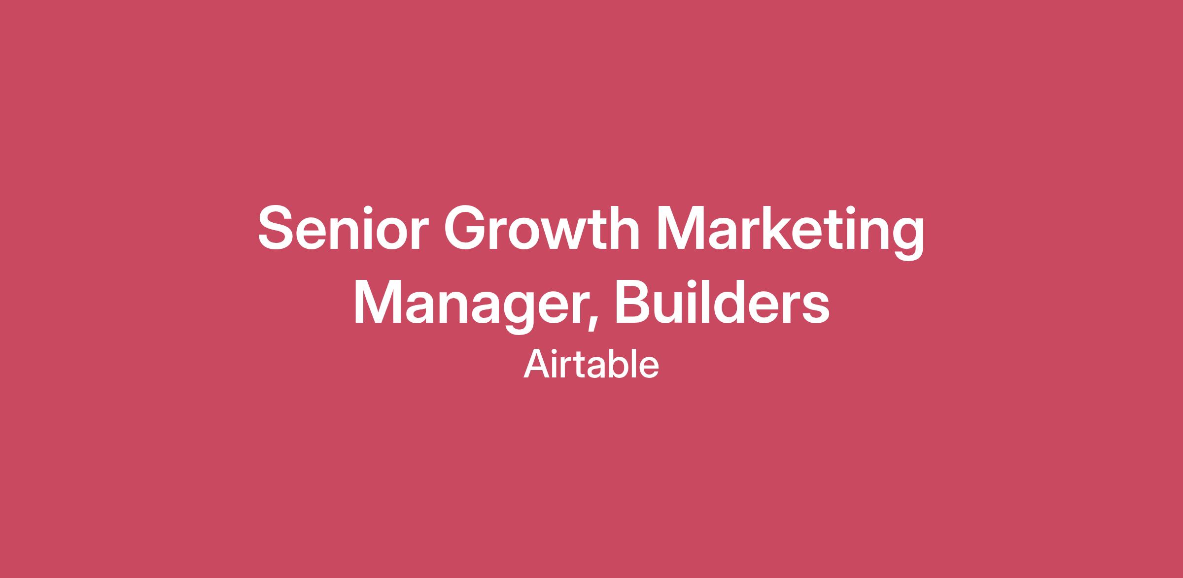 Airtable is the no-code app platform that empowers people closest to the work to accelerate their most critical business processes. More than 500,000 organizations, including 80% of the Fortune 100, rely on Airtable to transform how work gets done.We’re seeking a results-oriented Senior Growth Marketing Manager, Builders to drive user activation and adoption of Airtable. You’ll own the post-signup journey for both new users and existing builders, turning initial curiosity into lasting engagement, cultivating champions, and ultimately generating sales-ready opportunities for our sales-led GTM motion and pipeline generation. In this role, you will design and run growth experiments that guide builders through their AI journey, from discovering their first AI-powered use case to scaling advanced workflows and becoming champions of Airtable. You will shape how the next generation of builders adopts AI by creating the moments of “wow” that turn curiosity into confidence and confidence into lasting impact. This is an opportunity to inspire thousands of builders to unlock the possibilities with AI in Airtable and, in doing so, fuel the company’s next wave of growth. What You’ll Do Own the Builder Journey: Shape the strategy for how builders engage with Airtable, from building inspiring webinars to scalable campaigns that educate and activate. Partner closely with Lifecycle and Marketing Operations teams to develop evergreen and triggered campaigns that help builders adopt AI-powered workflows and get more value from Airtable. Innovate with our tech stack: Explore and implement new ways to use marketing tools and automation to encourage adoption, deepen engagement, and deliver more personalized builder experiences. Innovate and continuously test new growth channels, tooling, messaging, and creative approaches, ensuring the team stays ahead in a competitive AI landscape Experiment and grow: Design and test data-driven A/B experimentations to boost builder activation, engagement, and conversion into long-term champions. Partner with Product and Data teams to align on activation experimentations, onboarding and education flows and lead sophistication programs. Collaborate across teams: Partner with Product, Product Marketing, Community, and channel teams to align programs with builder needs and ensure a seamless experience. Measure and improve: Track performance, uncover insights, and double down on what drives meaningful product growth. Define and monitor growth KPIs across marketing and digital channels Who You Are A growth marketer with 6–8+ years of experience in lifecycle, growth, or demand generation, ideally in a SaaS or PLG environment. Skilled in activation and adoption marketing, with a track record of moving users from sign-up to sustained product usage. Experienced in running growth experiments with Data teams and analyzing funnel metrics to inform strategy. Analytical and data-driven: Skilled at connecting the dots across data sources and turning insights into clear stories that guide strategy and inspire action. Strong storyteller who can create content and campaigns that showcase AI-powered use cases and inspire action. Highly collaborative, with the ability to work across Product, Community, and Sales to deliver builder impact. Comfortable managing multiple programs at once—evergreen campaigns, nurture flows, and live/on-demand education—while keeping a bias for speed and iteration. Airtable is an equal opportunity employer. We embrace diversity and strive to create a workplace where everyone has an equal opportunity to thrive. We welcome people of different backgrounds, experiences, abilities, and perspectives. All qualified applicants will receive consideration for employment without regard to race, color, religion, sex, sexual orientation, gender identity, national origin, disability, protected veteran status or any characteristic protected by applicable federal and state laws, regulations and ordinances. Learn more about your EEO rights as an applicant. VEVRAA-Federal Contractor If you have a medical condition, disability, or religious belief/practice which inhibits your ability to participate in any part of the application or interview process, please complete our Accommodations Request Form and let us know how we may assist you. Airtable is committed to participating in the interactive process and providing reasonable accommodations to qualified applicants. Compensation awarded to successful candidates will vary based on their work location, relevant skills, and experience. Our total compensation package also includes the opportunity to receive benefits, restricted stock units, and may include incentive compensation. To learn more about our comprehensive benefit offerings, please check out Life at Airtable.For work locations in the San Francisco Bay Area, Seattle, New York City, and Los Angeles, the base salary range for this role is:$153,000—$200,000 USDFor all other work locations (including remote), the base salary range for this role is:$138,000—$180,000 USDPlease see our Privacy Notice for details regarding Airtable’s collection and use of personal information relating to the application and recruitment process by clicking here. Stay Safe from Job ScamsAll official Airtable communication will come from an @airtable.com email address. We will never ask you to share sensitive information or purchase equipment during the hiring process. If in doubt, contact us at hr@airtable.com. Learn more about avoiding job scams here.