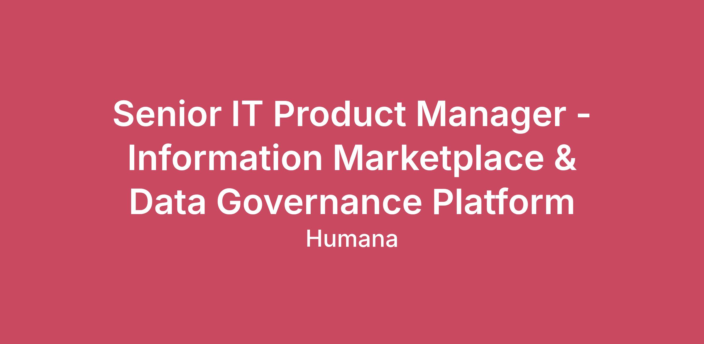 Become a part of our caring community and help us put health first The Senior IT Product Manager – Information Marketplace & Data Governance is responsible for the strategic vision, roadmap, and execution of the Information Marketplace and its ecosystem of integrated enterprise capabilities. This role owns the end-to-end product lifecycle for the Information Marketplace as well as integrations with its supporting capabilities, data discovery, data quality and observability, metadata management, data cataloging, semantic enablement, and governed data usage processes such as the Protected Information Review Council (PIRC).The Information Marketplace serves as the front door and starting off point for finding and understanding Humana's data. It serves a large role in day-to-day data usage and management processes and that role will continue to expand and evolve.The Senior IT Product Manager partners closely with data governance leadership, architecture, engineering, security, compliance, and business stakeholders to ensure these capabilities operate as a cohesive, scalable product that enables trusted data use, risk reduction, and business value realization. They will create, prioritize and manage product backlogs with a focus on iteration and scalability. They will directly influence department strategy and make decisions on moderately complex to complex issues regarding technical and non-technical approaches for project components. Work will be performed without direction and considerable latitude will need to be exercised in determining objectives and approaches. Detailed ResponsibilitiesProduct Strategy & VisionDefine and own the long-term product vision and roadmap for the Information Marketplace and its integration to supporting capabilities and processes.Translate enterprise data governance, compliance, and analytics strategies into actionable product capabilities and prioritized initiatives.Act as the product authority for how data discovery, quality, observability, metadata management, and semantic layers work together as a unified experience.Information Marketplace OwnershipOwn the Information Marketplace as a core enterprise product, including user experience, adoption, scalability, and extensibility.Ensure the Marketplace enables intuitive discovery of curated and un-curated data assets.Drive continuous improvement of Marketplace capabilities based on usage analytics, stakeholder feedback, and emerging governance trends.Platform Integrations & Ecosystem ManagementLead integration strategy and execution across platforms supporting:Data quality and observabilityData cataloging and metadata managementData lineage and impact analysisSemantic layers and business term enablementWorkflow and approval processes (e.g., PIRC)Partner with architecture and engineering teams to ensure integrations are scalable, secure, resilient, and aligned with enterprise standards.Manage dependencies across internal platforms, vendor tools, and custom-built solutions.Stakeholder Engagement & LeadershipServe as the primary product interface between data governance leadership and stakeholders.Facilitate prioritization decisions.Communicate product strategy, roadmap progress, and outcomes to executive and senior leadership audiences.Delivery & ExecutionOwn and manage the product backlog, ensuring clear articulation of epics, features, and acceptance criteria.Partner with agile delivery teams to ensure timely, high-quality execution of product initiatives.Define and track success metrics related to adoption, data trust, operational efficiency, and risk reduction.Use your skills to make an impact Required Qualifications8+ years of experience in product management, technology product ownership, or platform leadership roles.Proven experience managing complex, enterprise-scale platforms with multiple integrations and stakeholders.Demonstrated success owning products across the full lifecycle, from strategy and vision through delivery and adoption.Ability to work effectively with architects and engineers on integration patterns, APIs, metadata flows, and platform interoperability.Experience operating in hybrid or multi-platform environments, including vendor tools and custom-built solutions.Exceptional stakeholder management skills, with the ability to influence without direct authority.Preferred QualificationsStrong understanding of data governance concepts, including metadata management, data quality, data lineage, and data stewardship.Experience with data discovery, data cataloging, or information marketplace-style platforms.Familiarity with compliance-driven data usage processes (e.g., privacy reviews, data access approvals, risk assessments).Strong understanding of how semantic layers, business glossaries, and metadata drive analytics and AI enablement.Strong executive communication skills, including the ability to translate complex technical concepts into business outcomes.Experience supporting regulated industries (e.g., healthcare, financial services, insurance).Exposure to data observability platforms, data quality automation, or AI-enabled governance capabilities.Experience operationalizing governance processes through workflow tools or custom platforms.Travel: While this is a remote position, occasional travel to Humana's offices for training or meetings may be required.Scheduled Weekly Hours40Pay RangeThe compensation range below reflects a good faith estimate of starting base pay for full time (40 hours per week) employment at the time of posting. The pay range may be higher or lower based on geographic location and individual pay will vary based on demonstrated job related skills, knowledge, experience, education, certifications, etc. $104,000 - $143,000 per year This job is eligible for a bonus incentive plan. This incentive opportunity is based upon company and/or individual performance.Description of BenefitsHumana, Inc. and its affiliated subsidiaries (collectively, “Humana”) offers competi