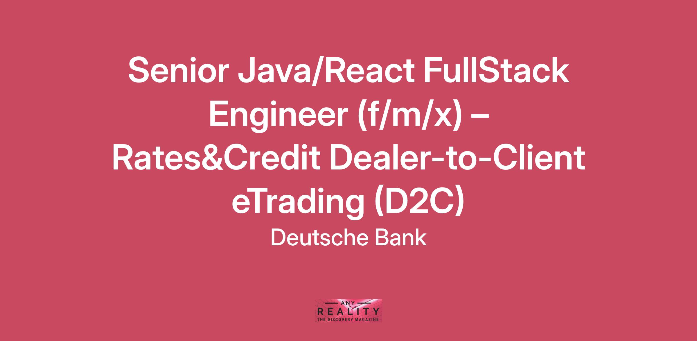 Job Description:About the jobDeutsche Bank Technology in BerlinDB Technology is a global team of tech specialists, spread across multiple trading hubs and tech centers across the globe. We focus on promoting technical excellence – our engineers work at the forefront of financial services innovation using cutting-edge technologies.Our Berlin location is the newest addition to our global network of tech centers and is growing strongly. We are committed to building a diverse workforce and to creating excellent opportunities for talented engineers and technologists. Our tech teams work agile in close coordination with our business units, jointly creating #GlobalHausbank solutions from our home market.Rates&Credit Dealer-to-Client eTrading (D2C) ModernisationThe D2C platform provides liquidity on Bonds, Rates Derivatives, Credit Derivatives, Repo, and ETFs to Deutsche Bank’s Institutional Clients. It connects with 10+ leading multi-dealer platforms, streamlining electronic and voice trading requests, routing liquidity to relevant Trading desks, and automating execution logic.As part of our platform modernization program, we are re-architecting key components, building modern React-based web UIs, and migrating services to the cloud to enhance scalability, resilience, and client experience.As a Senior Java/React FullStack Engineer (f/m/x), you will play a key role in this transformation, working across backend and frontend to deliver the next generation of Deutsche Bank’s electronic trading capabilities.→ You love this job but feel you cannot tick 100% of the boxes? Send us your CV anyway!Your key responsibilitiesDesign and implement technical solutions for platform modernization and cloud migrationDevelop new React-based web interfaces and integrate them with existing trading servicesEnhance and maintain backend services in Java, ensuring performance, scalability, and reliabilityCollaborate with architects, UI/UX designers, and product owners to deliver high-quality featuresProvide L3 support of the platform – analyze and diagnose production issues (periodic rotation of teams)Contribute to process improvements and best practices in software development and deliveryYour skills and experiencesStrong problem-solving skills and ability to work in an agile, collaborative environmentStrong knowledge of Java (collections, multi-threading, networking) with many years of working experienceHands-on experience with React and modern frontend development practicesFamiliarity with containerization (Docker, Kubernetes) and cloud platforms (AWS, GCP, or Azure)Basic knowledge of SQL relational databases solutions and LinuxExperience in design and development of distributed, cloud-ready applications and knowledge of messaging technologies (JMS, Solace, IBM MQ or similar) is a plusWhat we offerWe provide you with a comprehensive portfolio of benefits and offerings to support both, your private and professional needs.Emotionally and mentally balancedA positive mind helps us master the challenges of everyday life – both professionally and privately. We offer consultation in difficult life situations as well as mental health awareness trainings.Physically thrivingWe support you in staying physically fit through an offering to maintain personal health and a professional environment. You can benefit from health check-ups; vaccination drives as well as advice on healthy living and nutrition.Socially connectedNetworking opens up new perspectives, helps us thrive professionally and personally as well as strengthens our self-confidence and well-being. You can benefit from PME family service, FitnessCenter Job, flexible working (e.g parttime, hybrid working, job tandem) as well as an extensive culture of diversity, equity and inclusion.Financially secureWe provide you with financial security not only during your active career but also for the future. You can benefit from offerings such as pension plans, banking services, company bicycle or “Deutschlandticket”.Since our offerings slightly vary across locations, please contact your recruiter with specific questions.This job is available in full and parttime.In case of any recruitment related questions, please get in touch with Luisa Moderzinski.Contact Luisa Moderzinski: 0151 56516413We strive for a culture in which we are empowered to excel together every day. This includes acting responsibly, thinking commercially, taking initiative and working collaboratively.Together we share and celebrate the successes of our people. Together we are Deutsche Bank Group.We welcome applications from all people and promote a positive, fair and inclusive work environment.