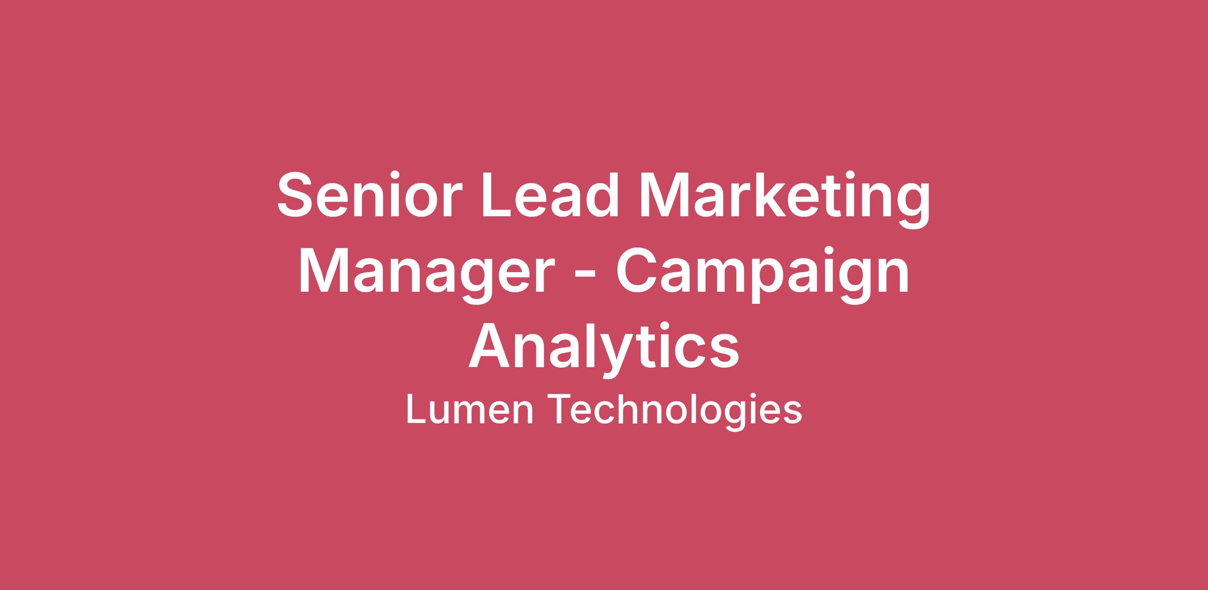 About LumenLumen connects the world. We are igniting business growth by connecting people, data and applications – quickly, securely, and effortlessly. Together, we are building a culture and company from the people up – committed to teamwork, trust and transparency. People power progress. We’re looking for top-tier talent and offer the flexibility you need to thrive and deliver lasting impact. Join us as we digitally connect the world and shape the future.The Role The Senior Lead Marketing Manager resides within Campaigns & Programs and reports to the Analytics Team. Campaign Analytics delivers analysis, insights, and recommendations on campaign and program performance on both a proactive and reactive basis using a range of analysis techniques to inform and optimize our marketing tactics. This is a highly visible role that requires strong project management, reporting proficiency, and strategic data analysis. The ideal candidate will be a team player focused on data analytics and marketing campaign/program optimization to substantially impact pipeline, progression, and deal closure.The Main Responsibilities Provide business intelligence to help understand trends and patterns, identify gaps and opportunities, and make data-informed decisions. Provide campaign performance analysis by collecting and analyzing data, developing insights, creating visualizations, and delivering monthly analytic packages to stakeholders. Track proof of campaign performance/execution through Salesforce dashboards, PowerBI, Excel, and email readouts. Expert in Excel, able to manipulate large datasets, create pivot tables, review datasets, implement complex searches/formulas, and provide analytical recommendations based on the information gathered. Performance analysis based on statistical analysis. (Eg. descriptive analysis, inferential analysis, predictive analysis, prescriptive analysis, exploratory data analysis (EDA), and causal analysis, utilizing basic methods like mean, standard deviation, regression, hypothesis testing, and sample size determination. Work in an agile environment, make decisions, and complete reporting and ad hoc requests on time and without assistance. Requires a self-starter with strong experience in organization, communication, execution, and accuracy. What We Look For in a Candidate Bachelor’s degree in marketing, business, or related discipline (preferred) 6+ years’ experience in a marketing or sales role, planning and actioning multiple complex marketing programs, including budget management Data Analysis: Ability to manipulate and interpret large data sets to identify trends, insights, and actionable recommendations. Critical Thinking: Assess campaign performance and pinpoint areas of improvement. Data Analytics/Visualization Tools: Proficiency in platforms like Adobe Analytics, Salesforce, Marketo, Excel, PowerBI. Expert experience in Microsoft Excel is a must, and experience using various statistical analysis techniques. Campaign Metrics and KPIs: Deep understanding of metrics like ROI, LTV, Cost Per Sale, Conversion Rates, Lead Generation metrics, and Pipeline performance, etc. Strong interpersonal, facilitation, and project management skills Rapid learner who thrives in a fast-paced, high-growth environment Strong written and verbal communication skills Data-driven mindset with attention to detail, producing accurate and creative work Strong collaborative and problem-solving skills to execute marketing programs in support of achieving SMART business objectives while keeping a positive attitude Experience building reports and dashboards in Salesforce.com and experience using Power BI Strong project management and organizational skills; ability to successfully juggle multiple projects and effectively prioritize tasks Compensation This information reflects the anticipated base salary range for this position based on current national data. Minimums and maximums may vary based on location. Individual pay is based on skills, experience and other relevant factors.Location Based Pay Ranges$103,711 - $138,281 in these states: AL AR AZ FL GA IA ID IN KS KY LA ME MO MS MT ND NE NM OH OK PA SC SD TN UT VT WI WV WY $108,896 - $145,195 in these states: CO HI MI MN NC NH NV OR RI $114,082 - $152,109 in these states: AK CA CT DC DE IL MA MD NJ NY TX VA WA Lumen offers a comprehensive package featuring a broad range of Health, Life, Voluntary Lifestyle benefits and other perks that enhance your physical, mental, emotional and financial wellbeing. We're able to answer any additional questions you may have about our bonus structure (short-term incentives, long-term incentives and/or sales compensation) as you move through the selection process. Learn more about Lumen's:BenefitsBonus Structure #LI-RemoteRequisition #: 341390Background ScreeningIf you are selected for a position, there will be a background screen, which may include checks for criminal records and/or motor vehicle reports and/or drug screening, depending on the position requirements. For more information on these checks, please refer to the Post Offer section of our FAQ page. Job-related concerns identified during the background screening may disqualify you from the new position or your current role. Background results will be evaluated on a case-by-case basis.Pursuant to the San Francisco Fair Chance Ordinance, we will consider for employment qualified applicants with arrest and conviction records. Equal Employment OpportunitiesWe are committed to providing equal employment opportunities to all persons regardless of race, color, ancestry, citizenship, national origin, religion, veteran status, disability, genetic characteristic or information, age, gender, sexual orientation, gender identity, gender expression, marital status, family status, pregnancy, or other legally protected status (collectively, “protected statuses”). We do not tolerate unlawful discrimination in any employment decisions, including recruiting, hi