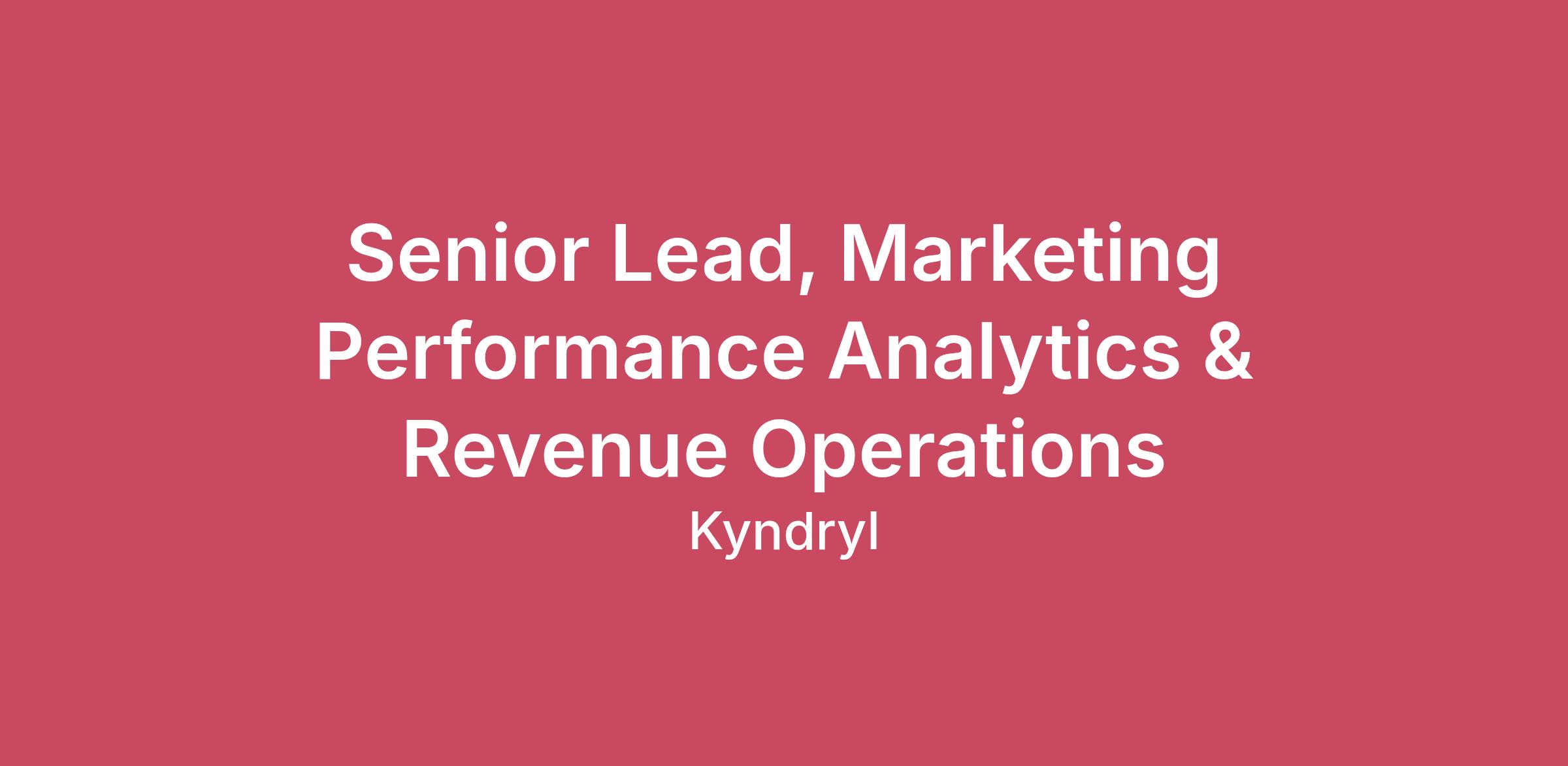 Who We AreAt Kyndryl, we design, build, manage and modernize the mission-critical technology systems that the world depends on every day. So why work at Kyndryl? We are always moving forward – always pushing ourselves to go further in our efforts to build a more equitable, inclusive world for our employees, our customers and our communities.The RoleWho We AreAt Kyndryl, we design, build, manage and modernize the mission-critical technology systems that the world depends on every day. So why work at Kyndryl? We are always moving forward – always pushing ourselves to go further in our efforts to build a more equitable, inclusive world for our employees, our customers and our communities.The RoleThe Marketing Analytics and Revenue Operations Senior Lead is a strategic, hands‑on analytical leader responsible for driving insight generation across our B2B marketing organization. This role helps the business understand business growth through the lens of marketing channels. This role will evaluate how to accelerate that growth by analyzing performance across channels, audiences, and the full marketing funnel. In this role, you will compare performance across email, events, paid media, digital programs, and other B2B channels. You will also Identify where the marketing organization should invest, optimize, or shift spend and provide regular insights to channel owners to improve efficiency and ROI.The Marketing Analytics and Revenue Operations Senior Lead may oversee a small team of 1-3 analysts and senior analysts and will work directly with marketing teams to deliver recommendations, build dashboards, automate insights, and support data-driven decision‑making across the organization. This means automating reporting and surfacing actionable insights for marketing and sales stakeholders all while ensuring data accuracy, consistency, and usability across CRM, marketing platforms, and data warehouses. This will also require partnering with operations and engineering teams to improve data flows, data models, and quality.In this role, you will be responsible for intimate knowledge with our marketing platforms, reviewing API’s and data conformance, defining metadata strategies, and simplifying the output to communicate to the marketing teams. You will lead analytics projects from start to finish, including developing attribution systems, building segmentation models, or evaluating performance across key marketing channels (email, events, paid media, digital).In this role, you should be able to shift between business problems, from developing segmentation frameworks that support ABM, optimizing our event strategy, digital marketing growth, content strategies, and integrated marketing/sales strategies. You will leverage LTV and cohort models to guide investment decisions and prioritization. You will diagnose funnel performance, identify bottlenecks, and recommend actions that improve conversion and revenue impact. You will present findings and recommendations to marketing leadership and senior stakeholders.Key Competencies: Strong analytical and quantitative problem-solvingAbility to work autonomously and own medium‑to large sized projects end-to-endSkilled at translating insights into business recommendationsCollaboration and relationship‑building across marketing and salesHigh attention to data quality and consistencyCuriosity, initiative, and deep commitment to driving business growthKyndryl currently does not require employees to be fully vaccinated against COVID-19, however, if you are hired to work at a client, customer, or partner location, you may be required to show proof of vaccination to align with their respective COVID-19 vaccination policies. Those who believe they are eligible may apply for a medical or religious accommodation prior to the start of employment.Who You AreRequired Skills:Bachelor’s or Master’s degree in Analytics, Data Science, Business, Economics, or equivalent professional portfolio.5+ years of experience in B2B marketing analytics, business intelligence, or revenue analyticsProficiency in SQL and Power BI (required).Experience with CRM, Marketing, and Sales Platforms (Marketo, CJA, Atlas, etc..).Strong understanding of multi-touch attribution, marketing, B2B funnels, and revenue dynamicsAbility to manage and mentor analytical talentExcellent communication and data storytelling skills, able to simplify complexity for diverse audiences.The compensation range for the position in the U.S. is -$100,080 to $190,080 based on a full-time schedule. Your actual compensation may vary depending on your geography, job-related skills and experience. For part time roles, the compensation will be adjusted appropriately. The pay or salary range will not be below any applicable state, city or local minimum wage requirement.There is a different applicable compensation range for the following work locations:California (San Francisco Bay Area): $120,120 to $228,000 California (All Other): $110,040 to $209,040 Colorado: $100,080 to $190,080 Massachusetts: $100,080 to $209,040 New York City: $120,120 to $228,000 Washington: $110,040 to $209,040 Washington DC: $110,040 to $209,040 This position will be eligible for Kyndryl’s discretionary annual bonus program, based on performance and subject to the terms of Kyndryl’s applicable plans. You may also receive a comprehensive benefits package which includes medical and dental coverage, disability, retirement benefits, paid leave, and paid time off. Note: If this is a sales commission eligible role, you will be eligible to participate in a sales commission plan in lieu of the annual discretionary bonus program.Applications will be accepted on a rolling basis.Being YouDiversity is a whole lot more than what we look like or where we come from, it’s how we think and who we are. We welcome people of all cultures, backgrounds, and experiences. But we’re not doing it single-handily: Our Kyndryl Inclusion Networks are only one of 