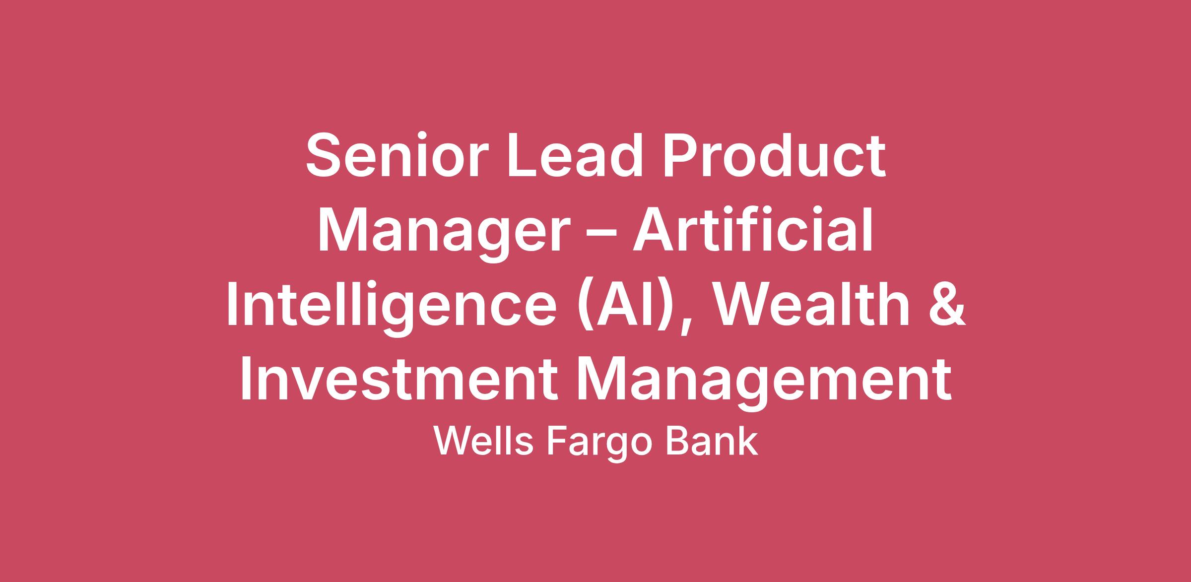 About this roleWells Fargo is seeking a Senior Lead Product Manager – Artificial Intelligence (AI) to join the Wealth & Investment Management (WIM) Chief Product Office (CPO) within the AI & Digital Asset Platforms team.This role will serve as a key product leader driving WIM’s multi‑year AI transformation agenda across advisor workflows, client experience, operations, and self‑directed channels. The Senior Lead AI Product Manager will be responsible for shaping and executing a cohesive, end‑to‑end AI product strategy, informed by business priorities, operational needs, regulatory expectations, and enterprise AI standards.As AI initiatives rapidly expand across WIM, this role provides clear ownership, strategic alignment, and disciplined execution to ensure AI capabilities scale responsibly, securely, and consistently within a highly regulated financial services environment.In this role, you willDefine and own the AI product strategy, outcomes, and end‑state vision, aligning WIM AI initiatives to enterprise priorities and measurable business value.Lead end‑to‑end product management for complex, enterprise‑grade AI platforms, solutions, and capabilities, ensuring scalability, governance, and operational readiness.Partner closely with the WIM Head of AI & Digital Asset Platforms to shape AI roadmaps, investment decisions, prioritization, and product tradeoffs.Translate business problems into prioritized AI use cases, value cases, and delivery plans across advisor, client, and operations domains.Drive cross‑product AI portfolio management, identifying dependencies, synergies, and risks across platforms, workflows, and distribution channels.Guide long‑term AI solution delivery, accounting for regulatory requirements, responsible AI principles, data dependencies, and enterprise technology constraints.Articulate AI product vision and roadmap; define scope; prioritize backlogs; and support platform evolution, model deployment, and workflow integration.Own key business, adoption, operational, and risk metrics, embedding governance, controls, and compliance requirements throughout the AI product lifecycle.Engage and align cross‑functional teams and external partners, including Product Owners, Engineering, Data, Risk, Compliance, Legal, Operations, and vendors.Serve as a trusted advisor to senior leadership, translating complex AI, regulatory, and market considerations into clear product direction and execution plans.Required Qualifications7+ years of experience in Product Management, product development, strategic planning, process management, change delivery, or Agile Product Owner roles, or equivalent demonstrated through work experience, training, military experience, or education.Desired QualificationsExperience leading Artificial Intelligence (AI), machine learning (ML), or advanced analytics product management initiatives within financial services or other highly regulated enterprise environments.Proven ability to define, own, and execute a multi‑year AI product strategy and roadmap, aligned to enterprise priorities, business outcomes, and operational needs.Strong background in end‑to‑end product management for enterprise‑grade AI platforms, including backlog prioritization, roadmap delivery, platform modernization, and lifecycle ownership.Demonstrated experience translating business problems into AI use cases, value cases, and delivery plans, supporting advisor workflows, client experience, and operational processes.Experience leading cross‑product or portfolio‑level AI initiatives, identifying dependencies, synergies, risks, and prioritization tradeoffs across platforms and channels.Working knowledge of responsible AI principles, AI governance, model risk management, data dependencies, and regulatory expectations, with experience embedding controls into product design and delivery.Proven experience managing AI platforms, data‑driven solutions, or intelligent automation capabilities, including model deployment, workflow integration, and scalable platform evolution.Experience developing and owning business cases for AI capabilities, including articulation of business value, cost, risk, and investment tradeoffs.Strong partnership experience with Technology, Data, Engineering, Risk, Compliance, Legal, Operations, and external vendors in a matrixed enterprise environment.Demonstrated ability to influence senior leadership and executive stakeholders, providing clear product direction across strategy, execution, risk, and investment decisions.Track record of owning and managing business metrics, adoption metrics, operational metrics, and risk metrics for complex AI or data products.Experience operating within Agile or hybrid delivery models, coordinating multiple workstreams and cross‑functional teams to deliver measurable outcomes.Job ExpectationsHybrid work schedule.This position is not eligible for Visa sponsorship.Pay Range Reflected is the base pay range offered for this position. Pay may vary depending on factors including but not limited to demonstrated examples of prior performance, skills, experience, or work location. Employees may also be eligible for incentive opportunities.$139,000.00 - $239,000.00Benefits Wells Fargo provides eligible employees with a comprehensive set of benefits, many of which are listed below. Visit Benefits - Wells Fargo Jobs for an overview of the following benefit plans and programs offered to employees.Health benefits401(k) PlanPaid time offDisability benefitsLife insurance, critical illness insurance, and accident insuranceParental leaveCritical caregiving leaveDiscounts and savingsCommuter benefitsTuition reimbursementScholarships for dependent childrenAdoption reimbursementPosting End Date:14 Apr 2026*Job posting may come down early due to volume of applicants.We Value Equal OpportunityWells Fargo is an equal opportunity employer. All qualified applicants will receive consideration for employment without regard to