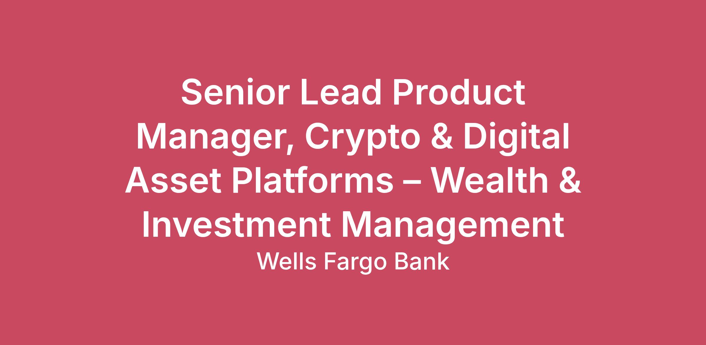 About this roleWells Fargo is seeking a Senior Lead Product Manager, Crypto Platforms to join the Wealth & Investment Management (WIM) Chief Product Office within the newly formed AI & Digital Asset Platforms team. This role will drive cross‑product crypto portfolio management and strategy, leading the modernization, governance, and execution of Wells Fargo’s crypto product capabilities in a highly regulated and rapidly evolving market environment.As a senior product leader, you will define and execute a multi‑year vision for digital asset and crypto products, partnering closely with Product Owners, engineering leaders, risk and compliance teams, and executive stakeholders. You will own product strategy, business case development, and roadmap alignment across crypto initiatives, ensuring clarity of ownership, disciplined execution, and measurable business outcomes that enhance advisor productivity, client experience, and operational efficiency across digital and advisor‑led channels.In this role, you will:Advise senior leadership in developing and influencing crypto business plans, investment priorities, and product strategies to support complex business and technical needs within WIM.Define and own the crypto product strategy, outcomes, and end‑state vision, aligning enterprise digital asset objectives with measurable business, client, and risk outcomes.Oversee end‑to‑end product management for highly complex, technical, and regulated crypto platforms and services, ensuring strategic coherence, scalability, and effective controls.Lead cross‑product crypto portfolio management, identifying synergies, resolving dependencies, and addressing complex challenges spanning multiple platforms, channels, and enterprise stakeholders.Deliver long‑term, large‑scale crypto solutions, accounting for global market dynamics, evolving regulatory requirements, risk management considerations, and enterprise technology standards.Articulate product vision and roadmap, define scope, prioritize backlogs, establish goals, and guide teams through platform modernization, technology upgrades, and vendor integrations.Own business case development for new and evolving crypto capabilities, clearly articulating business benefits, costs, risks, and tradeoffs across strategic, technical, and regulatory initiatives.Embed governance, risk, and compliance considerations into crypto product design, delivery, and operating processes, owning key business, customer, and risk metrics.Provide vision, direction, and subject‑matter expertise to leadership on implementing innovative, enterprise‑scale digital asset solutions across diverse product lines.Engage and align cross‑functional partners, including product owners, engineering, risk, compliance, operations, legal, vendors, scrum masters, and project managers.Serve as a trusted advisor to senior leadership, translating complex technical, regulatory, and market considerations into clear product direction and execution plans.Required Qualifications7+ years of experience in Product Management, product development, strategic planning, process management, change delivery, or Agile Product Owner roles, or equivalent demonstrated through work experience, training, military experience, or education.Desired QualificationsDemonstrated experience leading crypto, digital asset, or blockchain product strategies within financial services, fintech, or highly regulated enterprise environments.Proven ability to define and execute a multi‑year product vision and roadmap informed by market dynamics, competitive intelligence, and customer or advisor needs.Strong background in end‑to‑end product management for complex, technical, and regulated platforms, including portfolio‑level ownership across multiple products or capabilities.Experience leading cross‑product portfolio management, identifying synergies, resolving dependencies, and driving strategic alignment across enterprise stakeholders.Deep understanding of regulatory, risk, and compliance requirements applicable to crypto and digital asset platforms, with demonstrated ability to embed governance and controls into product design and delivery.Demonstrated success advising senior leadership on product strategy, investment decisions, prioritization tradeoffs, and risk considerations.Proven experience developing and owning business cases for new or evolving capabilities, including articulation of business value, costs, risks, and tradeoffs.Experience delivering large‑scale, long‑term technology solutions, accounting for global market trends, regulatory impact, enterprise architecture standards, and risk management.Ability to articulate product vision, define scope, prioritize backlogs, and guide teams through platform modernization, technology upgrades, and vendor integrations.Track record of translating strategy into prioritized execution across multiple workstreams using Agile or hybrid delivery models.Strong capability to own and manage business, customer, operational, and risk metrics with a focus on measurable outcomes.Demonstrated ability to collaborate with and influence cross‑functional teams including engineering, architecture, risk, compliance, legal, operations, and external vendors.Recognized as a trusted advisor and thought partner to leadership, capable of aligning stakeholders around a unified roadmap and execution plan.Job ExpectationsHybrid Work ScheduleThis position is not eligible for Visa sponsorship.Pay Range Reflected is the base pay range offered for this position. Pay may vary depending on factors including but not limited to demonstrated examples of prior performance, skills, experience, or work location. Employees may also be eligible for incentive opportunities.$139,000.00 - $239,000.00Benefits Wells Fargo provides eligible employees with a comprehensive set of benefits, many of which are listed below. Visit Benefits - Wells Fargo Jobs for an overview of the following benefit p
