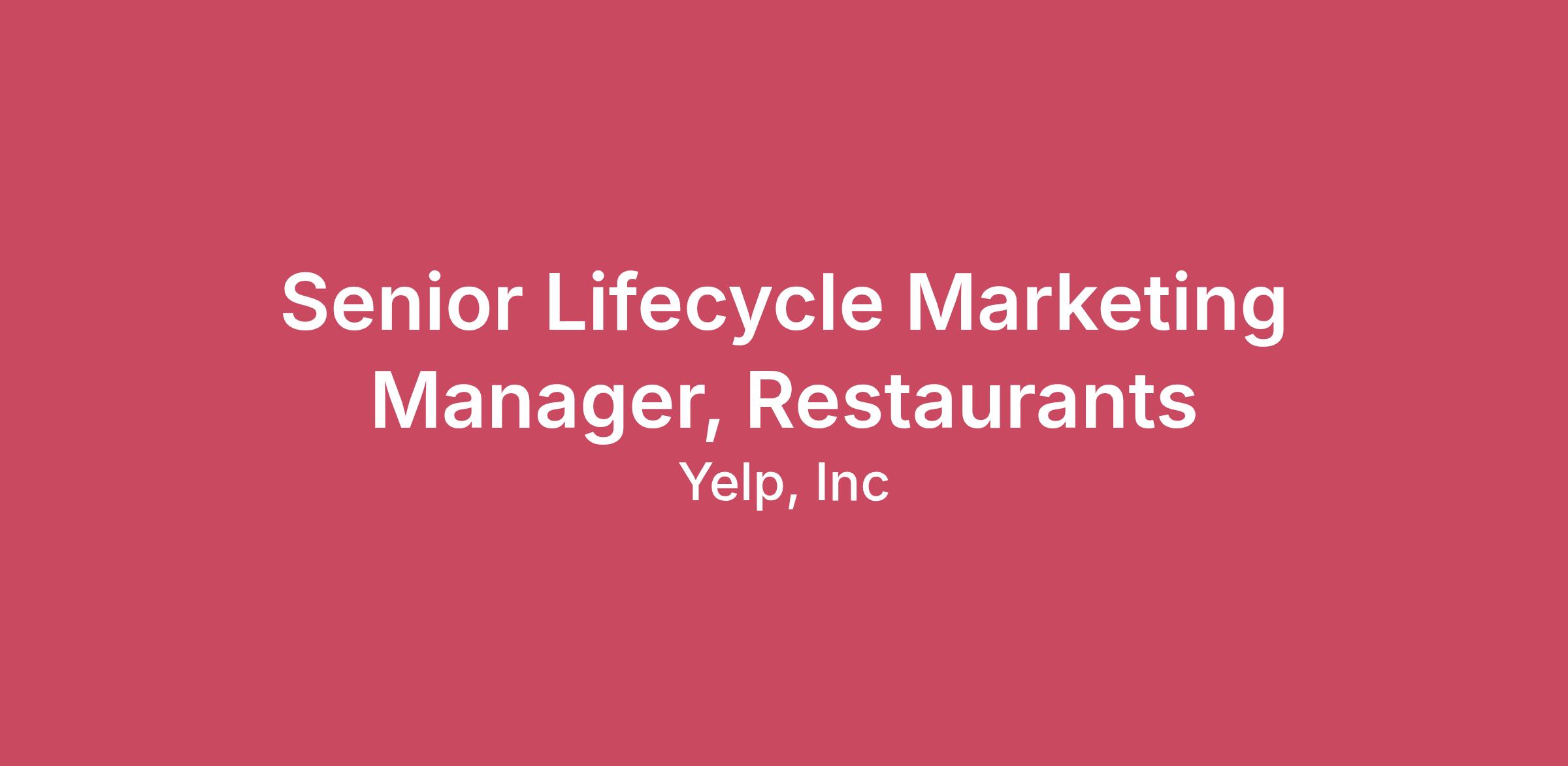 Summary We are seeking a results-driven Senior Lifecycle Marketing Manager to lead the transformation of our lifecycle program for Yelp’s suite of restaurant solutions. As a part of our team, you will be responsible for planning, building, and executing marketing campaigns to promote a multi-product portfolio—including Yelp Host, Yelp Ads, Yelp Guest Manager and add-ons, and future product launches—across owned properties such as email, push, and in-app communications to restaurants. You will own the strategic vision and cross-functional execution of one-off and automated campaigns, to shout Yelp’s value through the rooftops and hit our acquisition KPIs. We are looking for an AI-first thinker who can leverage AI, alongside lifecycle best practices and your expertise to drive business growth and impact. We’d love to have you apply, even if you don’t feel you meet every single requirement in this posting. At Yelp, we’re looking for great people, not just those who simply check off all the boxes. This is a full-time remote role based in the United States. What you'll do: Own and execute the end-to-end strategy and execution for lifecycle marketing campaigns from strategy to building to reporting, analysis, and optimization to drive aggressive acquisition for Restaurants’ products. Manage the entire customer journey, moving beyond simple acquisition to drive retention, upsell, and advocacy, treating lifecycle marketing as a product extension that drives "North Star" metrics. Be hands-on in our marketing automation platform (Salesforce Pardot) to set up email and push campaigns to educate, engage, and convert prospects across all restaurant segments (SMB, Mid-market, and Enterprise). Partner with Marketing Ops and other Yelp LCM managers to inject Yelp Host messaging into every possible touchpoint across the entire company. Plan, design, and execute high-tempo lifecycle marketing tests (A/B testing subject lines, offer timing, and channel mix) to uncover opportunities for driving increased campaign engagement and conversion. Write creative briefs and manage production workflow. You will also design email headers via Canva and work with Figma files to ensure visual consistency. Manage Calendly events to streamline customer scheduling and engagement. Uncover opportunities for marketing campaign optimization across the customer lifecycle including segmentation and personalization, leveraging product usage data to trigger messages based on user behavior. Identify and troubleshoot issues in complex marketing programs, including utilizing Validity for email deliverability and list hygiene. What it takes to succeed: 5+ years of experience in email and lifecycle marketing or related field within a SaaS, B2B tech, or restaurant technology environment. 3+ years experience building marketing automation campaigns using top-tier tools such as Salesforce Marketing Cloud, Pardot, Braze, Hubspot, Eloqua or similar. Technical Proficiency: Expertise in Salesforce Pardot, specifically building Engagement Studio campaigns and form handlers. Ability to design assets using Canva and navigate Figma files. Experience managing Calendly events and integrations. Familiarity with Validity for monitoring sender reputation and deliverability. Comfortable modifying and updating HTML and CSS email templates. You have a growth mindset, viewing lifecycle marketing as a revenue engine; capable of designing and executing high-volume campaigns across Email, Push, and in-product messaging (IPM). You have demonstrated expertise or strong interest in AI/ML—using AI for research, copywriting, optimization, and analysis. You are strongly analytical, using data to derive insights and produce regular reporting. You have strategic lifecycle marketing program experience, including Upsell/Cross-sell, nurturing, and retention (loyalty, referrals, or churn-reduction) campaigns and automation. You have outstanding communication skills—both written and verbal—with the proven ability to collaborate with technical stakeholders and influence leadership. What you'll get: Effective your first day: Full medical, vision, and dental 15 days PTO (accrual begins on date of hire and increases with 2+ years of tenure thereafter), 12 paid holidays, plus one floating holiday Up to 14 weeks of parental leave Monthly wellness subsidy Work from home reimbursement Flexible spending account 401(k) retirement savings plan Employee stock purchase plan Compensation range for this position is $106,000- $198,000 annually. You may also be offered a bonus and benefits. Closing At Yelp, we believe that diversity is an expression of all the unique characteristics that make us human: race, age, sexual orientation, gender identity, religion, disability, and education — and those are just a few. We recognize that diverse backgrounds and perspectives strengthen our teams and our product. The foundation of our diversity efforts are closely tied to our core values, which include “Playing Well With Others” and “Authenticity.” We’re proud to be an equal opportunity employer and consider qualified applicants without regard to race, color, religion, sex, national origin, ancestry, age, genetic information, sexual orientation, gender identity, marital or family status, veteran status, medical condition or disability. Actual salary offered may vary based on multiple factors, including but not limited to, an individual's location and experience. We will consider for employment qualified candidates with arrest and conviction records, consistent with applicable law (including, for example, the San Francisco Fair Chance Ordinance for roles based in San Francisco, the Los Angeles County Fair Chance Ordinance for roles based in the unincorporated areas of Los Angeles County, and the California Fair Chance Act for roles based in California). Where required by law, a criminal background check will not be conducted until after a conditional offer of employm