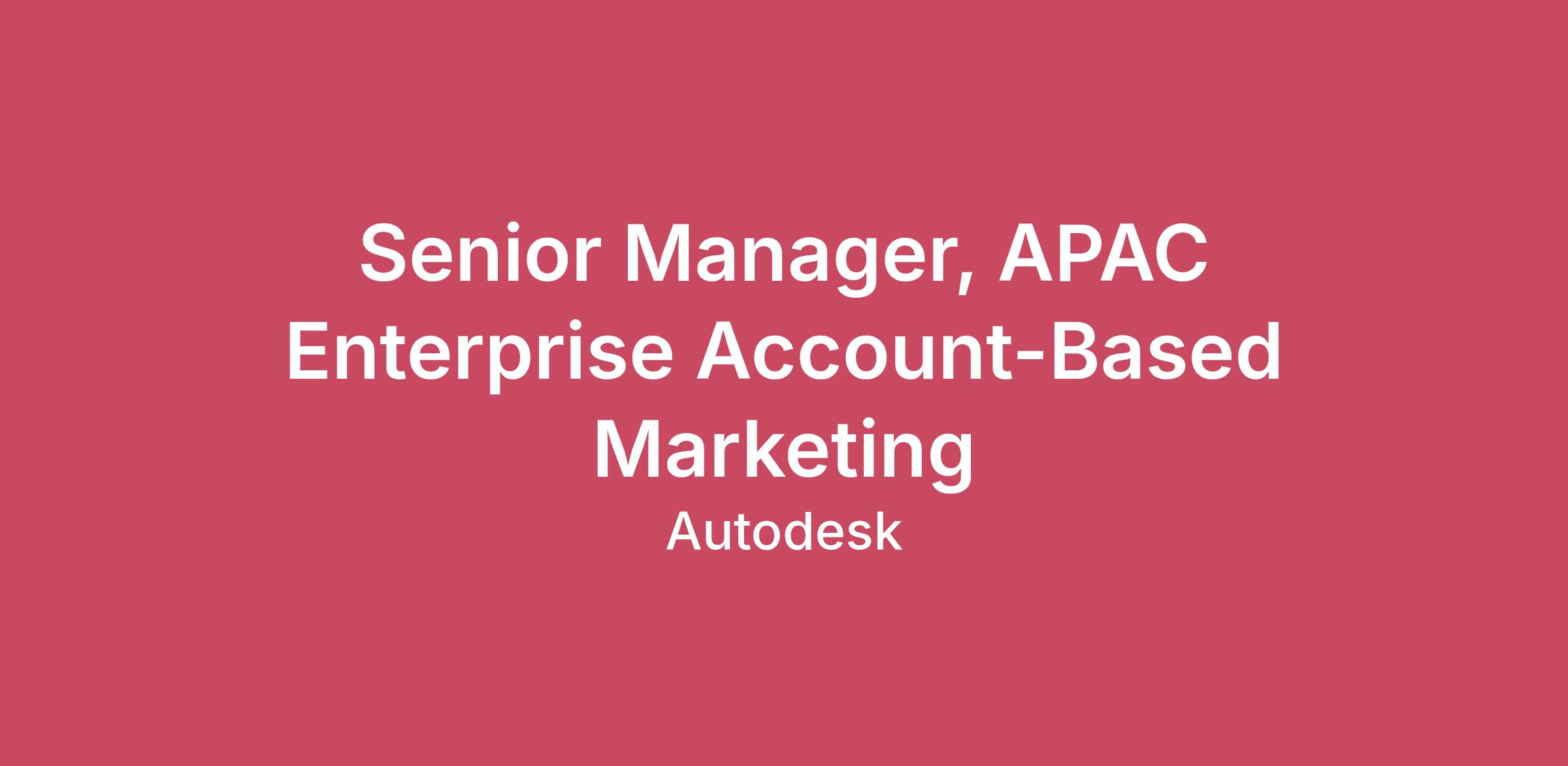 Job Requisition ID #26WD96169Position Overview Autodesk is seeking a Senior Manager, APAC Enterprise Account-Based Marketing to lead and develop a high-performing team of enterprise account-based marketers. This role combines strategic leadership with strong people management, ensuring the team delivers measurable impact through tailored, high-touch ABM programs aligned to Named Accounts sales priorities.You will be accountable for setting regional Enterprise ABM strategy, driving operational excellence, managing performance and budget, and fostering a culture of coaching, accountability, and continuous improvement. Success in this role requires a leader who can translate business objectives into disciplined execution while developing talent and strengthening cross-functional collaboration. Responsibilities Management Manage a team of enterprise account-based marketersCoach and maintain the activities of account-based marketing team, including hiring, developing talent, team culture and performance managementEnsure that the team's marketing programs are aligned with the corporate vision, themes, and brand guidelinesEnsure that the team has focus on the buyer's journey and deploying the right account-specific tactical mix to deliver the right engagement at the right timeHelp to guide the strategy for Named Accounts ABMEnsure that the team is supported as they develop and deliver annual and quarterly marketing plans for accounts focused on expanding business and ensuring customer use and adoption Collaboration and Interface Primary liaison with the Enterprise Accounts sales leadersEngage with the sales leads to coordinate, communicate, and improve the impact of marketing activitiesPartner with Industry Marketing and Marketing Systems & Services to set the strategy for account-based campaigns, ensuring the team is enabled to effectively deliver1:1 and 1: few ABM programs for priority accountsReporting and Analysis Maintain an accurate and actionable understanding of team resultsReview and provide overall analysis of account-based programsEnsure that each marketer is tracking and measuring individual campaign resultsBudget and Revenue Accountability Work with internal marketing, sales, and customer success partners to ensure requirements for development deployment of campaigns are securedManage team budget allocation, tracking of actuals, and reportingOversee plan delivery and execution, evaluating resource efficiency and ROI to guide optimization Minimum Qualifications 2+ years' experience managing and leading a team8+ years B2B account-based marketing, customer life cycle, or customer success marketing experience with proven account-based marketing specific skillsBA/BS or equivalent work experienceFamiliarity with sales and marketing automation tools such as Salesforce.com, Marketo, 6Sense, Folloze, etcExperience in the design, manufacturing, media and entertainment production design, architecture, engineering, and construction industriesPreferred Qualifications Passionate about customer and business outcomesExcel at people management, individual development, coaching and mentoringWell-versed in navigating collaboration with internal partners in highly matrixed global organizationsExperience with successful results and contribution of the teamModern marketer; knowledgeable and experienced at using a mix of tactics, tools, and methodologies to deliver the right messageEstimated 20% travel required#LI-JA1Learn MoreAbout AutodeskWelcome to Autodesk! Amazing things are created every day with our software – from the greenest buildings and cleanest cars to the smartest factories and biggest hit movies. We help innovators turn their ideas into reality, transforming not only how things are made, but what can be made.We take great pride in our culture here at Autodesk – it’s at the core of everything we do. Our culture guides the way we work and treat each other, informs how we connect with customers and partners, and defines how we show up in the world.When you’re an Autodesker, you can do meaningful work that helps build a better world designed and made for all. Ready to shape the world and your future? Join us!Salary transparencySalary is one part of Autodesk’s competitive compensation package. Offers are based on the candidate’s experience and geographic location. In addition to base salaries, our compensation package may include annual cash bonuses, commissions for sales roles, stock grants, and a comprehensive benefits package.Diversity & BelongingWe take pride in cultivating a culture of belonging where everyone can thrive. Learn more here: https://www.autodesk.com/company/diversity-and-belongingAre you an existing contractor or consultant with Autodesk? Please search for open jobs and apply internally (not on this external site).