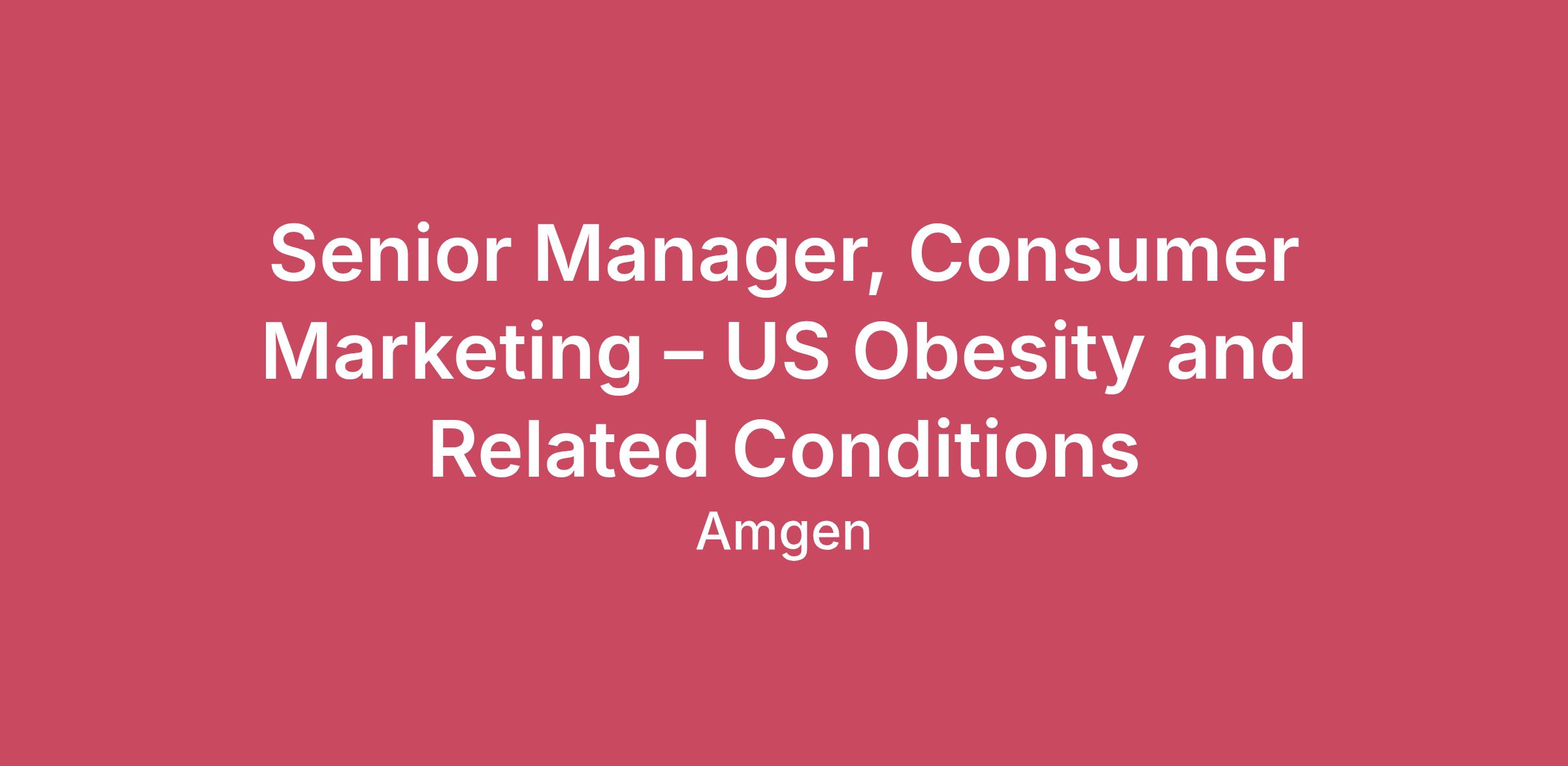 Career CategoryMarketingJob DescriptionJoin Amgen’s Mission of Serving PatientsAt Amgen, if you feel like you’re part of something bigger, it’s because you are. Our shared mission—to serve patients living with serious illnesses—drives all that we do.Since 1980, we’ve helped pioneer the world of biotech in our fight against the world’s toughest diseases. With our focus on four therapeutic areas –Oncology, Inflammation, General Medicine, and Rare Disease– we reach millions of patients each year. Amgen is advancing a broad and deep pipeline of medicines to treat cancer, heart disease, inflammatory conditions, rare diseases, and obesity and obesity-related conditions. As a member of the Amgen team, you’ll help make a lasting impact on the lives of patients as we research, manufacture, and deliver innovative medicines to help people live longer, fuller happier lives.Our award-winning culture is collaborative, innovative, and science based. If you have a passion for challenges and the opportunities that lay within them, you’ll thrive as part of the Amgen team. Join us and transform the lives of patients while transforming your career.Senior Manager, Consumer Marketing – US Obesity and Related Conditions What you will doLet’s do this. Let’s change the world. In this vital role the Senior Manager, Consumer Marketing, Obesity and Related Conditions will lead the development and execution of consumer communications strategy and integrated campaigns for the U.S. obesity portfolio.This role is responsible for building insight-driven, breakthrough creative campaigns that resonate with consumers and differentiate in a crowded and culturally complex space. The individual will serve as the consumer communications lead, partnering cross-functionally to translate brand strategy into compelling, high-impact patient experiences across channels.This leader will operate as a trailblazer within a matrixed organization, pushing boundaries, challenging conventions, and elevating both internal teams and agency partners to deliver best-in-class work.What Sets This Role ApartOpportunity to define consumer engagement in obesity, one of the most dynamic and high-impact categories in healthcareAbility to shape culture-driving, category-defining campaignsA role for a trailblazer who thrives in ambiguity, challenges convention, and elevates creative standardsHigh visibility with significant cross-functional and leadership exposureConsumer Strategy, Campaign Development & Creative LeadershipDevelop a robust, insight-driven consumer strategy, including segmentation, motivations, and barriersLead end-to-end development of integrated campaigns and differentiated message platforms grounded in deep consumer understandingEvaluate, shape, and propose unbranded and branded strategies, ensuring clear articulation of unmet need and strong pull-through across the campaign ecosystemLead primary market research (PMR), including concept testing, message testing, and Attitude & Usage (ATU)Own creative development and production (TV, audio, stills), ensuring high-quality execution from concept through final deliveryLead and inspire agency partners to deliver breakthrough, culturally relevant, high-performing creative across channelsEnsure consistent execution and message pull-through across all consumer touchpointsOversee agency scope, performance, and operations, driving accountability and excellenceLaunch Excellence & Brand PlanningLead consumer launch strategy and planning, including key milestones, deliverables, and success metricsManage integrated timelines, interdependencies, and execution readiness across cross-functional teamsServe as the consumer lead within brand planning, shaping strategy and aligning priorities across stakeholdersEnsure seamless launch execution in a highly competitive and fast-evolving marketOwn the consumer marketing budget, ensuring disciplined investment decisions and adherence to LE planning and submission processesCross-Functional Leadership & IntegrationLead within a highly matrixed organization, driving alignment across HCP marketing, Patient Access, Direct-to-Patient, Corporate Affairs & Communications, Patient Advocacy, Medical, Legal, Regulatory (MLR), and Insights & AnalyticsIntegrate patient advocacy and corporate affairs perspectives to ensure authentic, patient-centered communicationsBuild strong partnerships to deliver connected, seamless patient experiences across all touchpointsMLR Leadership & GovernanceLead the Medical, Legal, Regulatory (MLR) review process, ensuring compliant, efficient approvalsNavigate complex review dynamics while protecting strategic intent and creative integrityMedia & Tentpole Collaboration (Consultative)Provide strategic direction and brand objectives to inform media planning and investment decisionsPartner in upfront planning processes to ensure alignment with campaign strategyConsult on tentpole planning and execution, supporting integration and amplificationNote: This role does not own media planning or tentpole strategy but plays a critical consultative roleWhat we expect of youWe are all different, yet we all use our unique contributions to serve patients. The marketing professional we seek is an influencer with these qualifications.Basic Qualifications:Doctorate degree and 2 years of Marketing experienceORMaster’s degree and 4 years of Marketing experienceORBachelor’s degree and 6 years of Marketing experienceORAssociate’s degree and 10 years of Marketing experienceORHigh school diploma / GED and 12 years of Marketing experiencePreferred Qualifications:Proven consumer marketing experience, ideally a mix of healthcare and non-regulated industriesStrong track record of developing and launching high-performing, innovative campaignsDemonstrated experience leading integrated campaigns and full-funnel creative developmentExperience with TV/video/audio production and large-scale campaign executionDeep expertise in consumer insight