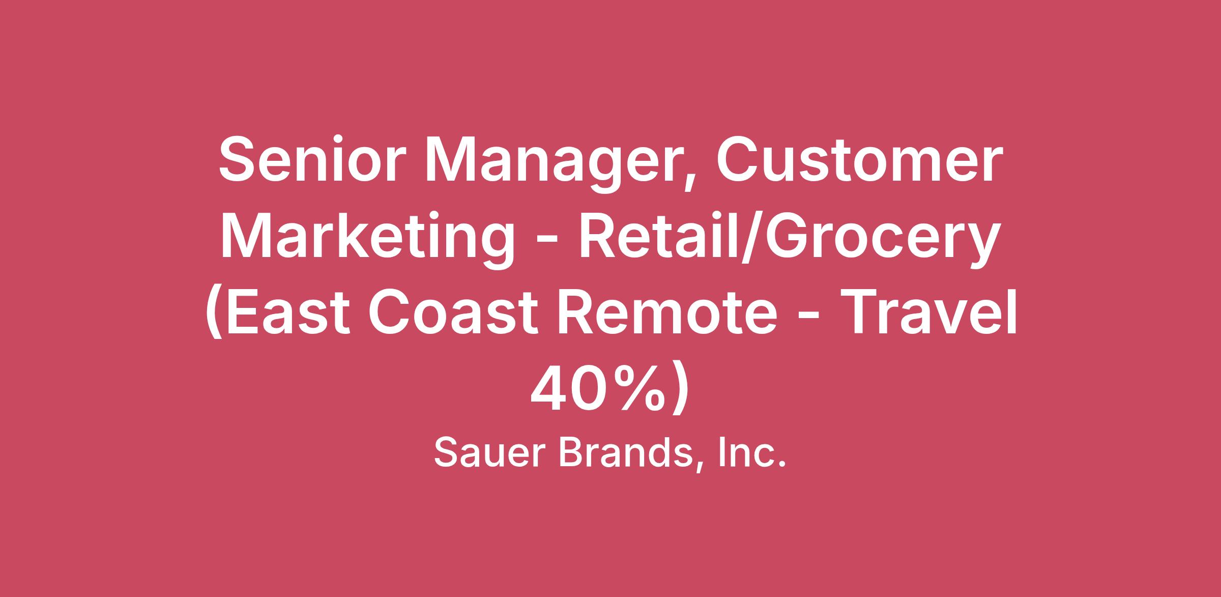 We are hiring Rockstars to join our Sauer Brands team! *Must be on the food manufacturer side selling into commercial retail center store grocery utilizing data insights and working between brand and sales teams. Unable to consider if you are working at a retailer, food service, K-12, non-commercial, c-stores, beverage, DSD. Overall Goal of Position: We are seeking a dynamic, creative and strategic Senior Manager of Customer Marketing to lead the development of customer activation strategies and shopper-driven category plans across our Retail and Away From Home (Food Service) customers. Job Summary: This role will lead the critical function of Customer Marketing for the Sauer Brand families (Duke's mayo, Mateo's salsa, Kernal Seasonings, The Spice Hunter) and serve as the primary voice of Sales on the Sauer Brands Management Team. This role will ensure Sauer Brands win at shelf and online through data-driven storytelling, compelling retail programs, and best-in-class execution. The Senior Manager will foster cross-functional collaboration and capability building across the Sales function. This position will report to the VP of Sales Strategy and will be in the Sales Strategy department. Key Duties and Responsibilities: Leadership & Team Development Lead and develop the Customer Marketing functional area Build capabilities in customer activation, shopper insights, category development and KPI development and reporting Foster collaboration with cross-functional teams including Sales, Brand Marketing, Revenue Management, and Supply Chain Customer Marketing Strategy & Execution Development of our brands Innovation pricing, assortment, promo recommendations; build and maintain innovation sales projection models (Size of Prize based on ACV and Velocity assumptions); direction on Mateo’s and Kernel areas Translate brand plans into insight-led customer-ready strategies and selling tools. Oversee creation of retailer-specific programming including in-store, digital, and omnichannel campaigns Guide trade investment, price pack architecture, and in-market execution Develop annual customer plans and joint business planning inputs Partner with brand marketing and the field sales team to optimize activation. Represent Sauer Brands brand strategy at customer meetings Sales & Insights Integration Align customer-facing plans with national brand and trade strategies, ensuring retail excellence Guide development of tools and scorecards that track the effectiveness of promotions, activations, and shelf performance Champion the voice of the shopper and retailer across the organization to ensure insights-driven decision-making Budget & Process Management Projection and management of Slotting and Shopper needs and management of budget Work closely with Revenue Management team to ensure pricing and promotional guardrails are set and executed in line with Sauer Brands’ financial objectives. What We Are Looking For: Personal Characteristics Entrepreneurial drive and the desire to “build a business” Outgoing, energetic, and results oriented personality Overall confidence in one’s abilities and comfortable communicating the facts Smart, creative and inquisitive Integrity-Does the right thing even when no one is looking Disciplined approach, and accountable for KPIs No excuses mindset and Dependable team player with positive attitude Personal values that mesh with SBI values Performance History Documented history of making improvements in assigned work area/responsibilities Stellar references based on contributions and performance Demonstrated proficiency in the following areas: Excellent strategic thinking, communication, and project management skills Prior experience influencing at senior levels across commercial functions Deep understanding of retail activation, syndicated data tools (IRI, Nielsen), shopper insights, and category development principles Education & Experience: Bachelor’s degree in Business, Marketing, or related field; MBA preferred 5-10+ years of progressive experience in CPG food manufacturing with strong exposure to customer marketing, category management. Must have experience in sales role with revenue growth. Must be on the food manufacturer side selling into commercial retail center store grocery utilizing data insights and working between brand and sales teams. Unable to consider if you are working at a retailer, food service, K-12, non-commercial, c-stores, beverage, DSD. Strong customer marketing experience, analytics, category management required and brand experience a plus. Proficient in Excel and PowerPoint; experience with trade planning, CRM, and data visualization tools (e.g., Power BI) is a plus Other: Location: East Coast Remote Travel 40%, Richmond HQ and Customer sites What Is In It For You? Our company acknowledges talented people are attracted to companies that provide competitive pay, comprehensive benefits packages and outstanding advancement opportunities. For this reason, we offer a Comprehensive Benefits Plan that includes the following: 401K Medical/Dental/Vision Coverage Parental Leave Vacation, Sick Days and Holidays Flexible Spending Accounts Tuition Reimbursement Employee and Dependent Life Insurance Voluntary Disability Insurance Other Voluntary Insurance Options Sauer Brands, Inc. is an equal opportunity employer. All qualified applicants will receive consideration for employment without regard to race, color, religion, age, sex, national origin, disability status, genetics, protected veteran status, sexual orientation, gender identity or expression, or any other characteristic protected by federal, state or local laws.