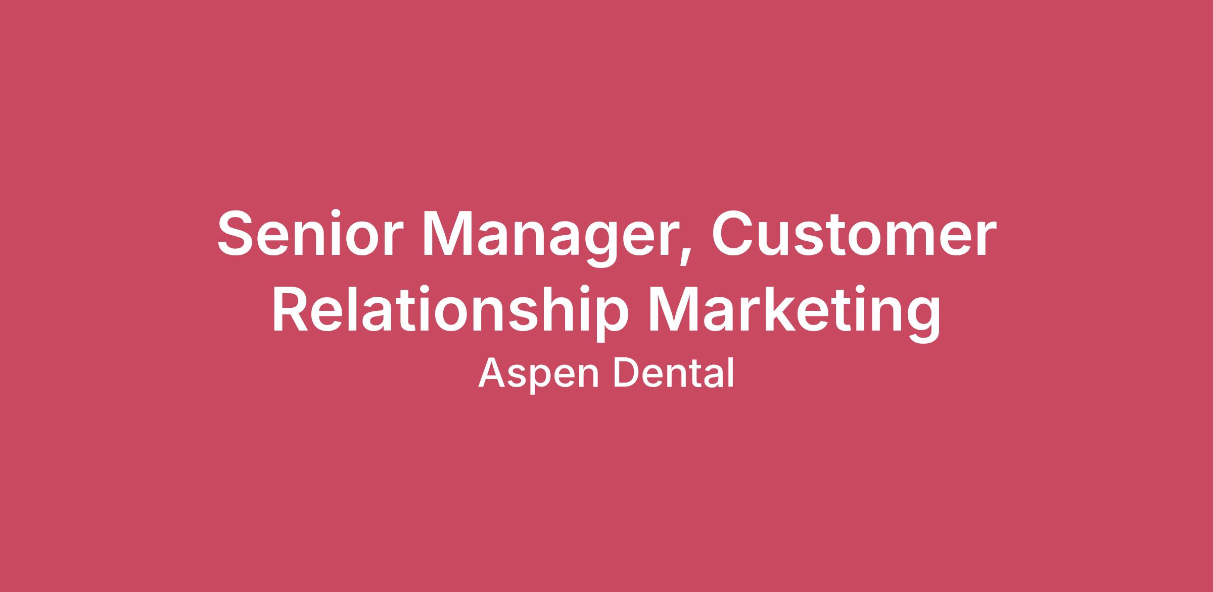 The Aspen Group (TAG) is one of the largest and most trusted retail healthcare business support organizations in the U.S. and has supported over 20,000 healthcare professionals and team members with close to 1,500 health and wellness offices across 48 states in four distinct categories: dental care, urgent care, medical aesthetics, and animal health. Working in partnership with independent practice owners and clinicians, the team is united by a single purpose: to prove that healthcare can be better and smarter for everyone. TAG provides a comprehensive suite of centralized business support services that power the impact of five consumer-facing businesses: Aspen Dental, ClearChoice Dental Implant Centers, WellNow Urgent Care, Chapter Aesthetic Studio, and Lovet Pet Health Care. Each brand has access to a deep community of experts, tools and resources to grow their practices, and an unwavering commitment to delivering high-quality consumer healthcare experiences at scale.As a reflection of our current needs and planned growth we are very pleased to offer a new opportunity to join our Lovet Pet Healthcare team as a Senior Manager, Customer Relationship Marketing. We are seeking a Sr. Manager of Customer Relationship Marketing to transform CRM from a transactional communication tool into a scalable growth and experience platform that drives Existing Client (EC) engagement, visit frequency, and New Client (NC) conversion across both Base and De Novo businesses.This role is both strategic and highly tactical. The Sr. Manager will shape CRM strategy, build the roadmap, and personally lead the development, deployment, and optimization of campaigns and lifecycle programs that drive measurable business outcomes.This is an exciting opportunity for someone who enjoys working closely across functions on a small, collaborative team dedicated to bringing the vision of Lovet Pet Health Care to life at scale.The role will execute our CRM roadmap to stabilize core operations, unlock automated lifecycle value, and enable increasingly personalized engagement that improves retention, visit volume, and customer experience.Primary Accountabilities1. Execute the CRM Roadmap to Enable Engagement & GrowthLead the phased evolution of CRM capabilities that support retention, repeat visits, and revenue growth:Stabilize foundational programs including appointment reminders, lifecycle communications, plan renewals, and monthly contentLeveraging both outbound and in-product delivery, launch and optimize automated lifecycle journeys such as treatment reminders, no-show recovery, and referral programsEnable more personalized coordinated and targeted engagement across channels over time2. Build and Deploy Campaigns that Drive Visits and RetentionOwn promotional strategy and execution for EC and NC campaignsDesign, build, and deploy lifecycle programs and targeted promotions that increase repeat visits and lifetime valueTrack and optimize performance of campaigns against bookings, visits, and engagement metrics3. Drive Existing Client Engagement & Visit VolumeOwn EC visit and revenue per visit targets supported by CRM programsDevelop strategies appropriate to both Base businesses (retention and frequency) and De Novo businesses (penetration and loyalty building)Connect CRM engagement to appointment bookings and revenue outcomes4. Partner Strategically to Deliver Business OutcomesPartner with the CMO and Product to define priorities, roadmap phases, and success metricsWork closely with Braze and external partners to maximize platform capabilities and speed of executionContribute to developing internal best practices and scalable processes5. Measure Performance, Reputation, and OptimizeLink CRM KPIs to business outcomes including show rate, visit volume, plan renewals, revenue per visit, and treatment completionTrack and report on client reputation and feedback using Birdeye and Qualtrics, identifying trends and opportunities to improve experience and retentionProvide ongoing analysis, testing, and optimization recommendationsDevelop clear reporting on roadmap progress and campaign performance6. Collaborate Cross-FunctionallyIntegrate CRM initiatives with marketing channels, brand, product, and communications teamsManage multiple priorities while balancing strategic planning with hands-on executionMinimum Education and ExperienceEducation: Bachelor’s Degree requiredExperience:10+ years of experience planning and executing CRM programs including email, SMS, direct mail, and lifecycle marketing in retail, service, healthcare, or similar categories. Experience with Braze is preferred but not required.Ideal Candidate ProfileThe ideal candidate is a business-oriented CRM leader who combines strong strategic thinking with the ability to execute quickly and effectively.Key qualifications:Demonstrated ability to link CRM programs to revenue and business outcomesExperience building and deploying lifecycle and promotional campaigns end-to-endStrong analytical skills and comfort using test-and-learn methodologiesHands-on leader who can move fluidly between strategy and executionExperience working cross-functionally and with external partnersProven ability to manage immediate priorities while building longer-term capabilitiesDemonstrated ability to be strongly committed to outcomes while remaining adaptable in approach—able to quickly reassess priorities and pivot strategies as business conditions, customer needs, or data change.Why This Role MattersThis role is central to turning CRM into a true growth engine—improving retention, increasing visit frequency, targeting clients and pets with the highest need, and strengthening customer relationships across both Base and De Novo businesses. You will play a key role in shaping how we engage clients and scale the business through smarter, more effective lifecycle marketing.Annual Salary Range: $140,000-$165,000 plus 15% annual bonus, with a generous benefits package that includes paid 