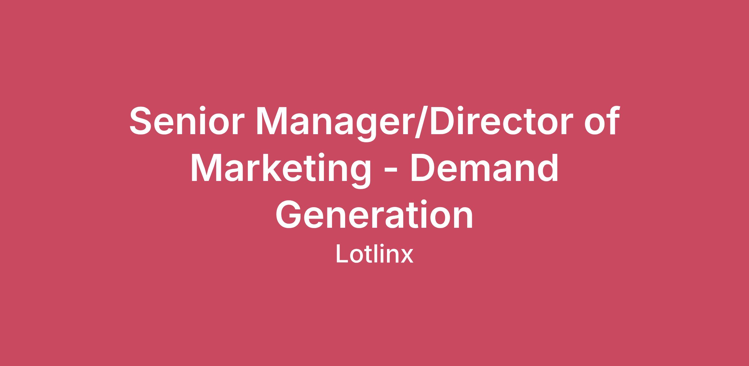 Since our founding in 2012, Lotlinx has consistently pioneered advancements in the automotive landscape. We specialize in empowering automobile dealers and manufacturers by providing cutting-edge data and technology, delivering a distinct market advantage for every single vehicle transaction. Today, we stand as the foremost automotive AI and machine learning powered technology, excelling in digital marketing, risk management, and strategic inventory management. Lotlinx provides employees with a dynamic work environment that is challenging, team-oriented, and full of passionate people. We offer great incentives to our employees, such as competitive compensation and benefits, flex time off, and career development opportunities.Job Summary We’re looking for a results-driven Sr. Manager/Director of Marketing - Demand Generation to lead the strategy, execution, and optimization of programs that drive pipeline and revenue growth. This leader will own the full demand engine — from awareness to conversion — and partner closely with sales, product, and marketing teams to build scalable programs that deliver measurable business impact. If you’re equal parts strategist, operator, and growth-thinker who thrives on turning insights into pipeline, we want to meet you. Key Responsibilities Demand Strategy & Planning Own the demand generation strategy aligned to revenue targets and company growth goals Build integrated, multi-channel programs across digital, paid media, events, partnerships, and lifecycle marketing Develop segmentation, targeting, and messaging strategies that improve conversion and pipeline velocity Pipeline & Revenue Ownership Drive qualified pipeline growth and marketing-attributed revenue Partner with Sales leadership to optimize lead management, scoring, routing, and follow-up processes Continuously test, measure, and optimize performance across the funnel Campaign Execution & Optimization Lead campaign development from concept through launch, measurement, and iteration Manage paid acquisition, nurture programs, and conversion optimization efforts Use data, attribution, and experimentation to improve ROI and CAC efficiency Team & Cross-Functional Leadership Build and mentor a high-performing demand generation team Collaborate with Product Marketing, Content, RevOps, and Sales to ensure consistent messaging and funnel alignment Manage agency and vendor relationships as needed Qualifications 7–10+ years in B2B marketing, with deep expertise in demand generation or growth marketing Proven track record of driving leads, pipeline and revenue Strong understanding of modern marketing channels, attribution models, and lifecycle strategy Experience working closely with Sales and RevOps in a revenue-driven environment Analytical mindset with comfort using data to guide decisions and prioritize investments Experience managing budgets, forecasts, and performance metricsExperience in SaaS, AI, or data-driven technology companies (preferred, but not required) Experience marketing to car dealers (preferred, but not required) Salary Range: $130,000 - $200,000, plus an annual target bonus. Benefits: Medical, Dental, Vision, Matching 401kLotlinx is committed to creating a diverse environment and is proud to be an equal opportunity employer. All qualified applicants will receive consideration for employment without regard to race, color, religion, gender, gender identity or expression, sexual orientation, national origin, genetics, disability, age, or veteran status. Lotlinx is not currently able to offer sponsorship for employment visa status. Lotlinx is headquartered in Peterborough, NH and has locations in Holmdel NJ, Manitoba, Ontario and British Columbia, Canada in addition to a large team spanning from the US to Canada. Our success relies heavily on our customers but also our dedicated talent that continuously moves our platform forward. We value our employees, their abilities and seek to foster an open, cooperative, dynamic environment where the team and company alike can thrive.