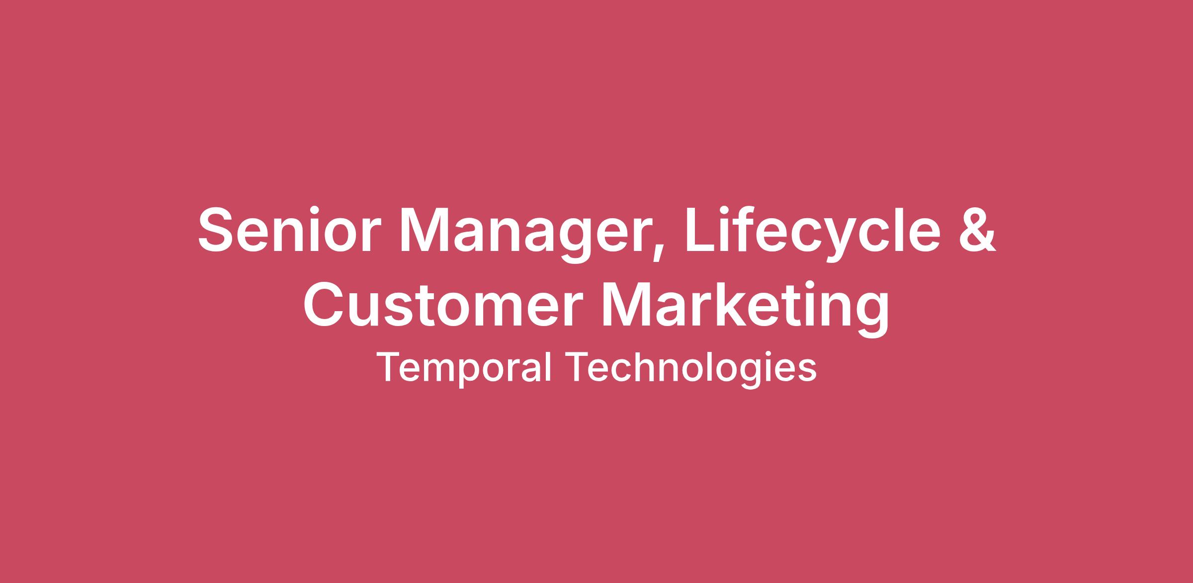 About Us Temporal is an open source programming model that can simplify code, make applications more reliable, and help developers focus on the important things like delivering features faster. We are on a mission to be the reliable foundation of every developer’s toolbox, and are building the team that will make that happen. Our values guide us —they are present in how we show up, make decisions, and work together to make an impact. We’re curious, driven, collaborative, genuine and humble. Temporal is growing and we are looking for those who share our values, challenge 'standard' thinking, and want to influence our future. If you have a passion for improving the developer experience, building world-class open-source software and communities, and want to be a part of our amazing team, we'd love to hear from you!Summary We are seeking a Senior Manager, Lifecycle & Customer Marketing to expand and own Temporal’s lifecycle marketing strategy, execution, and team development. You will lead end-to-end lifecycle programs that nurture prospects and customers, optimize experiences across the full funnel, and drive business outcomes including lead conversion, onboarding success, retention, engagement, and event participation. You’ll build and manage a high-performing team, scale processes, and embed data-driven rigor into how we engage our global database. What You’ll Do Strategy & Execution Define and lead Temporal’s lifecycle marketing strategy across acquisition nurturing, self-serve onboarding, abandoned sign-up recovery, customer engagement, newsletters, and event attendance. Partner with cross-functional teams (Marketing, Sales, Product, CS) to align segmentation, messaging, and journeys to business goals. Design scalable, personalized lifecycle journeys leveraging behavioral and CRM data to drive conversion, activation, and retention. Establish frameworks for experimentation (A/B tests, cohort analysis, trigger logic) to optimize campaign performance and funnel progression. Campaign Leadership & Ownership Own execution and optimization of email campaigns using Marketo for automation and nurture flows. Manage and segment contact data using Salesforce and Segment to inform journey logic and audience targeting. Measure and improve campaign performance using analytics platforms such as Amplitude (for digital behavior) and Omni, and utilize email preview/testing tools such as Litmus. Collaborate with design and content teams, using Figma to help build visually engaging email and nurture assets. Team Leadership & Development Build and scale a lifecycle and customer marketing team — hiring, mentoring, and developing direct reports. Establish clear roles, processes, and best practices that enable high performance, cross-collaboration, and long-term growth. Foster an inclusive team culture, supporting professional growth and accountability. Measurement & Optimization Define KPIs and dashboards that quantify impact across lifecycle stages including email engagement, nurture conversion, onboarding success, customer retention, and event participation. Translate analytics insights into actionable recommendations, reporting results to senior leadership and cross-functional partners. What You’ll Bring Experience & Skills 7+ years of lifecycle or customer marketing experience in a B2B SaaS or technology environment, with a strong focus on email and automation. Experience with product-led growth organizations and optimizing digital onboarding experiences. Proven success building and leading a team, scaling programs, and defining marketing operations and processes. Deep proficiency with Marketo (or equivalent enterprise automation), Salesforce CRM, and customer data integration (Segment or CDP). Strong analytical fluency; comfortable with analytics tools (e.g., Amplitude) for funnel and cohort analysis, establishing dashboards, and driving insights. Excellent communicator with strong collaboration skills to influence cross-functional partners. Demonstrated ability to balance strategic thinking with hands-on execution and optimization. Familiarity with event marketing (virtual and in-person) and strategies to drive attendance and engagement. Why Temporal? Impactful work at the intersection of open-source and enterprise software. Cross-functional collaboration and ownership across the full marketing funnel. Opportunity to shape and scale a core growth function and team at an early stage. Competitive compensation and equity, flexible work environment, and world-class colleagues. Compensation The estimated pay range for this role is $165,000 - $210,000 This role is eligible to participate in Temporal's equity plan Compensation ranges reflect salary and commission compensation (when applicable) across several geographic markets. Employment offers carefully consider multiple factors, including prior experience, knowledge, expertise, skillset, market location, and job level assessed during the interview process. Employee benefits and perks below are for full-time employees, part-time or temporary positions are excluded. U.S. Benefits Unlimited PTO, 12 Holidays + 2 Floating Holidays 100% Premiums Coverage for Medical, Dental, and Vision AD&D, LT & ST Disability, and Life Insurance (Standard & Supplemental Available) Empower 401K Plan Additional Perks for Learning & Development, Lifestyle Spending, In-Home Office Setup, Professional Memberships, WFH Meals, Internet Stipend and more! International Benefits Paid Time Off (PTO) and Benefits outside the United States vary by country, and are issued in partnership with Remote.com. Additionally, Temporal offers perks to all international employees for learning & career development, a lifestyle spending account, in-home office setup (in addition to company-issued hardware), professional memberships, work-from-home meals, and access to the Calm app for mental wellness. Travel Temporal is a globally distributed, collaborative team that values opportunities 