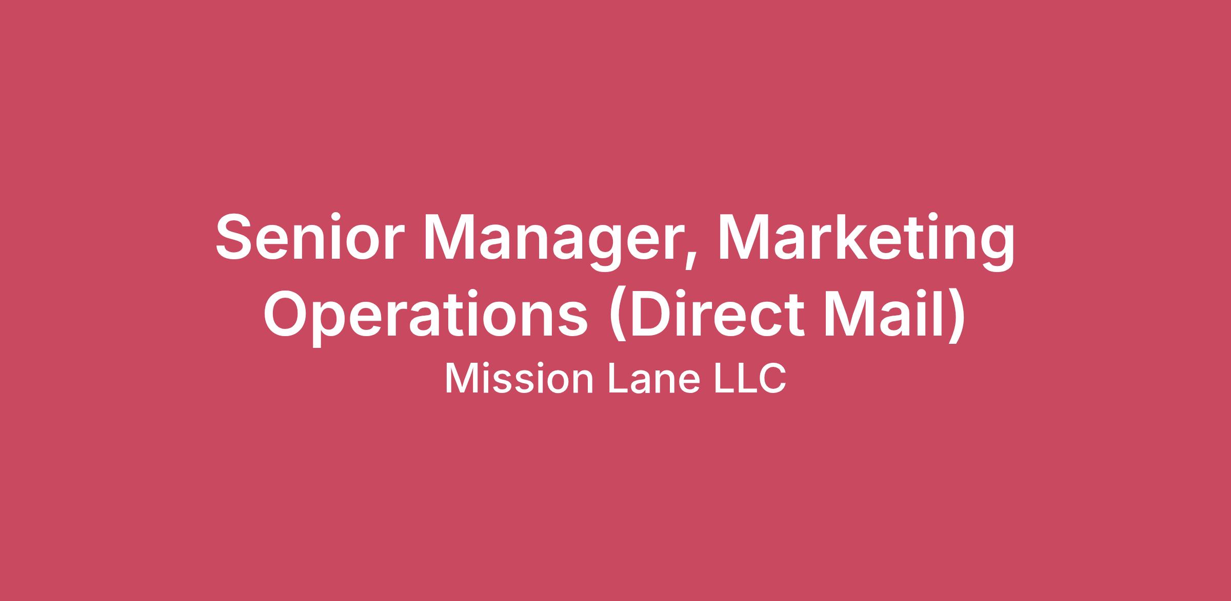 Mission Lane is combining the power of data, technology, and exceptional service to pave a clear way forward for millions of people on the path to financial success. By attracting top talent and leveraging cutting-edge technology, we’re enabling people to unlock real financial progress. Sound like a mission you can get behind?We’re looking for a leader with an uncompromising eye for detail, a deep background in complex direct mail cycles, and the technical fluency to build scalable marketing operations programs to join our team as the Senior Manager, Marketing Operations. The Impact You’ll Make You’ll drive forward our mission of empowering people to unlock financial progress by bridging the critical gap between creative strategy and technical execution for our direct mail marketing channel.  At its core, our mission depends on our ability to deliver the best fit credit offers to individuals who can benefit from them the most; your work ensures that these opportunities are delivered with absolute precision. Your primary objective is to evolve our Direct Mail engine into a flawless, scalable system that supports this essential connection.  As Senior Manager, Marketing Operations, you will: Serve as the final quality gatekeeper for all marketing campaigns, ensuring every offer, term, and disclosure is perfectly mapped in our highly regulated financial environment. Own and execute the Direct Mail technology roadmap, partnering with Engineering and Data teams to design scalable workflows. Identify opportunities to automate data processing and campaign building, reducing manual steps and accelerating our time-to-launch. Lead the production lifecycle, managing print vendor relationships, postal logistics (USPS), and inventory to optimize pricing. Directly manage and develop the marketing operations team, fostering a culture of uncompromising attention to detail and continuous growth. Improve and maintain robust documentation and processes for responding to audits with transparency and integrity. Minimum Qualifications: 7+ years in Marketing Operations or Program Management, with specific experience managing complex, recurring direct mail cycles. Proven experience in a regulated industry where precision and compliance are essential. Technical proficiency in managing roadmaps and understanding complex data logic, such as segmentation and offer mapping. Experience managing direct reports and successfully influencing cross-functional technical teams like Data and Engineering. Hands-on experience managing print vendors, mail shops, and postal logistics. Ability to travel as needed. Preferred Qualifications: Direct marketing experience within the credit card or financial services industry. Experience moving a team from manual workflows to automated systems. Compensation: Annual full-time starting base salary range: $134,000 - $158,000 This role is eligible for additional compensation in the forms of participation in our annual incentive and equity programs.  Pay is based on factors such as work experience, education, certification(s), training, skills, and competencies related to the role. Mission Lane also offers a comprehensive benefits plan, which includes paid time off, 401(k) match, a monthly wellness stipend, health/ dental/ vision insurance options, disability coverage, paid parental leave, flexible spending account (for childcare and healthcare), life insurance, and a remote-friendly work environment. #LI-DNIAbout Mission Lane: Founded in December 2018, Mission Lane is a purpose-driven fintech company based in the U.S., with headquarters in Richmond, Virginia.  It all started with a realization:  nearly fifty percent of the adult population in the U.S. doesn’t have access to a clear line of credit. Most traditional credit card companies either overlook or overcharge this group because they have less-than-perfect credit scores or no scores at all. We decided this just wouldn’t do. In partnership with our sponsor banks, we offer credit cards under the Mission Lane brand name, with better, clearer terms, and a more refined customer experience than the alternatives available to people working hard to improve their credit. To date, over four million consumers have chosen Mission Lane, earning high customer ratings on Credit Karma for its market segment and industry leading Net Promoter scores.  Mission Lane has cumulatively raised over $600 million of equity from leading investors, including Invus Opportunities, QED Investors, LL Funds, funds affiliated with Oaktree Capital Management, and other leading investors. Our commitment to a workplace built on respect and dignity is guided by our core value of Unity. We believe that everyone plays a vital role in our shared purpose, and we actively cultivate an environment where all individuals have the opportunity to do their best work. By fostering a culture of empathy and collaboration, we create a strong sense of belonging and support for every team member. Mission Lane is an equal opportunity employer. We do not discriminate on the basis of race, color, religion, sex (including pregnancy, sexual orientation, or gender identity), national origin, age, disability, genetic information, or any other protected status.  Mission Lane provides reasonable accommodations to applicants who need them for medical or religious reasons, as required by law.  Applicants can initiate an accommodation request by contacting peopleexperience@missionlane.com. Mission Lane is not sponsoring new applicant employment authorization and please, no third-party recruiters. Application Integrity: Our cardholders trust us with their financial well-being, and this trust starts with the integrity of the people on our team. We're looking for team members who share our dedication to transparency and truth. Please verify that the information in your application is accurate and complete.  Providing any information to Mission Lane that is not completely truthful a