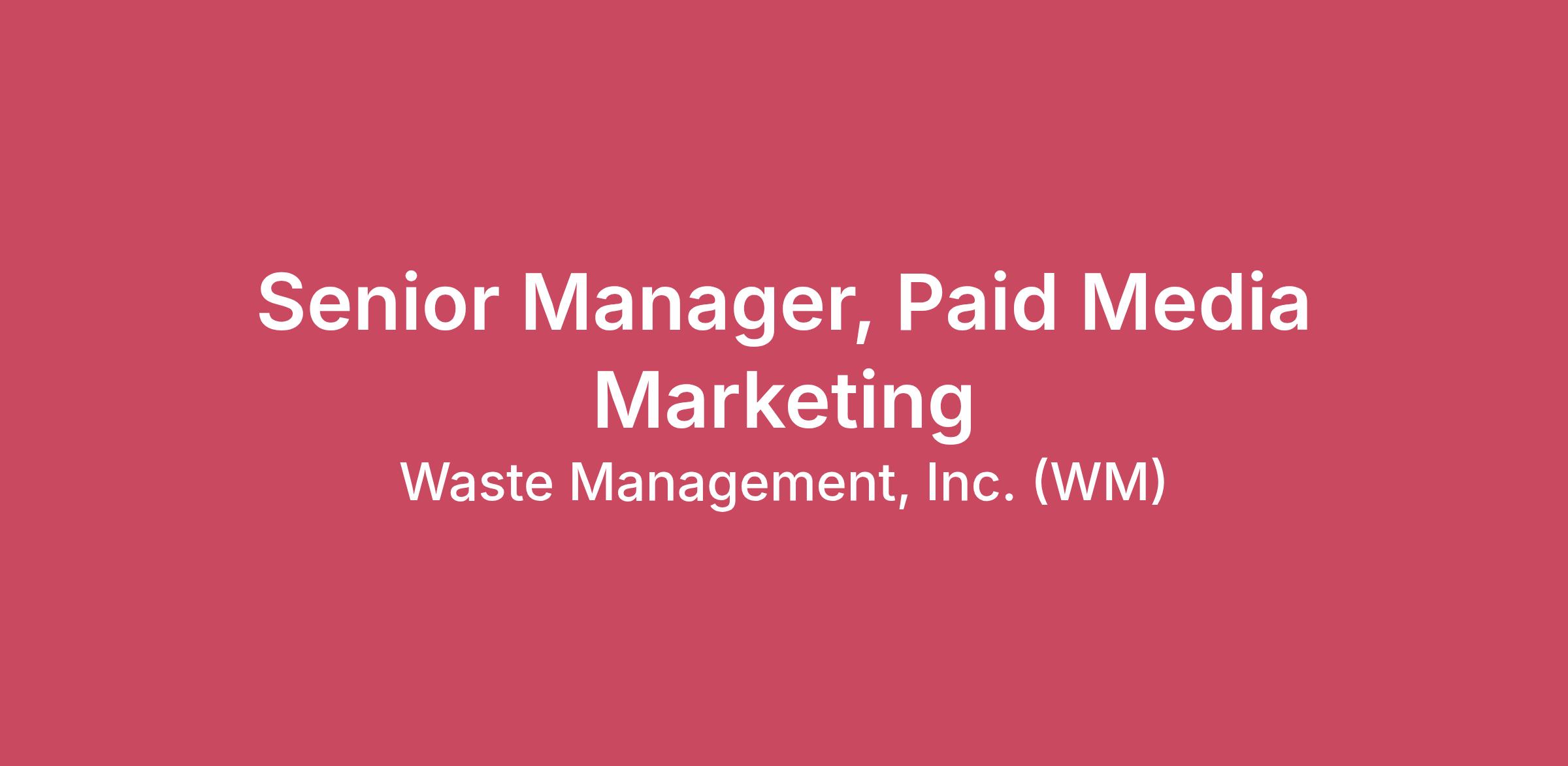I. Job Summary The Senior Manager of Marketing is responsible for the strategy, planning, execution and management of paid media plans supporting multiple lines of business within the WM umbrella. This role is responsible for delivering revenue growth through campaigns that both promote the WM brand and drive customer acquisition. This includes liaising with internal stakeholders and managing external agencies.Establish paid media strategy and goals that align with corporate and departmental objectives.Drive business growth through national paid media campaigns for residential and commercial services. This includes paid search, display, video, social, connected TV, linear TV, etc.Support area teams in delivering against goals by driving strategy and execution of local campaigns. Manage corporate brand media including campaigns that are a part of sports sponsorships (e.g. PGA, MLB).Manage media budgets with a performance-driven mindset, serving as a thoughtful steward of company resources to maximize impact and efficiency.Partner with stakeholder teams to ensure the end-to-end customer experience is set up for optimal performance including messaging, pricing and e-commerce.Develop and maintain reporting tools that monitor performance and identify optimization opportunities.Evaluate emerging technologies and channels. Provide thought leadership and perspective for adoption where appropriate.II. Essential Duties and Responsibilities To perform this job successfully, an individual must be able to perform each essential duty satisfactorily. Other minor duties may be assigned.Plan, direct, oversee and execute the development and implementation of WM’s paid media strategy consistent with established overarching corporate marketing strategies and objectivesWork directly with Dir Marketing, SLT members, and key senior corporate and group leaders, as required, providing the leadership and expertise needed to define, develop and integrate the company’s near and long-term marketing initiatives into a cohesive and category leading marketing strategy that can support the evolution of the businessDevelop an advertising roadmap to support brand building, customer engagement and lead generation, ensuring the website delivers the best experience for our customers, aligns with marketing strategies across channelsOversee vendor evaluation, execution and management of all contracts relating to paid media, lead generation, and agency services.Partner with internal departments and external agencies in finding or developing marketing strategies to grow the business online and offline, meeting revenue/cost goals.Direct the day-to-day online operations relating to paid media with oversight responsibility for key performance drivers and resulting operating metrics.Oversee cross-functional teams and direct the strategy to ensure all paid media marketing initiatives drive top line revenue growth, optimize return-on- investment and achieve other key performance indicators and that business projects are executed within budget and on schedule.Develop and implement a best-in-class analytics process to ensure all paid media initiatives are set against measurable objectives and there is recourse to ensure changes can be made to meet expectations.Lead cross-functional high performing teams with a strong sense for considering customer needs, incorporating company goals, and creating an experience able to inspire brand loyalty and acquire customers.Work with digital team to develop redesign and enhancement roadmaps; analyze data, determine insights, and develop recommendations to optimize the user experience.III. Supervisory ResponsibilitiesPotential to manage one additional resource depending on supervisory experience and business need. IV. QualificationsThe requirements listed below are representative of the qualifications necessary to perform the job.Must live and work in the U.S. Houston, TX. location highly preferred. A. Education and ExperienceEducationEducation LevelEducation Details Bachelor's Degree(accredited) in marketing, advertising, journalism or related degree; or in lieu of degree,RequiredandHigh School Diplomaor GED (accredited) Required Work ExperienceExperienceExperience Details 4 yearsof relevant work experience. Requiredand7 yearsof previous experience leading a marketing function (in addition to education requirement).Required B. Certificates, Licenses, Registrations or Other RequirementsPreferred: NoneC. Other Knowledge, Skills or Abilities RequiredCustomer first approach: Strong understanding of customer segments, or an ability to derive a fact-based perspective using primary and secondary research to gather insights into customers’ needs, wants and pain pointsOperations / business / financial knowledge: Strong understanding of WM’s operations and service capabilities, or an ability to become a quick study, that translates this knowledge into practical and impactful features that add value to our customers without contributing to inefficiency for the business. Solid financial acumen, including understanding of key financial statements and concepts such as P&L and ROIImpact-orientation: Strong focus on thoughtful maximization of value creation and capture, with a nose of “following the money” but recognizing that to capture value we must deliver value to our customers. Successful candidate will have a track record of meaningful and measurable customer and financial successCollaboration: Ability to partner with stakeholders in general management, CE, Sales, Pricing, Operations, Technology, Finance, Legal, HR and other functions for the success of the Company, focusing on the greater good of the Company, its employees and customersCommunication: Strong oral and written communication skills, with a proven ability to synthesize and tailor complex material into simple and easily digestible content by experts and non-experts alike, including Corporate and Area stakeholders, and potentially the WM