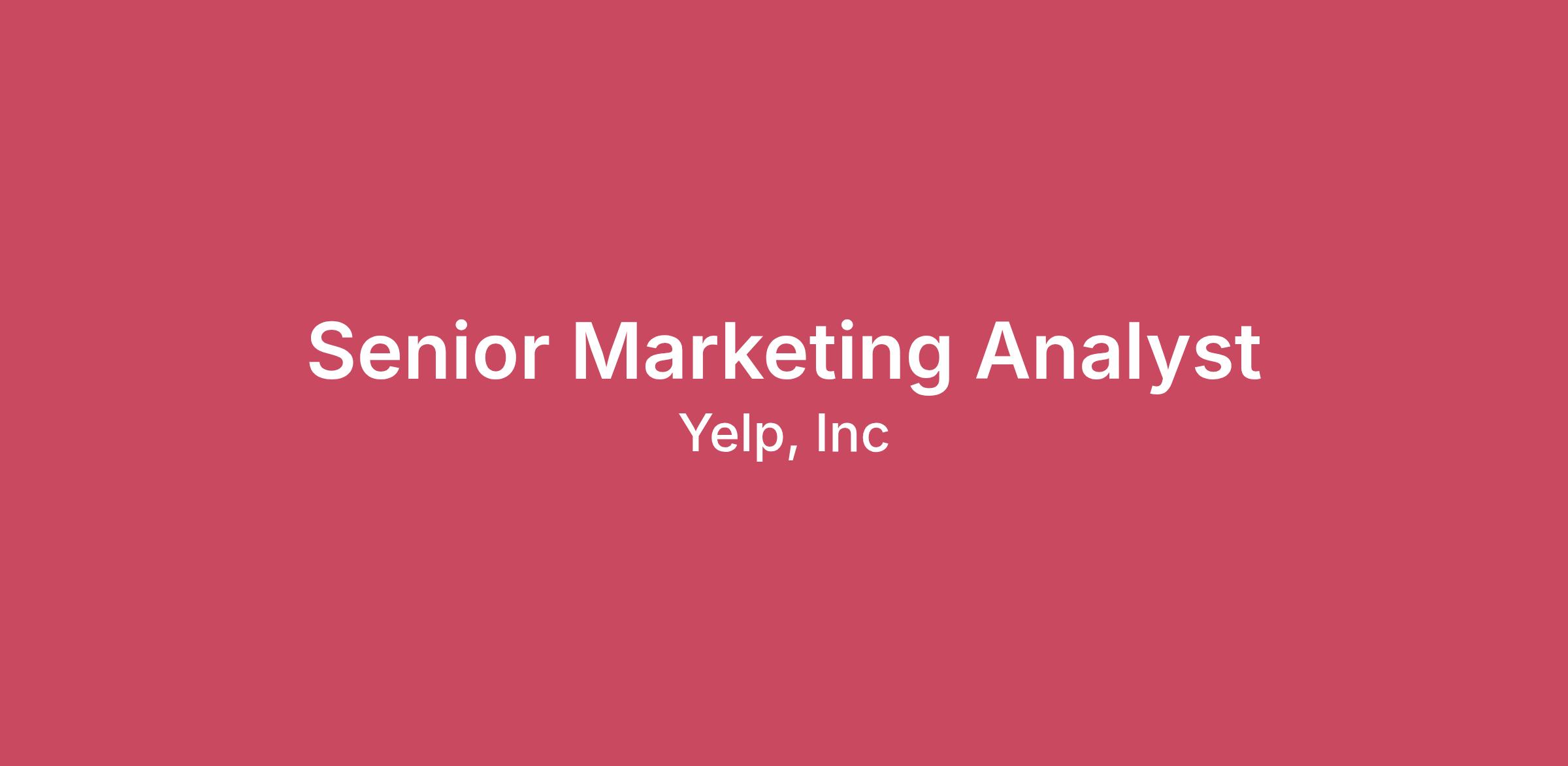 Summary Yelp’s purpose is simple: to connect people with great local businesses. Whether you’re looking for a great pizza spot or the best mechanic in your neighborhood, we know just the place. Yelp is seeking a Senior Analyst to help drive marketing efforts that support continued revenue growth. In this role, you’ll be joining the Marketing Analytics Team at Yelp, a centralized consulting team that helps drive consumer and business growth through multiple channels, including email, push, paid advertising, web marketing, and more. Your day-to-day responsibilities will range from informing broader marketing strategy to analyzing the efficacy of new campaigns. Expect to collaborate with stakeholders, including senior leaders, to provide a data-driven lens on marketing decisions. Data is at the core of everything we do, and you will play a critical role in equipping the marketing organization with the insight needed to make scalable strategic decisions. We’d love to have you apply, even if you don’t feel you meet every single requirement in this posting. At Yelp, we’re looking for great people, not just those who simply check off all the boxes. This is a full-time remote role based in the United States. What you'll do: Enhance our marketing strategy by partnering with stakeholders to gain a deep understanding of core needs and leveraging your analytical expertise to develop scalable solutions that anticipate future needs and improve business performance. Become a subject matter expert on Yelp’s marketing metrics and relevant data sources. Leverage analytical tools (SQL, Python, Tableau, etc.) to build analytical storylines and support reporting functions. Identify opportunities to leverage new data and new ways to look at existing data that drive incremental insights and learnings. Exercise sound business judgment and influence the direction of Yelp’s business by effectively working with and communicating results to cross-functional groups. What it takes to succeed: 2+ years of relevant business experience solving analytical problems and deriving insights using quantitative approaches. Experience at a consulting firm, investment bank, or private equity fund, or analytical role at a fast-paced B2C or marketplace tech company. Superior hands-on analytic skills, including SQL, advanced Excel modeling, and Tableau dashboard building required. Business acumen and an enthusiasm for marketing strategy, customer segmentation, and user growth. Understanding of statistical significance and experience with A/B testing and experimentation for web or software. Exceptional problem solver with the ability to transition between detailed data and high-level insights to drive decisions. Proactive collaboration and communication within your team and cross-functional groups. What you'll get: Effective your first day: Full medical, vision, and dental 15 days PTO (accrual begins on date of hire and increases with 2+ years of tenure thereafter), 12 paid holidays, plus one floating holiday Up to 14 weeks of parental leave Monthly wellness subsidy Work from home reimbursement Flexible spending account 401(k) retirement savings plan Employee stock purchase plan Compensation range for this position is $89,000 - $150,000 annually. You may also be offered a bonus and benefits. Closing At Yelp, we believe that diversity is an expression of all the unique characteristics that make us human: race, age, sexual orientation, gender identity, religion, disability, and education — and those are just a few. We recognize that diverse backgrounds and perspectives strengthen our teams and our product. The foundation of our diversity efforts are closely tied to our core values, which include “Playing Well With Others” and “Authenticity.” We’re proud to be an equal opportunity employer and consider qualified applicants without regard to race, color, religion, sex, national origin, ancestry, age, genetic information, sexual orientation, gender identity, marital or family status, veteran status, medical condition or disability. Actual salary offered may vary based on multiple factors, including but not limited to, an individual's location and experience. We will consider for employment qualified candidates with arrest and conviction records, consistent with applicable law (including, for example, the San Francisco Fair Chance Ordinance for roles based in San Francisco, the Los Angeles County Fair Chance Ordinance for roles based in the unincorporated areas of Los Angeles County, and the California Fair Chance Act for roles based in California). Where required by law, a criminal background check will not be conducted until after a conditional offer of employment is made, and any evaluation of a candidate's criminal background check will be subject to an individualized assessment that takes into account the candidate's specific criminal records and the responsibilities and requirements of the particular role. We are committed to providing reasonable accommodations for individuals with disabilities in our job application process. If you need assistance or an accommodation due to a disability, you may contact us at accommodations-recruiting@yelp.com or 415-969-8488. Note: Yelp does not accept agency resumes. Please do not forward resumes to any recruiting alias or employee. Yelp is not responsible for any fees related to unsolicited resumes. US Recruiting and Applicant Privacy Notice #LI-Remote