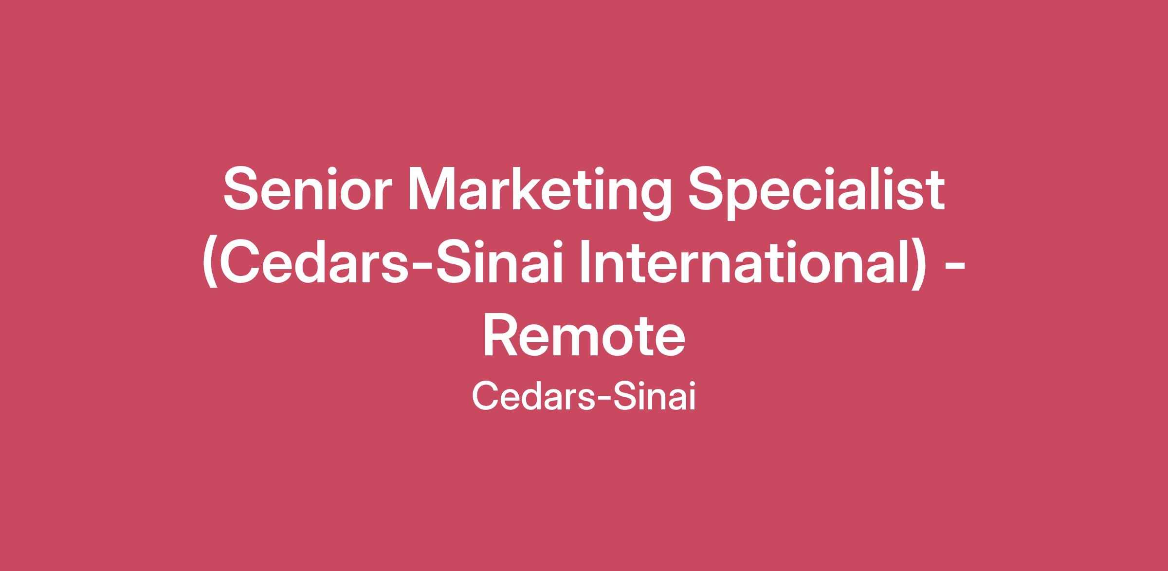 Grow your career at Cedars-Sinai! Cedars-Sinai Medical Center has been named to the Honor Roll in U.S. News & World Report’s “Best Hospitals 2025-2026” rankings. When you join our team, you’ll gain access to our groundbreaking biomedical research facilities and sophisticated medical education programs. We offer learning programs, tuition reimbursement and performance-improvement projects so you can achieve certifications and degrees while gaining the knowledge and experience needed to advance your career. Why work here? We provide groundbreaking and patient-centered care, and engage in balanced, impactful collaborations that raise the standard of healthcare around the world. Every year, thousands of patients from around the world receive treatment at Cedars-Sinai. We are proud to be ranked as one of the top medical centers in the U.S. and California. The Cedars-Sinai international team has depth of knowledge of different regions and cultures and is committed to bringing our excellence in healthcare to patients wherever they may be. What will you be doing: The Senior Marketing Specialist (International Marketing) contributes to the strategic direction and priorities that will help drive international marketing awareness and acquisition tactics for the organization, including but not limited to, geographic expansion efforts, partnership and acquisition messaging, advertising efforts and marketing partnerships in priority markets including Middle East, China, Mexico, United Kingdom, Ecuador, Singapore, and others. Partners with team members in developing and executing strategies, plans and tactics across priority markets to increase awareness and acquisition. Reviews and develops research and marketing insights to deepen understanding of international target audiences. Leads all aspects of international marketing partnerships and conference presence. Manages and leads the negotiation and implementation of international marketing partnerships and ensures that the sponsorships and conference presence are furthering institutional messaging objectives and goals. Oversees content strategy and creation of relevant messaging for international audiences’ across all channels. Coordinates the development of comprehensive, coordinated international marketing dashboards that include relevant metrics from all areas of marketing and communications. Manages and tracks marketing budget. Supervises day-to-day relationship with external vendors ensuring execution of scope of work, financial agreements and achieving agreed upon outcomes/results. *Approved Remote States: Arizona, California, Colorado, Florida, Georgia, Minnesota, Nevada, Oregon, Texas*