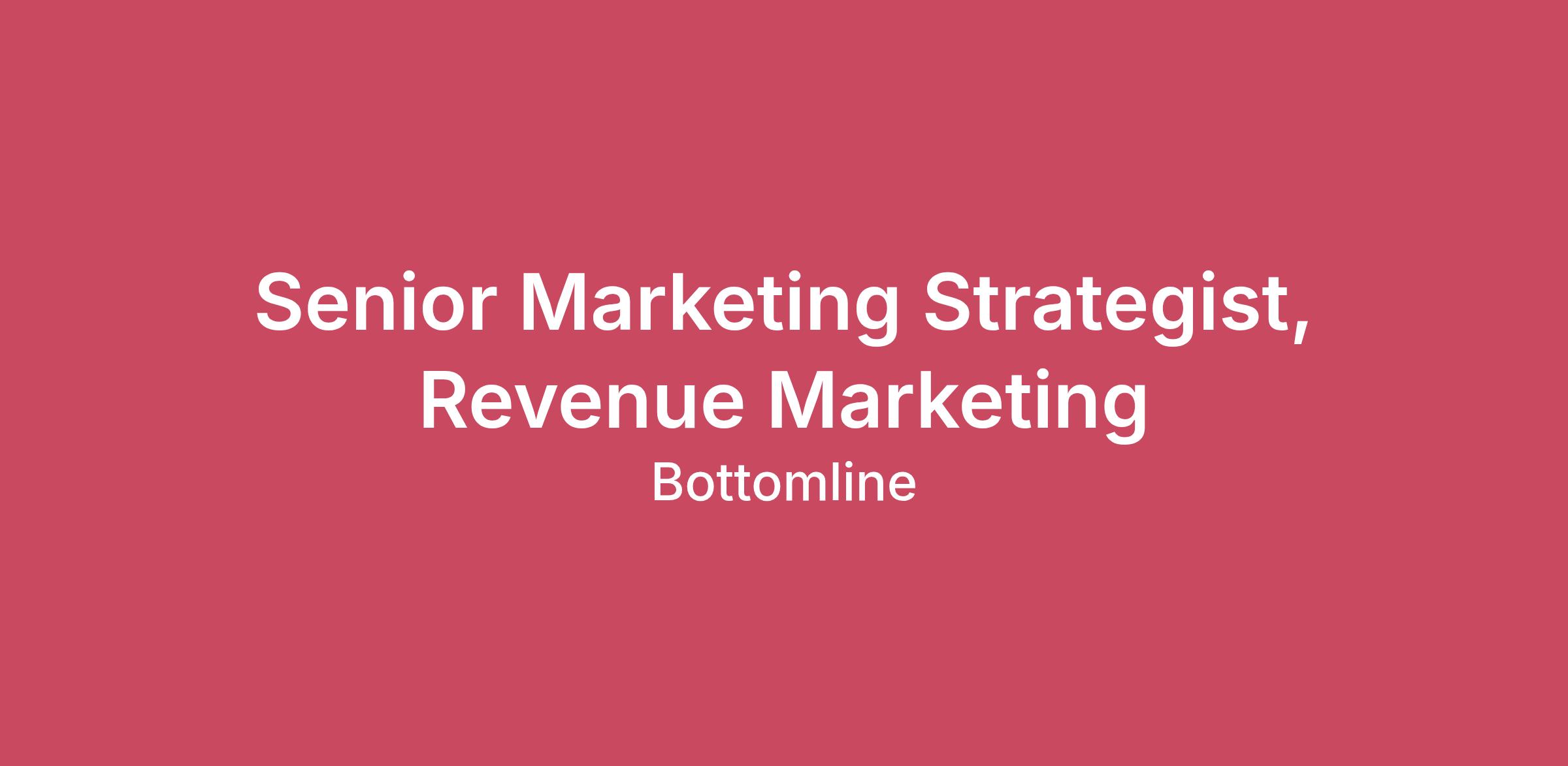 Why Choose Bottomline? Are you ready to transform the way businesses pay and get paid? Bottomline is a global leader in business payments and cash management, with over 35 years of experience and moving more than $16 trillion in payments annually. We're looking for passionate individuals to join our team and help drive impactful results for our customers. If you're dedicated to delighting customers and promoting growth and innovation - we want you on our team!The Role: As a Senior Marketing Strategist, Revenue Marketing, you’ll design and execute integrated marketing strategies that drive pipeline growth and accelerate revenue impact. You’ll optimize the buyer journey, align marketing initiatives with sales objectives, and deliver measurable business outcomes. This role combines strategic thinking with hands-on execution and thrives in a data-driven, results-oriented environment. Your success will be measured by pipeline contribution, campaign ROI, and conversion improvements across the funnel. While this position is remote, we have a preference for East Coast–based candidates to ensure optimal alignment with cross‑functional partners and team workflows. How you’ll contribute: Pipeline Impact – Your revenue marketing strategies will generate qualified pipeline and accelerate deal progression. Strategic Alignment – You’ll ensure marketing programs are tightly aligned with sales priorities, product positioning, and customer needs. Performance Optimization – You’ll continuously refine campaigns based on data insights to maximize ROI and conversion rates. How you’ll do it: Revenue Marketing Program Development: Build and execute demand generation, ABM, and lifecycle marketing programs that create measurable pipeline. Cross-Functional Collaboration: Partner with Sales, Product Marketing, and Customer Success to ensure marketing initiatives support revenue goals. Campaign Management: Oversee multi-channel campaigns (digital, events, content, email, paid media) with a focus on conversion and ROI. Data & Analytics: Leverage marketing automation and CRM tools to track performance, optimize campaigns, and report on pipeline contribution. Content Strategy: Develop messaging and content that resonates with target personas and accelerates deal progression. Budget & Resource Management: Allocate resources effectively to maximize impact and efficiency. Story Telling: Develop compelling narratives, backed by data, to gain alignment and buy-in from executive leadership and key stakeholders. Competitive Intelligence: Monitor market trends, competitor positioning, and industry shifts to ensure our strategy remains ahead of the curve. Analyst & Influencer Relations: Engage with industry analysts and key influencers to shape market perception, gather insights, and strengthen Bottomline's position in the market. Attributes, skills, and experience needed to be successful in this role: Proven ability to design marketing strategies that drive measurable revenue. Strategic thinker with a passion for data, customer insights, and long-term impact. Skilled storyteller who transforms complex data into compelling marketing narratives. Collaborative leader adept at building consensus and influencing across teams. Analytical and experienced in segmentation, market research, and data tools. Strong cross-functional experience with marketing, sales, and product teams. Proficient in CRM systems and marketing analytics platforms. What Makes You Successful in This Role: 7+ years in B2B marketing with a strong focus on revenue marketing, demand generation, or growth marketing. Expertise in marketing automation platforms (e.g., Pardot, Marketo, HubSpot), CRM systems (Salesforce), and analytics tools. Deep understanding of the buyer’s journey, funnel metrics, and pipeline acceleration strategies. Proficient in analyzing performance metrics and optimizing campaigns based on KPIs and actionable insights. Strategic thinker, data-driven decision maker, excellent communicator, and collaborative team player. #LI-KK1We welcome talent at all career stages and are dedicated to understanding and supporting additional needs. We're proud to be an equal opportunity employer, committed to creating an inclusive and open environment for everyone.