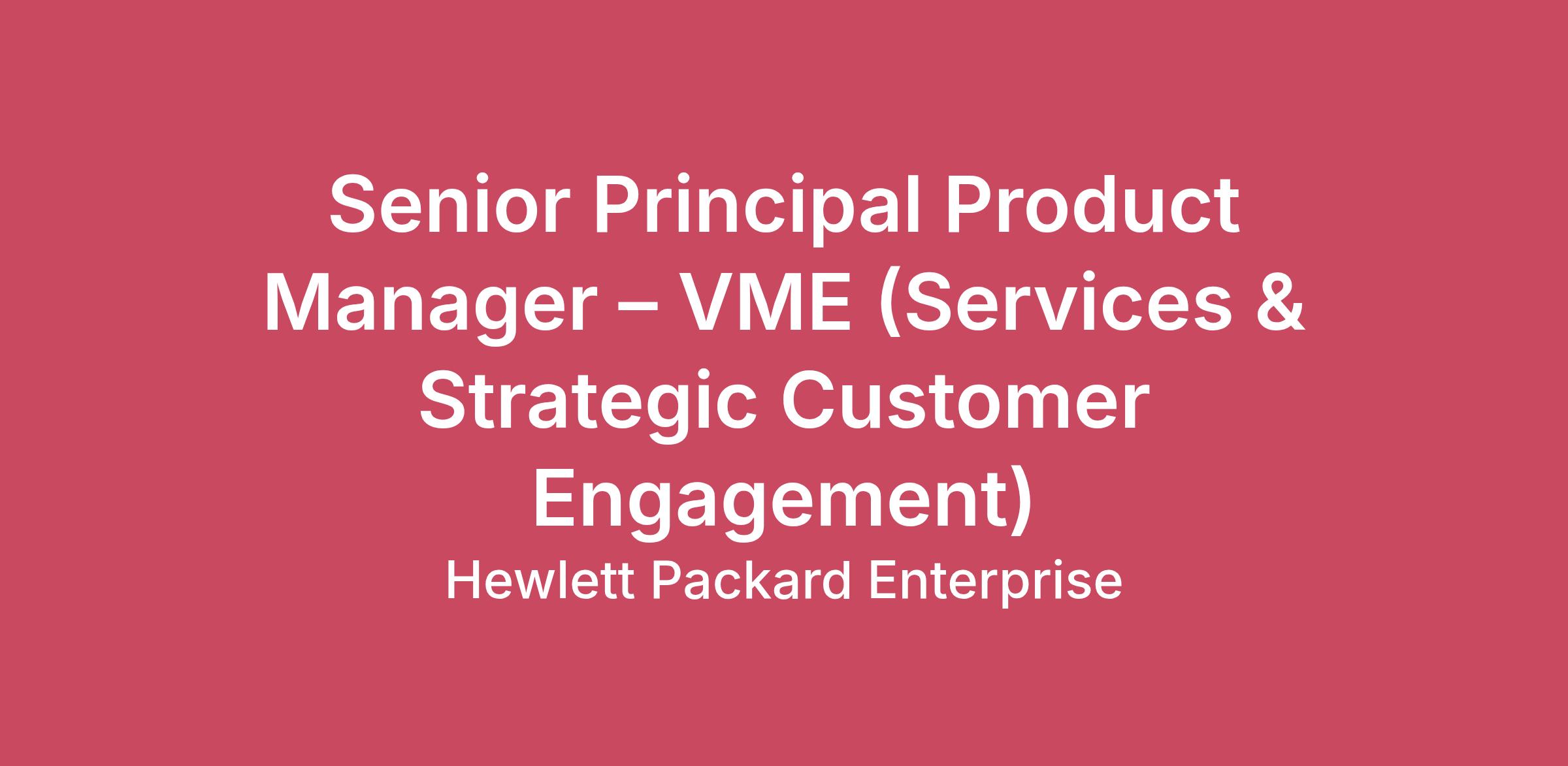 Senior Principal Product Manager – VME (Services & Strategic Customer Engagement) This role has been designed as ‘Hybrid’ with an expectation that you will work on average 2 days per week from an HPE office.Who We Are:Hewlett Packard Enterprise is the global edge-to-cloud company advancing the way people live and work. We help companies connect, protect, analyze, and act on their data and applications wherever they live, from edge to cloud, so they can turn insights into outcomes at the speed required to thrive in today’s complex world. Our culture thrives on finding new and better ways to accelerate what’s next. We know varied backgrounds are valued and succeed here. We have the flexibility to manage our work and personal needs. We make bold moves, together, and are a force for good. If you are looking to stretch and grow your career our culture will embrace you. Open up opportunities with HPE.Job Description: Product Services, Strategic Customer engagementThe Product Manager for VME Services is responsible for defining, evolving, and scaling VME service offerings while increasing the team’s bandwidth to effectively respond to customer and sales escalations. This role serves as a key product point of contact for strategic customers, working closely with sales, customer success, support, and engineering to address critical issues, shape service requirements, and ensure customer needs are reflected in the product roadmap. The PM translates real-world usage, escalation learnings, and strategic customer feedback into actionable service improvements that drive reliability, adoption, and long-term customer value.Management Level Definition:Contributions have substantial technical impact on a significant HPE product/project, or a strategic/architectural direction. Go-to creator and innovator for critical business challenges and opportunities. Substantial, unique contributions provide long-lasting, recurring benefits like time-to-market improvements, cost reductions, or satisfying future and current unmet customer needs. Recognized internal authority on key technology areas. Provides technical leadership to the business for significant project/program work. Leads and connects others across functions to unite around a common goal. Actively mentors others and contributes to the HPE technical community.Responsibilities:Independently leads and drives the end-to-end product strategy and operational product roadmap for many complex products or product portfolios.Create and articulates the value proposition, target customer segments and business cases, to bring innovative and disruptive products to market for multiple product portfolios with respect to the whole company product portfolio (i.e. Product configuration mix, Revenue/Margins, financials, market share).Synthesizes market requirements (MRD) into marketing/customer details through having intimate customer knowledge and business, financial, and industry market acumen.Actively engages across verticals or customer segment engagements.Drive innovative and futuristic approaches based on external market insights and feedback.Builds products from ideation to launch.Recommends and influences key stakeholders with data driven analysis on strategic priorities throughout all phases of the product lifecycle, encompassing planning, development, launch, management, and exit strategies.Creates and drives goal alignment and collaborates across one or more products' value chain partners to optimize margins and enable success of products per plans across the product lifecycle. (i.e. Engineering: product development; Supply Chain: SKUs, inventory; and Marketing: marketing and pricing strategies and Go to Market Plan and drives adoption).Acts as a leader, providing guidance and mentoring to less-experienced team members and influences them to build effective requirements and roadmaps.Education and Experience Required:Bachelor's degree or equivalent in computer science, engineering, or related field of study; MBA or advanced degree in computer science or engineering preferred.10+ years of work experience in related fieldTechnical understanding and knowledge of the relevant industry.Translation of technical requirements/functions into business value for the customer.Knowledge and Skills:Extensive team skills and ability to cross functionally drive/influence work through others.Ability to mentor and lead teams to achieve results for complex, ambiguous projects.Works cross-functionally to align with Go to Market, operations, and other functions.Extensive skills in cost efficient solution building, financial performance metric creation and analysisExtensive business acumen and knowledge of root cause analysis and problem detection.Communicates effectively and can tailor message to various audiences.Ability to engage with analysts and industry experts.Technical understanding and knowledge of the relevant industry and can provide product specific technical training to the team.#unitedstates #virtualizationplatforms #privatecloudarchitectures #compute #storage #networking #virtualizationcontainersAdditional Skills:Cross Domain Knowledge, Customer Engagement, Design Thinking, Development Fundamentals, DevOps, Go-to-Market Expertise, Partner Management, Product Lifecycle Management, Security-First Mindset, Strategic Pricing, Strategy Creation, User Experience (UX), Value Creation, Vendor ManagementWhat We Can Offer You:Health & WellbeingWe strive to provide our team members and their loved ones with a comprehensive suite of benefits that supports their physical, financial and emotional wellbeing.Personal & Professional DevelopmentWe also invest in your career because the better you are, the better we all are. We have specific programs catered to helping you reach any career goals you have — whether you want to become a knowledge expert in your field or apply your skills to another division.Unconditional InclusionWe are unconditionally inclusive in the way we 