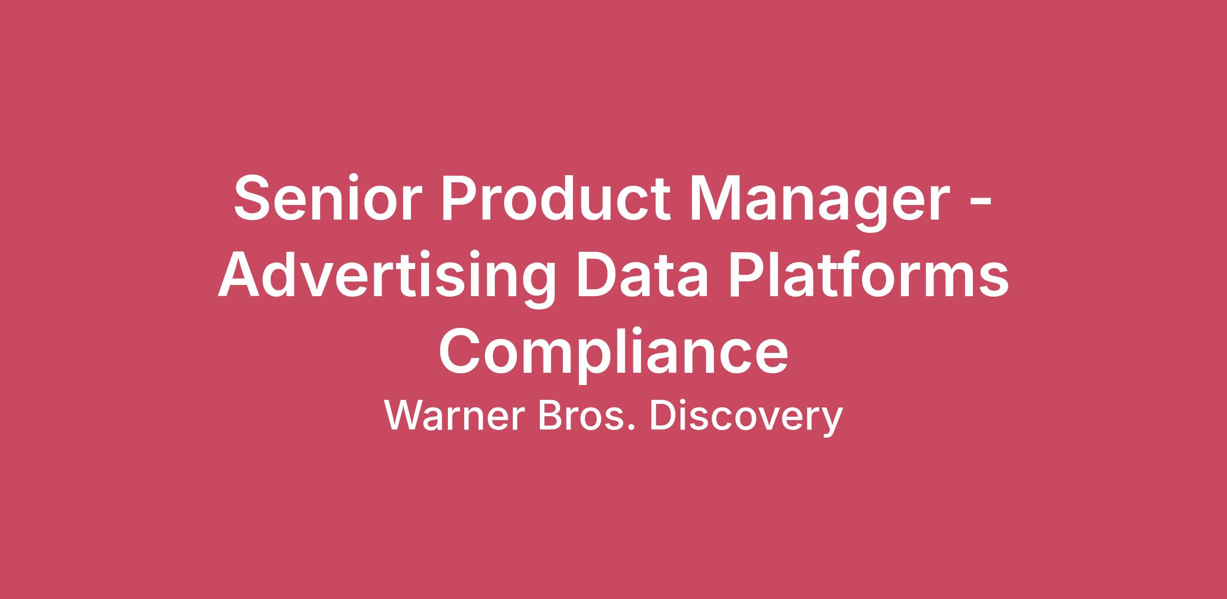 Welcome to Warner Bros. Discovery… the stuff dreams are made of.Who We Are… When we say, “the stuff dreams are made of,” we’re not just referring to the world of wizards, dragons and superheroes, or even to the wonders of Planet Earth. Behind WBD’s vast portfolio of iconic content and beloved brands, are the storytellers bringing our characters to life, the creators bringing them to your living rooms and the dreamers creating what’s next…From brilliant creatives, to technology trailblazers, across the globe, WBD offers career defining opportunities, thoughtfully curated benefits, and the tools to explore and grow into your best selves. Here you are supported, here you are celebrated, here you can thrive.At HBO Max, storytelling takes center stage. We’re one of the world’s most iconic entertainment brands — home to bold originals and unforgettable characters. While audiences binge award-winning content, breaking news, and sports around the clock, our teams stay busy at work creating what’s next in streaming. From Succession, Euphoria, and The Sopranos to global franchises like Game of Thrones and Harry Potter, our content sparks conversation and shapes culture.HBO Max delivers boundary-pushing stories across genres and platforms, connecting millions of viewers across 90 countries globally— and we’re just getting started. We're home to the most talked about shows and movies, granting audiences access to the worlds of HBO, Harry Potter, DC, Warner Bros., ID, Adult Swim, A24, and more. Turn your streaming obsession into a career— we’re hiring!Your New Role...We are looking for a passionate and driven Senior Product Manager to join the DTC Data Product Compliance team. In this role, you will report to the Sr. Director of Privacy, Data Product Compliance. You will be working cross-functionally within the Product & Design organization across multiple product verticals: engineering, legal, data science, and analytics with a focus on privacy-preserving advertising platforms and technical frameworks. You will be defining scalable solutions that integrate across WBD’s DTC platforms supporting a wide range of advertising partners, internal stakeholders, and data use cases. You will be motivated to dive deep into the rapidly evolving tech landscape, rapidly changing regulatory environment, and legal nuances across multiple global regions where we operate.We value product management that drives with discipline and attention to detail. You’re a good fit for this role if you are customer obsessed, collaborative, and data driven. You are a highly effective communicator and can build trust with all areas of the business. You must be comfortable regularly engaging with executive leadership to effectively communicate governance and compliance requirements and secure alignment on product roadmap priorities. You can work autonomously, have strong organizational and analytical skills, and are a proven collaborator and problem solver.Your Role Accountabilities...Partner with engineering and advertising teams to design and ship scalable, standardized, privacy-preserving solutions that operate within clean room and signal-restricted environments, delivering products that meet the needs of advertisers, agencies, third-party measurement vendors, and other ad tech providers.Provide product expertise and thought leadership in the areas of backend data compliance and privacy, with an understanding of how regulations and partner requirements impact and influence use of data across various business processes and functions.Gather, define, and clearly document data use cases through partnership with stakeholders, including Data Platform Engineering, Data Science (ML/AI), Advertising, Marketing, Analytics, Experimentation, Research, Fraud & Abuse.Operate well in the face of ambiguity and imperfect knowledge, drill into business data and research results to identify clear direction and focus.Stay informed on the latest industry trends, emerging technologies, and advancements in data handling to assess their impact on maintaining compliance and their potential for novel privacy solutions.Cultivate and maintain strong relationships with key stakeholders across the business to enable customer focused features with a “privacy by design” approach.Promote a culture of privacy awareness and compliance throughout the organization.Build healthy, trusting relationships and contribute to a culture of respect by giving feedback respectfully, exchanging ideas openly, and receiving feedback humbly. Qualifications & Experience...5+ years of backend/platform Product Management experience within a technology or digital organization.2+ years of experience with technical frameworks in the digital ads ecosystem.Strong knowledge of privacy and compliance for consumer data used in the advertising space.Built and delivered a roadmap for data clean room and ads measurement product by evaluating build vs. buy options.Has experience collaborating with data clean room providers, ad measurement providers, advertisers, and agencies.Proficiency with analyzing technical architecture diagrams and creating data flows.Experience partnering with technical teams on highly complex projects.Commitment to fostering an inclusive team culture built on empathy.Excellent written and verbal communication skills, with a focus on documentation that communicates complex subject matter simply and clearly.Proven ability to partner effectively with stakeholders across legal, product, and engineering functions.Excellent problem solving, critical thinking, and analytical skills.Detail-oriented; self-starter, accountable, and empowered.Curiosity and a willingness to learn.How We Get Things Done…This last bit is probably the most important! Here at WBD, our guiding principles are the core values by which we operate and are central to how we get things done. You can find them at www.wbd.com/guiding-principles/ along with some insights f