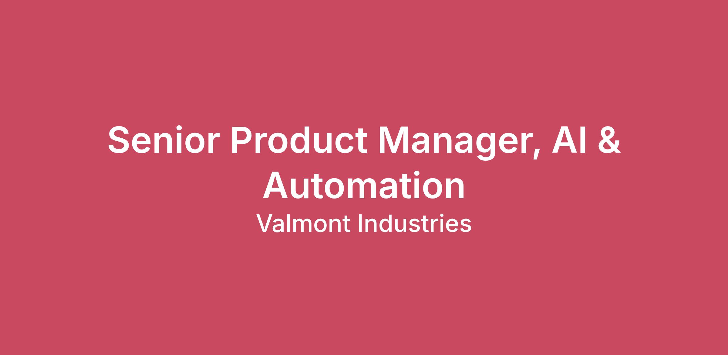 15000 Valmont Plaza Omaha Nebraska 68154Why Valmont We’re Here to Move the World Forward.Valmont impacts millions of people around the world every day, yet they might not realize the many ways. Our technology is helping feed the growing population, supplying the world with more reliable energy and access to renewables, enhancing connectivity in remote and urban locations to create a sustainable future and so much more. Simply put, Valmont is advancing agricultural productivity and reimagining vital infrastructure to make life better. Join a Fortune 1000 company that respects hard work, honors diversity and invests in our employees as we focus on creating the world of tomorrow, today. We are the modern workforce. Are you ready to move the world forward? Apply now.A Brief Summary of This Position: Valmont is seeking a highly motivated, execution‑driven Senior Product Manager to drive AI and automation initiatives that transform core workflows across the enterprise. This role is designed for a strategic, technically fluent product manager who excels in fast‑paced environments, partners effectively across business units, and delivers measurable outcomes through AI‑enabled solutions. The Senior Product Manager will identify high‑value use cases, shape product strategy and roadmaps, and guide engineering teams to quickly deliver enterprise‑ready solutions that drive efficiency, accuracy, and data‑driven decision‑making across the business. This role is a key accelerator in Valmont’s digital transformation, converting strategy into scalable, secure, and adopted solutions.Essential Functions: Lead end‑to‑end discovery for AI and automation opportunities, including workflow analysis, problem framing, and value sizing.Facilitate ideation with functional leaders to uncover friction points and identify scalable AI use cases.Evaluate opportunities based on impact, feasibility, risk, and organizational readiness; maintain a portfolio‑level view aligned to strategy.Translate business needs into product requirements, success metrics, and solution specifications.Partner with engineers to design, prototype, and iterate AI agents, automation flows, and decision‑support tools.Oversee implementation from design through testing, rollout, and support; manage cross‑functional dependencies and risks.Define clear KPIs and ROI for each initiative; instrument solutions to measure performance and impact.Drive adoption via change‑management, enablement, and communications; track usage and satisfaction.Conduct post‑deployment reviews to validate impact and identify continuous improvement opportunities.Serve as a thought partner on AI and automation capabilities; educate stakeholders on emerging opportunities and limits.Communicate scope, progress, and results to leadership through structured updates and presentations.This role reports to the Director of AI Products & Automation.Required Qualifications of Every Candidate: 3–5 years of product management experience, ideally in data, digital transformation, internal tools, or AI/automation domains.Demonstrated experience defining and launching technology solutionsAbility to decompose complex problems and translate them into actionable product requirements and success metrics.Strong analytical skills; experience sizing value and evaluating ROI.Proven ability to influence stakeholders and drive outcomes in matrixed organizations.Familiarity with AI concepts, automation platforms, or data‑driven decision frameworks.Experience with agile methodologies and iterative delivery.Bachelor's degree in business, Engineering, Computer Science, with 8+ years' experience or Associates with 10+ years' experience or 11+ years of experienceHighly Qualified Candidates Will Also Possess These Qualifications:Experience with Microsoft 365 and Power Platform (Power Automate, Power Apps), Copilot for M365, and Teams integrations.Understanding of AI agent frameworks, LLM behaviors, API‑driven orchestration, and/or RPA tools.Background in business process improvement, consulting, or operational excellence.Ability to prototype solutions or create mockups for stakeholder alignment.Experience leading change‑management and enablement to drive adoption.BenefitsValmont offers employees and their families a comprehensive Total Wellbeing benefit package to ensure their individual and family’s overall wellness needs are met. Some offerings are dependent upon the role, work schedule, or location and can include the following:Healthcare (medical, prescription drugs, dental and vision)401k retirement plan with company matchPaid time offEmployer paid life insuranceEmployer paid short-term and long-term disability including maternity leaveWork Life SupportTuition Reimbursement up to $5,250 per yearVoluntary programs like tobacco cessation, Type 2 diabetes reversal, one-on-one health coaching, mortgage services and moreValmont does not discriminate against any employee or applicant in employment opportunities or practices on the basis of race, color, religion, sex, sexual orientation, gender identity, national origin, age, genetic information, veteran status, disability or any other characteristic protected by law. Reasonable accommodation may be made to enable individuals with disabilities to perform the essential functions.If you have a disability and require any assistance in filling out the application for employment email EEOCompliance@Valmont.com.