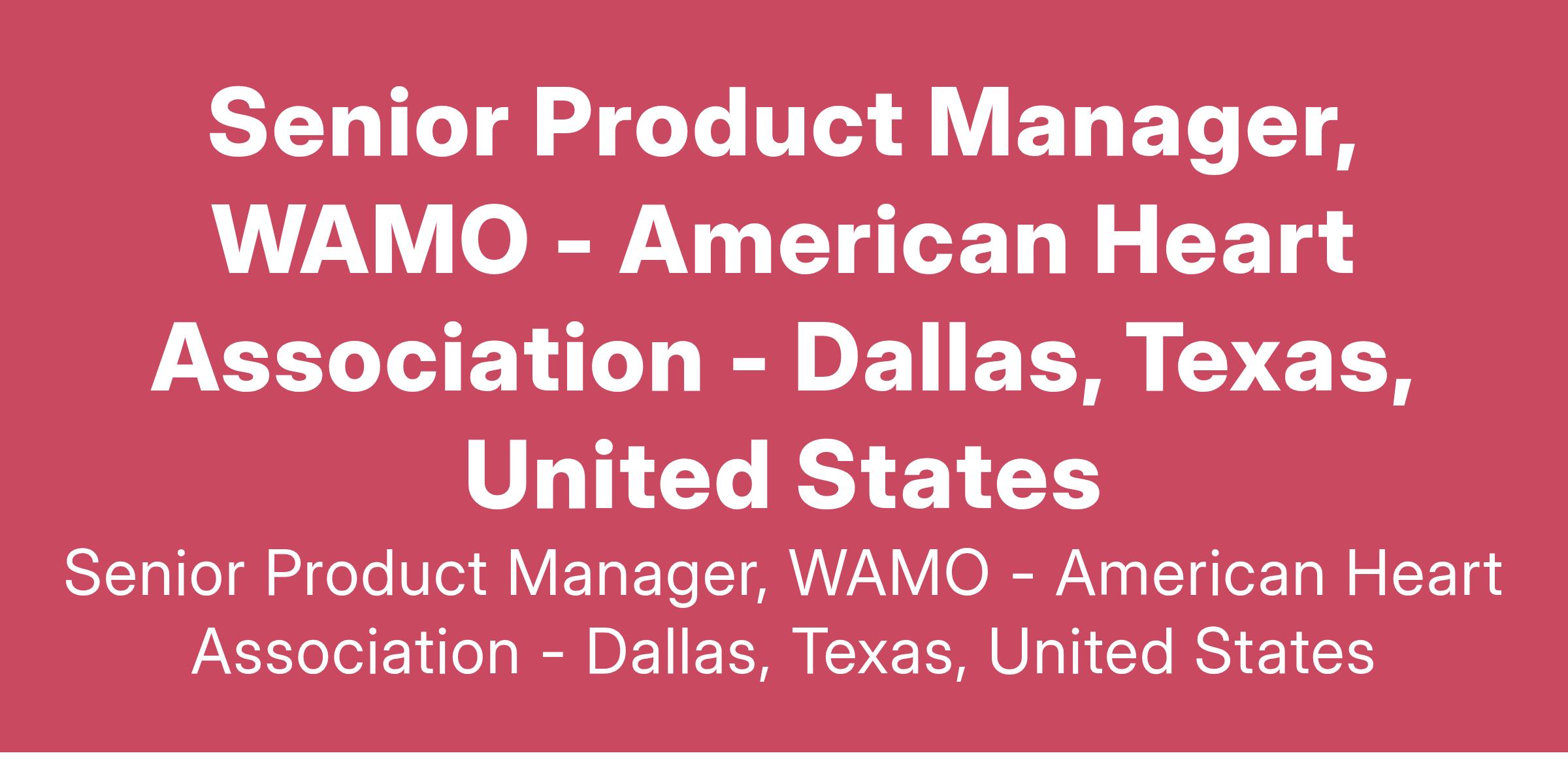 The Sr. Product Manager for the Workflow and Asset Management Optimization (WAMO) platform will collaborate closely with the Vice President of Business Solutions, various stakeholders, individual contributors across multiple American Heart Association business units, teams in Business Technology, and our implementation partners (vendors). This role will be responsible for providing strategic direction and acting as an evangelist for the WAMO platform, which comprises integrated SaaS applications including Workfront, Bynder, JumpSeat, and RequestHub.