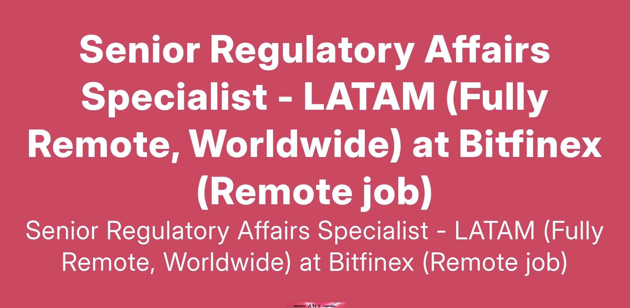 Senior Regulatory Affairs Specialist - LATAM (Fully Remote, Worldwide) at Bitfinex (Remote job)
